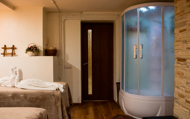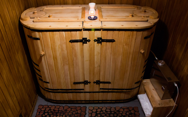 - распаривание в финской сауне (хаммаме), кедровой бочке или инфракрасной кабине с ингаляцией (мята, эвкалипт, пихта) — 20 минут