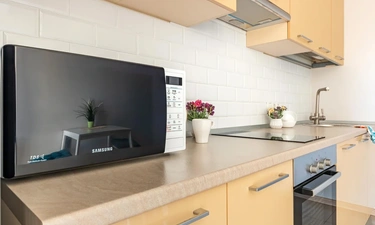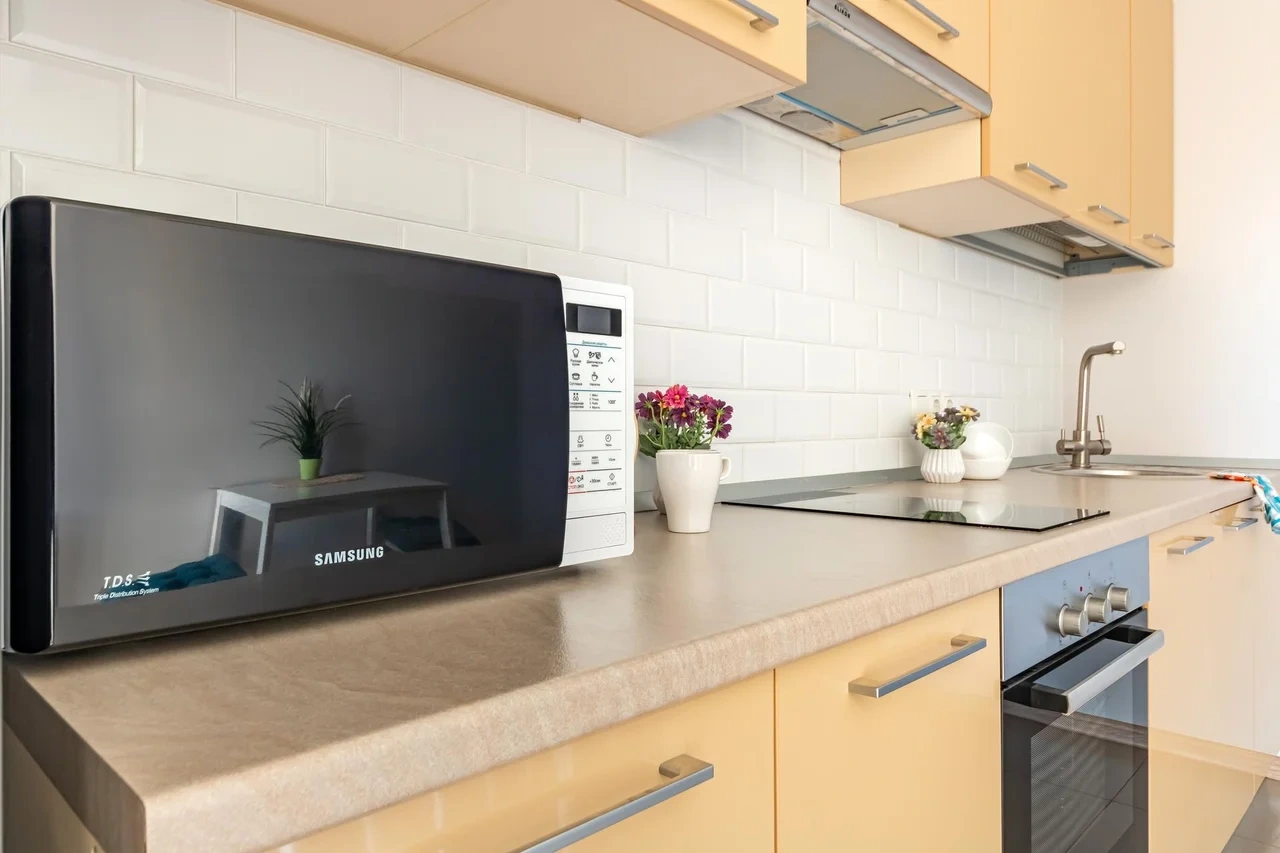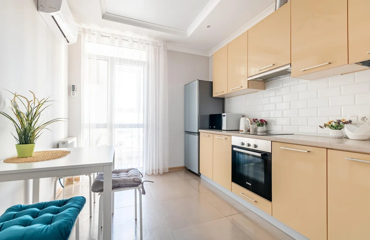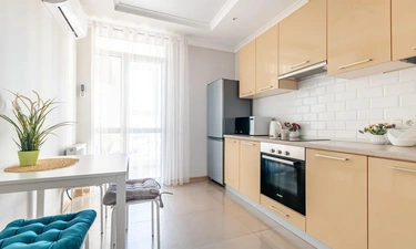 Для Вашего комфортного пребывания в квартире есть все необходимое - кухня оснащена техникой, эл.плита, микроволновая печь, чайник, для приготовления и приема пищи есть необходимая посуда, столовая посуда и чайный сервиз. Панорамный вид из окна кухни позволяет встречать утро с солнечными лучами за чашечкой кофе.