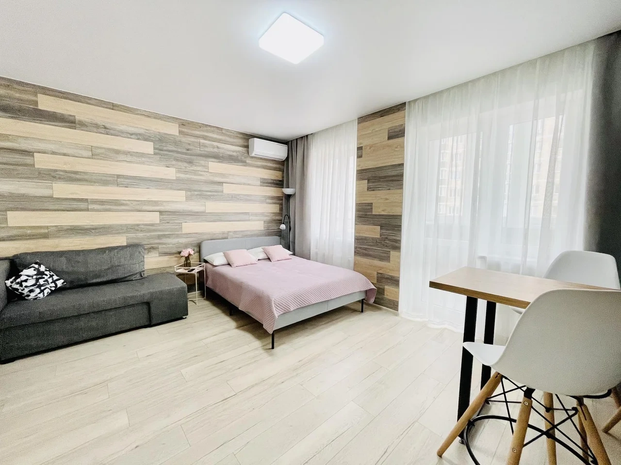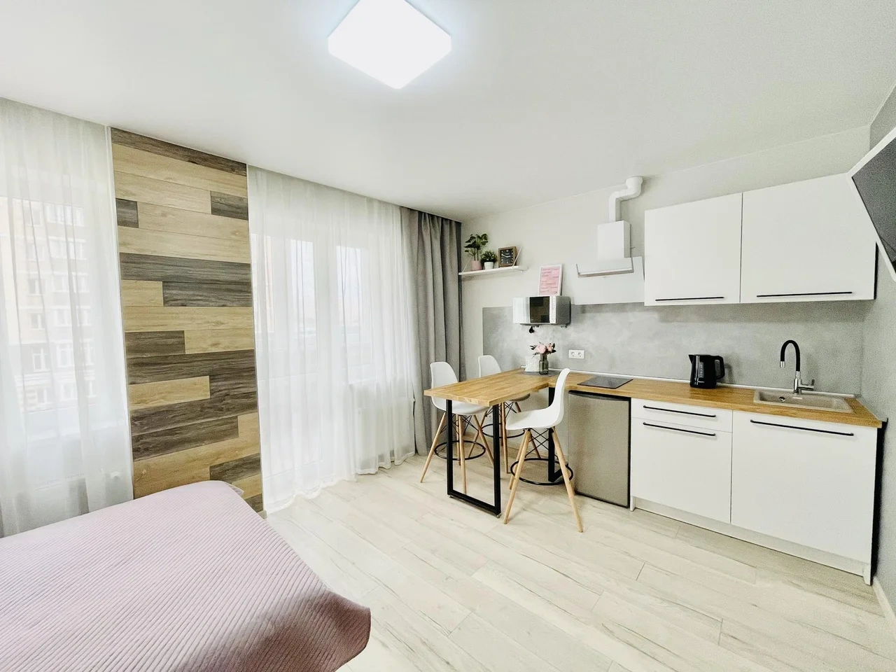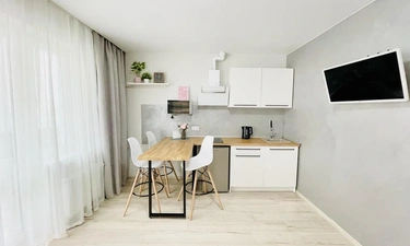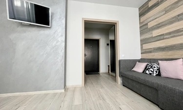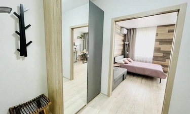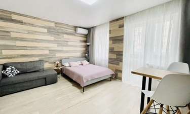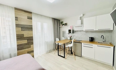 Апартаменты выполнены в студийном стиле: спальня + кухня+ гостиная с большим телевизором и функцией Smаtr ТV + высокоскоростной WI-FI 100 Мb.