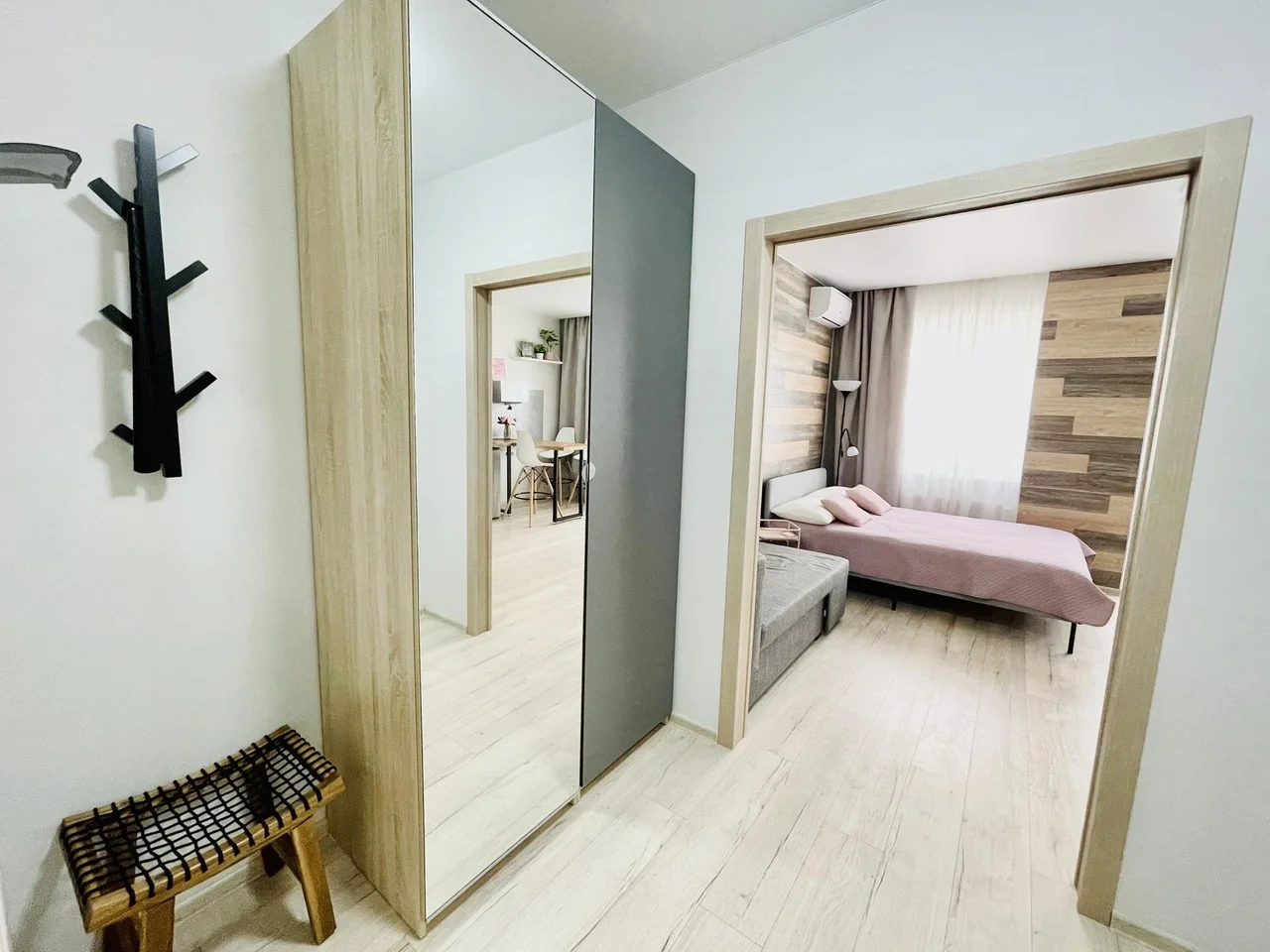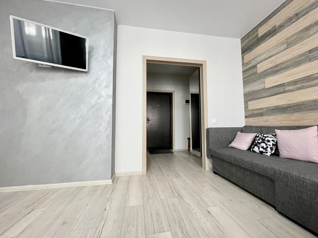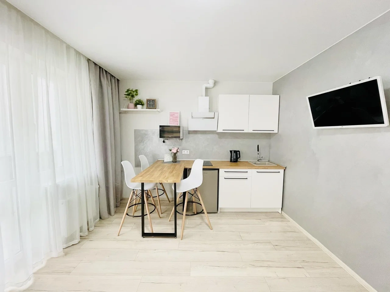 Апартаменты выполнены в студийном стиле: спальня + кухня+ гостиная с большим телевизором и функцией Smаtr ТV + высокоскоростной WI-FI 100 Мb.