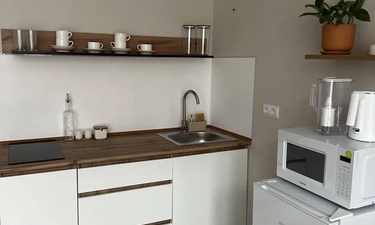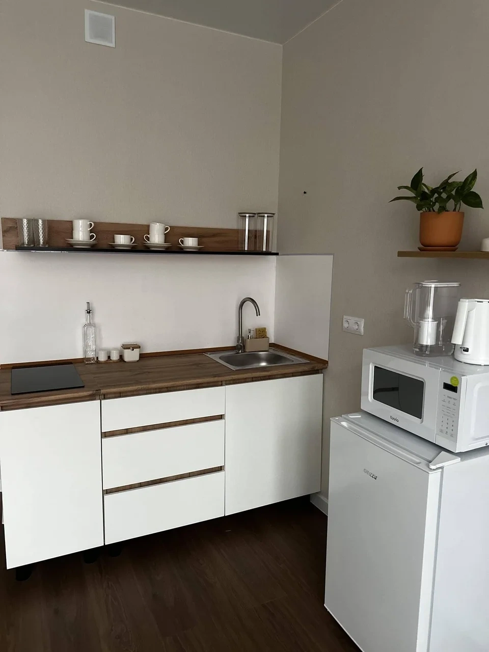 - Полностью оборудованная кухня (холодильник, варочная панель, чайник, микроволновка, посуда)