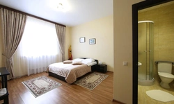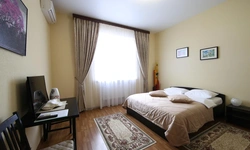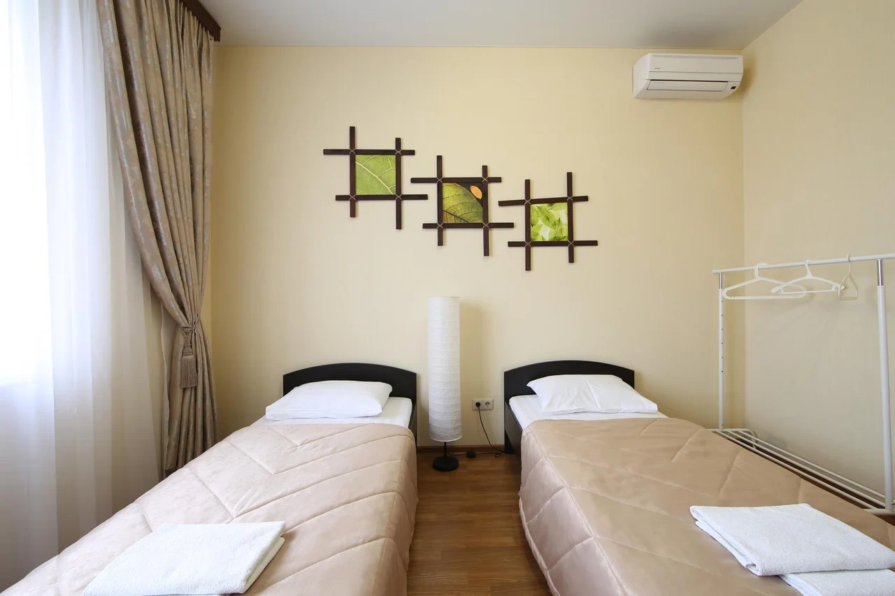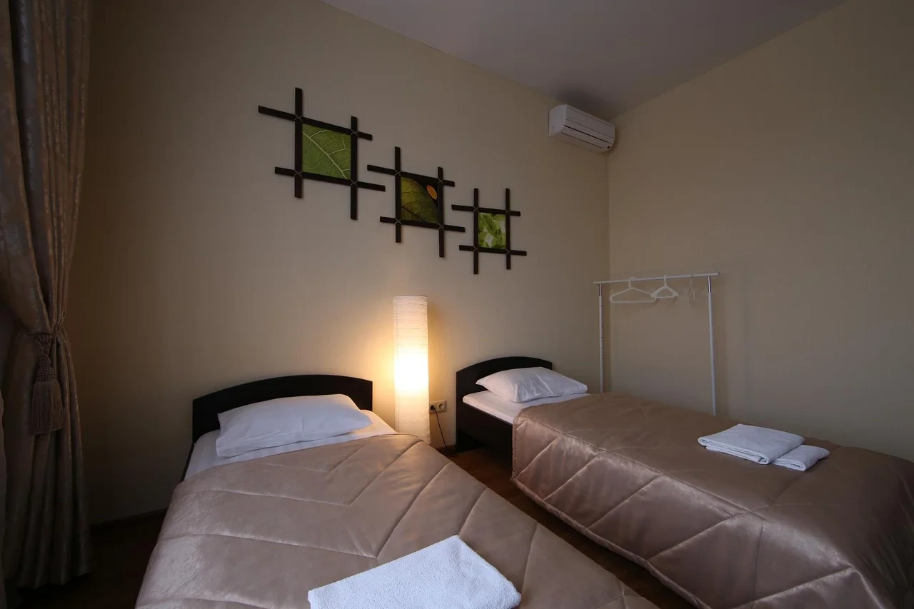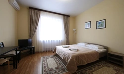 Двухместный номер в классическом стиле. В номере собственный совмещенный санузел с душевой кабиной. Номер оборудован двухспальной кроватью, прикроватными тумбочками, столом, стульями, вешалкой для вещей, светильником для чтения, кондиционером. В номере имеется ЖК-телевизор со спутниковыми каналами. Кухня общая, на 1-м этаже. Есть все необходимое:мебель, посуда, техника, принадлежности.