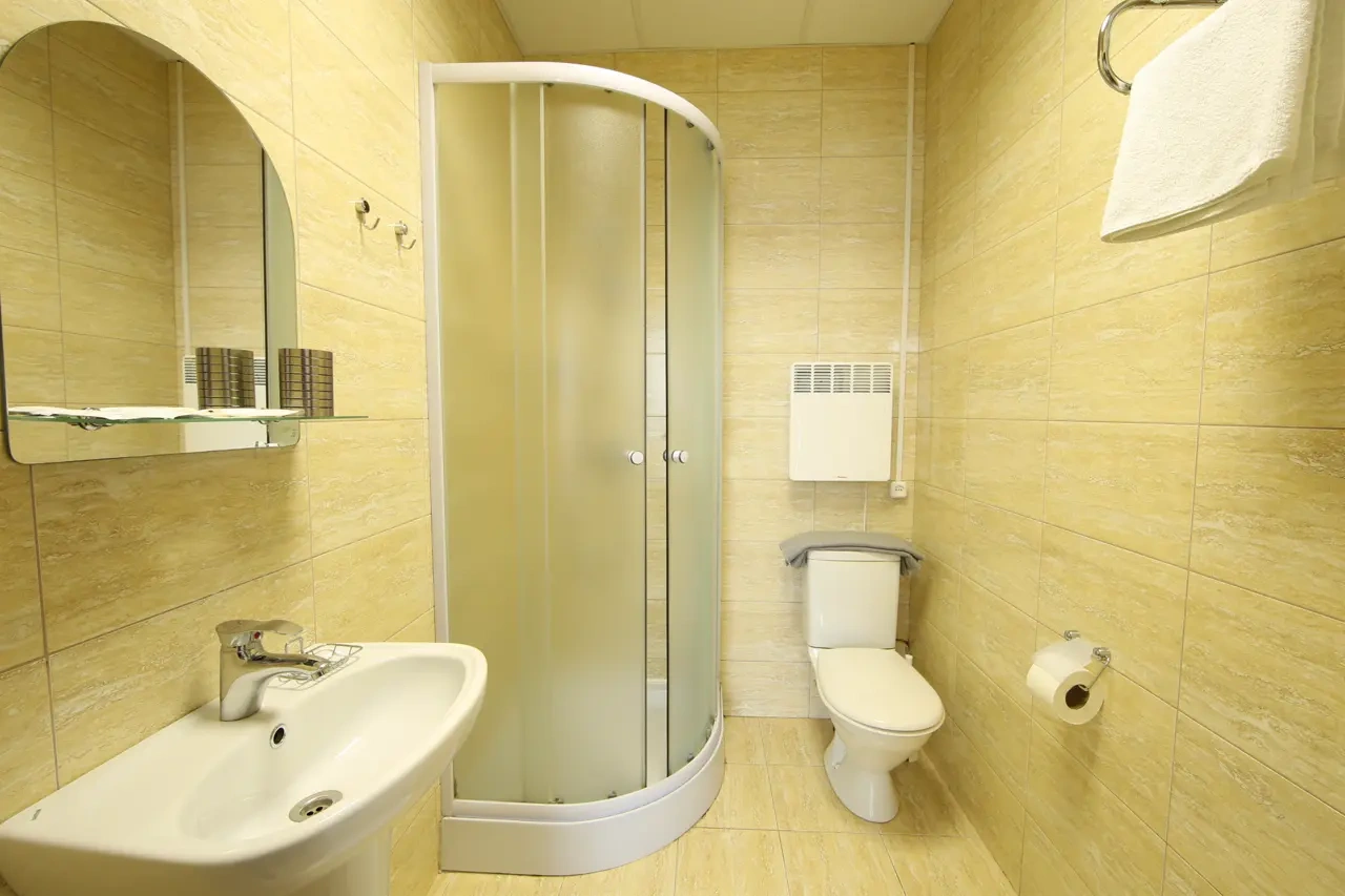 Двухместный номер оформлен в классическом стиле. Двухспальная кровать размера XXL, прикроватные тумбочки, стол, стулья, вешалка-гардероб для вещей, телевизор со спутниковыми каналами, кондиционер. В номере собственный совмещенный санузел с душевой кабиной.