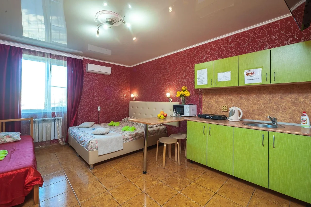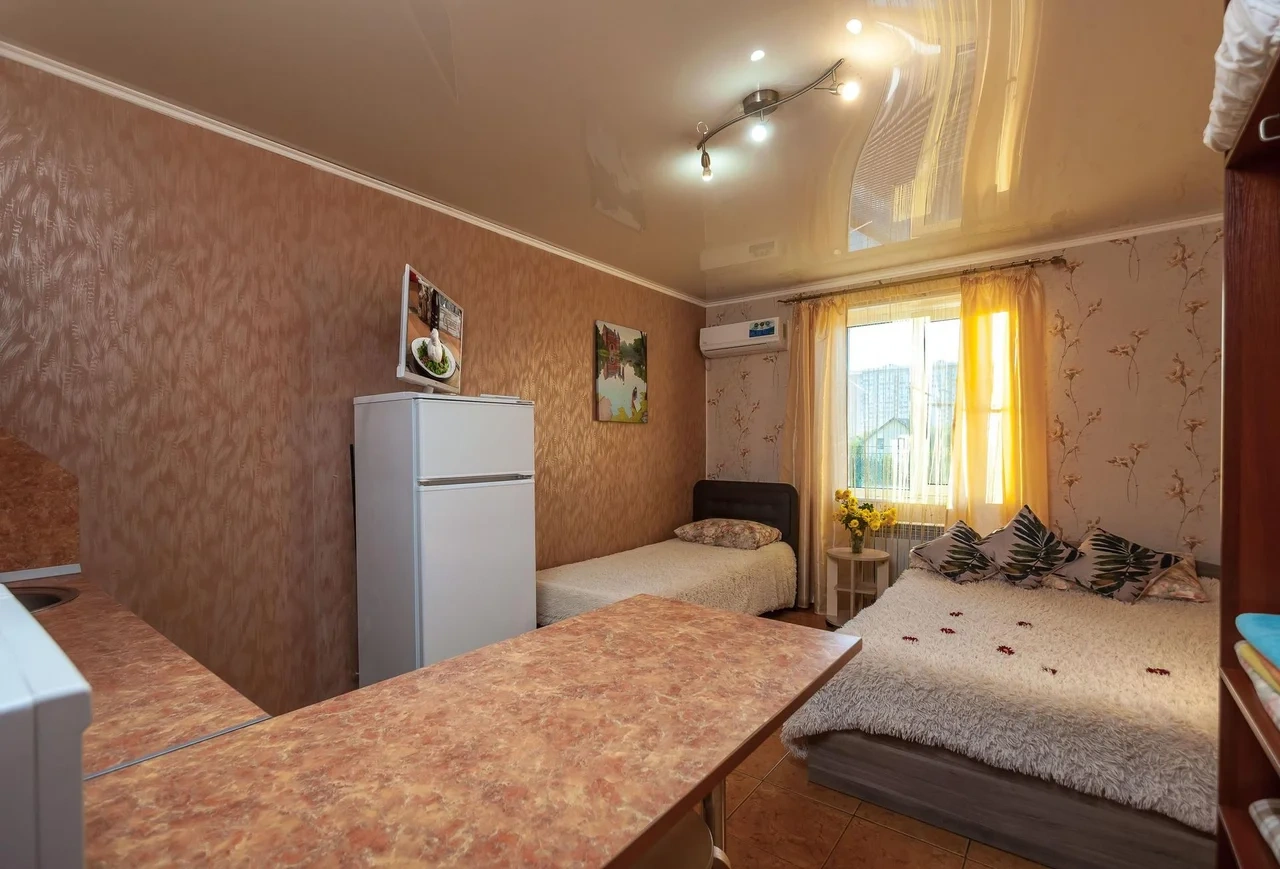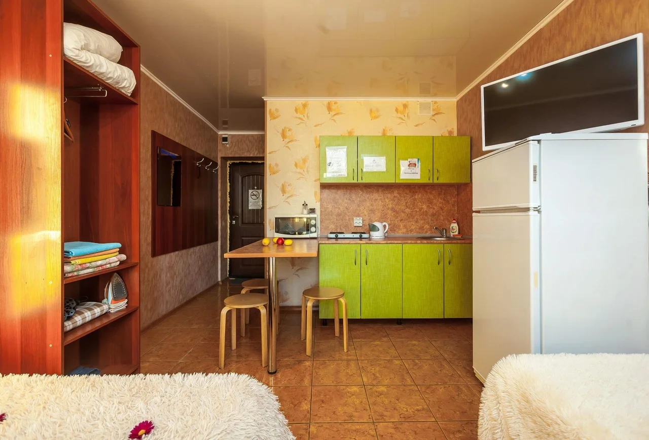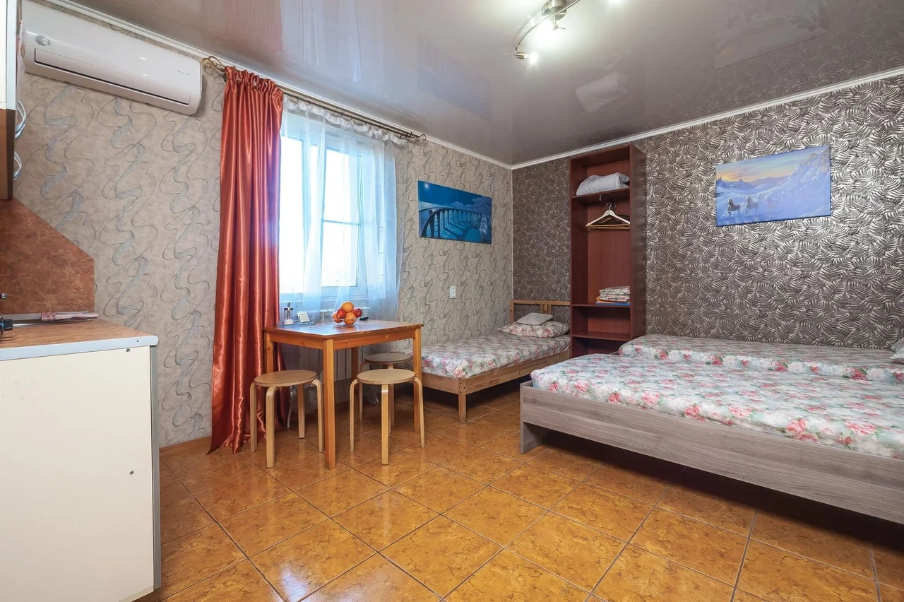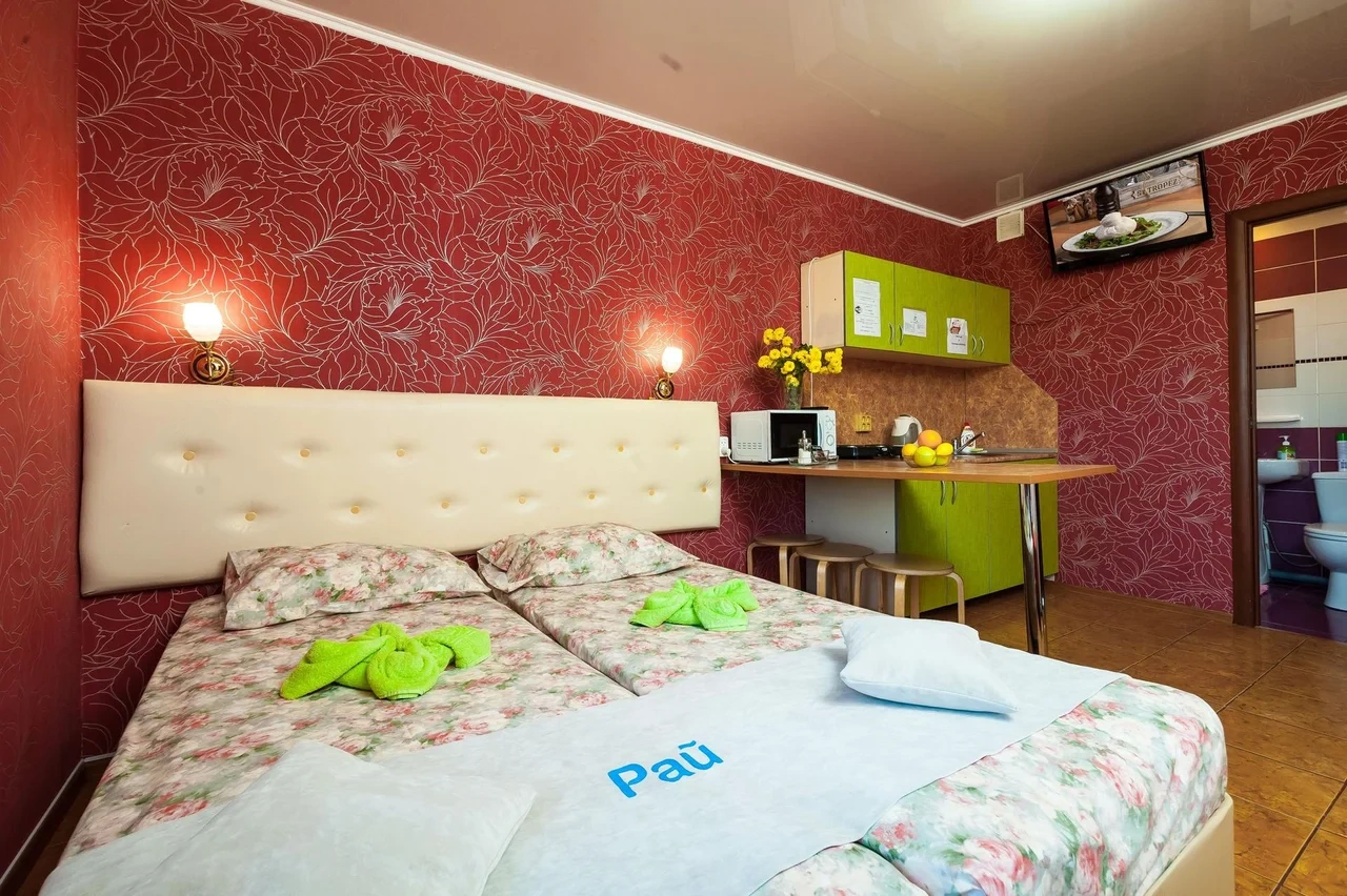 Номер-студия для ЧЕТЫРЕХМЕСТНОГО размещения. Полностью оборудован для комфортного проживания, душ и сан узел в номере, ортопедические матрасы подарят хороший сон, КОНДИЦИОНЕР спасет от южного зноя, собственная оборудованная кухня в номере избавит от необходимости искать места общественного питания. LED телевизор поможет скоротать время, wI-fI поможет оставаться всегда на связи. Бронируйте!