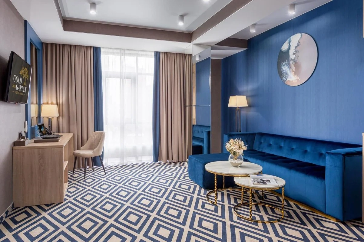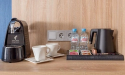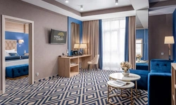 Двухкомнатные номера люкс восхищают элегантным дизайном просторной зоны гостиной и спальни. В одной из комнат есть современная ванная с джакузи, в другой - дополнительно размещена удобная душевая. В номерах люкс помимо всех элементов оснащения дополнительно установлена кофе-машина.