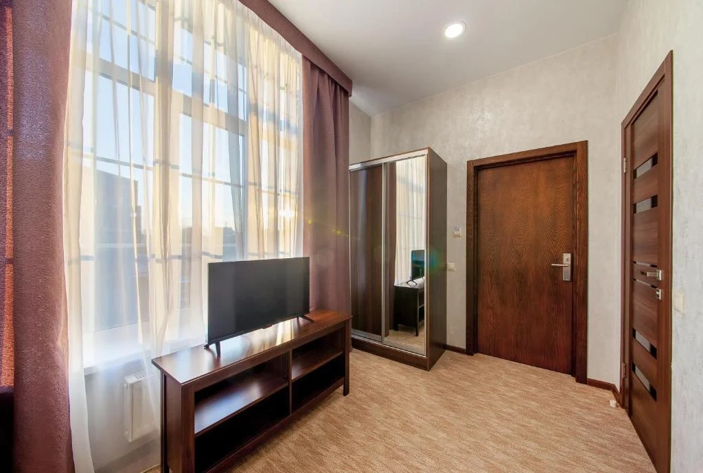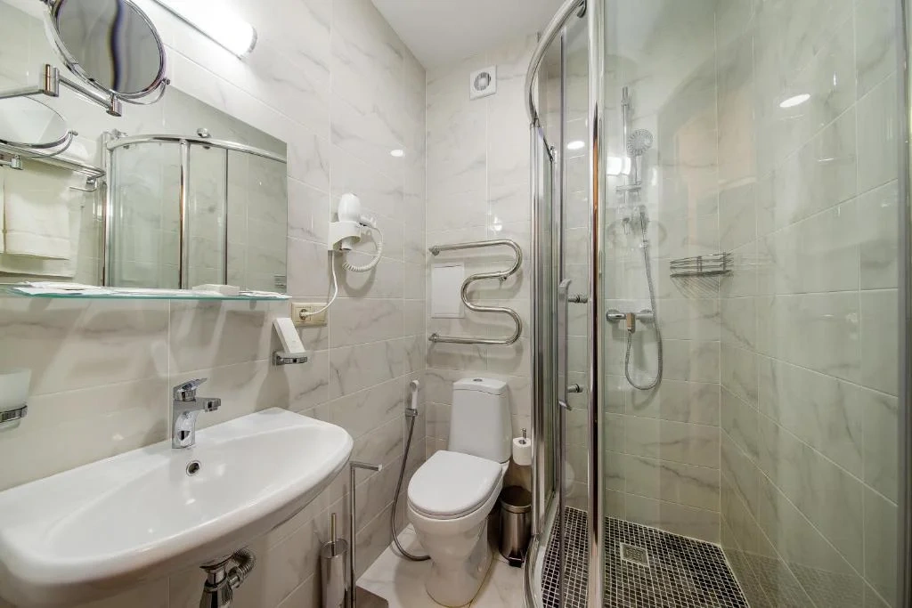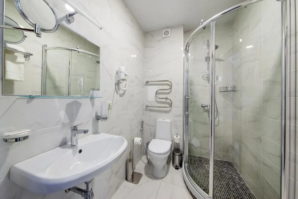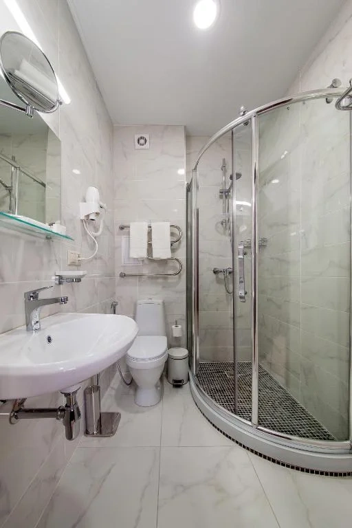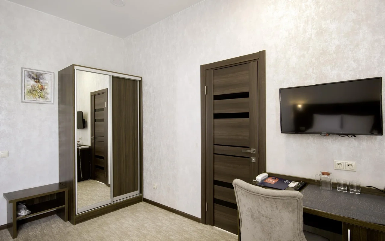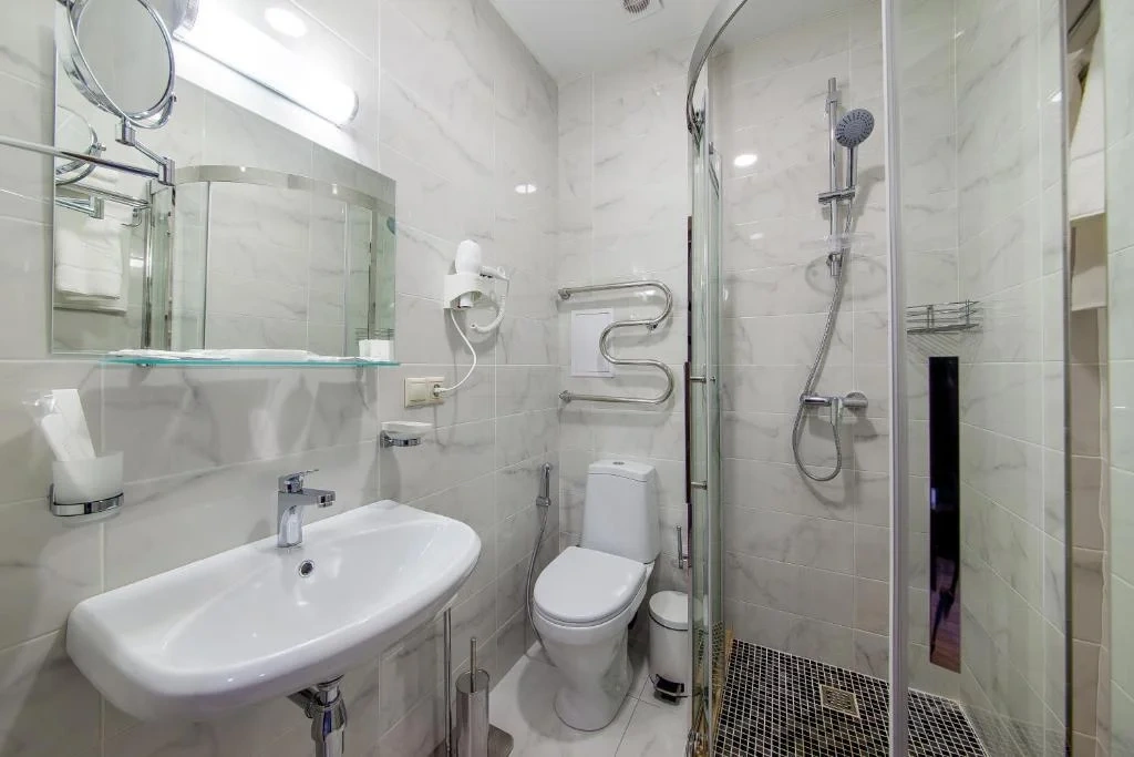 Хороший чистый номер с хорошей сантехникой. Есть гигиенический душ. Уборка в номере и смена полотенец каждый день. Кровать твердовата, но нам было удобно. Несмотря на то, что в отеле всего 4 этажа - в нем есть лифт. Рядом 2 пятерочки, магнит, 3 аптеки. Придраться не к чему.