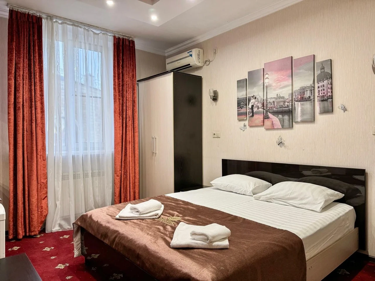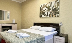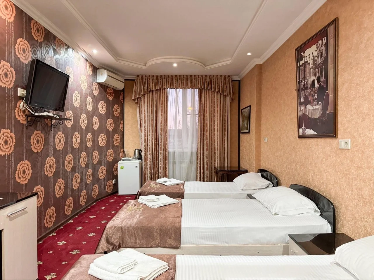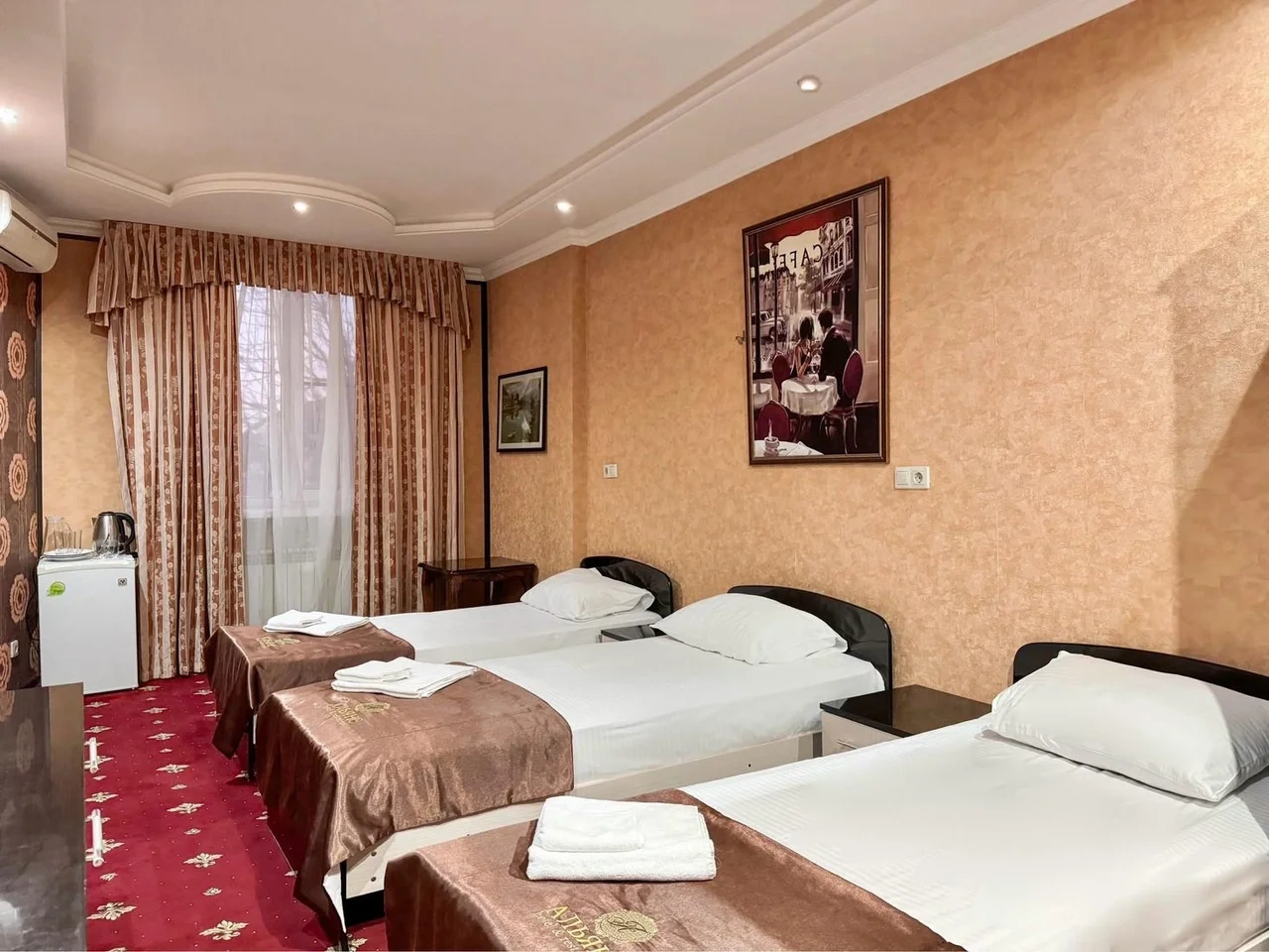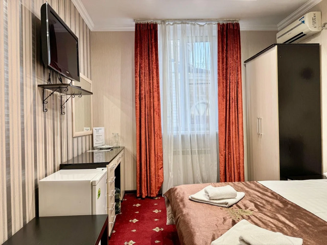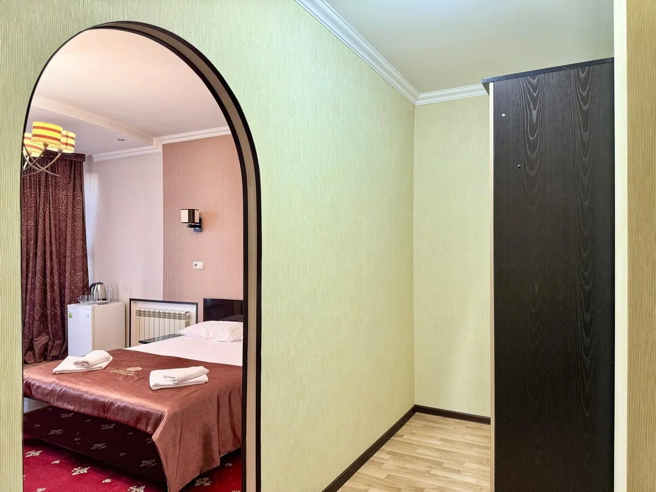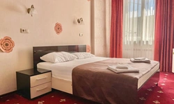 В номере воняет куревом! Вечером внизу (хозяева видимо) жарят шашлык и запах этого шашлыка вместе с дымом в номере. Мебель вся уставшая. Кровать для супружеского долга вообще не подходит, так как если на ней что то делать, то будет слышать все три этажа отеля. Матрац убитый. В санузле стоит джакузи и объявление что она не работает, но это полбеды. Воды в номере нет вообще, она просто идёт тонкой струечкой. Но это ещё тоже ладно, подмыться ещё хоть как то можно. Но как стоять в этой ванной вообще не понятно, так как у джакузи пол не ровный, нужно стоять, точнее сидеть в уголке ванной возле крана, так как вода не идёт совсем. Короче это не гостиница, а недоразумение. Слышимость в гостинице тоже нормальная. Заехали ночью люди всю ночь ругались, орали, но им даже никто не сделал замечание потому что вся администрация спит. Остановиться можно только если едешь на юг на одну ночь и то если не сильно вспотел, так как мыться и спать тут невозможно!!!