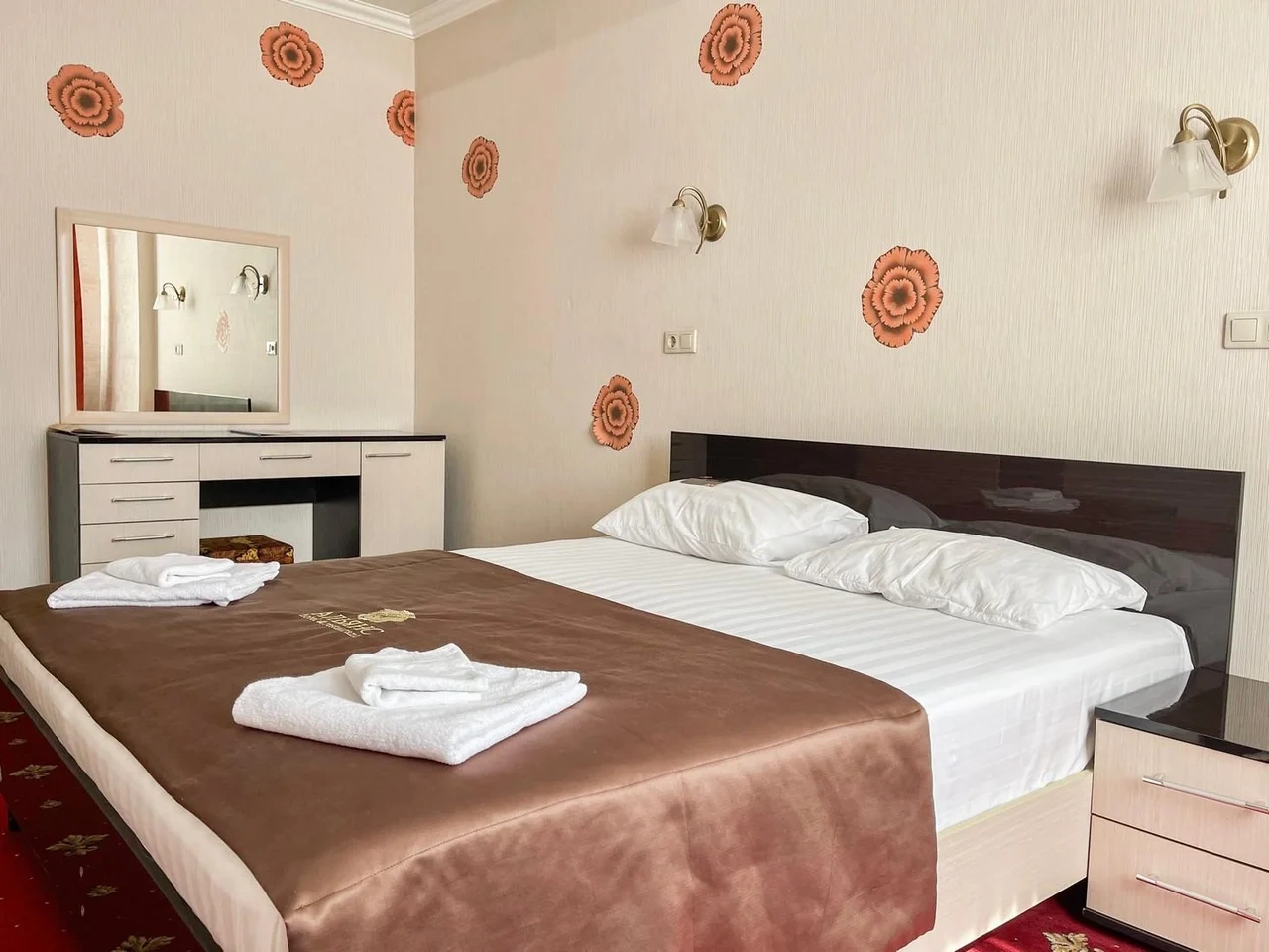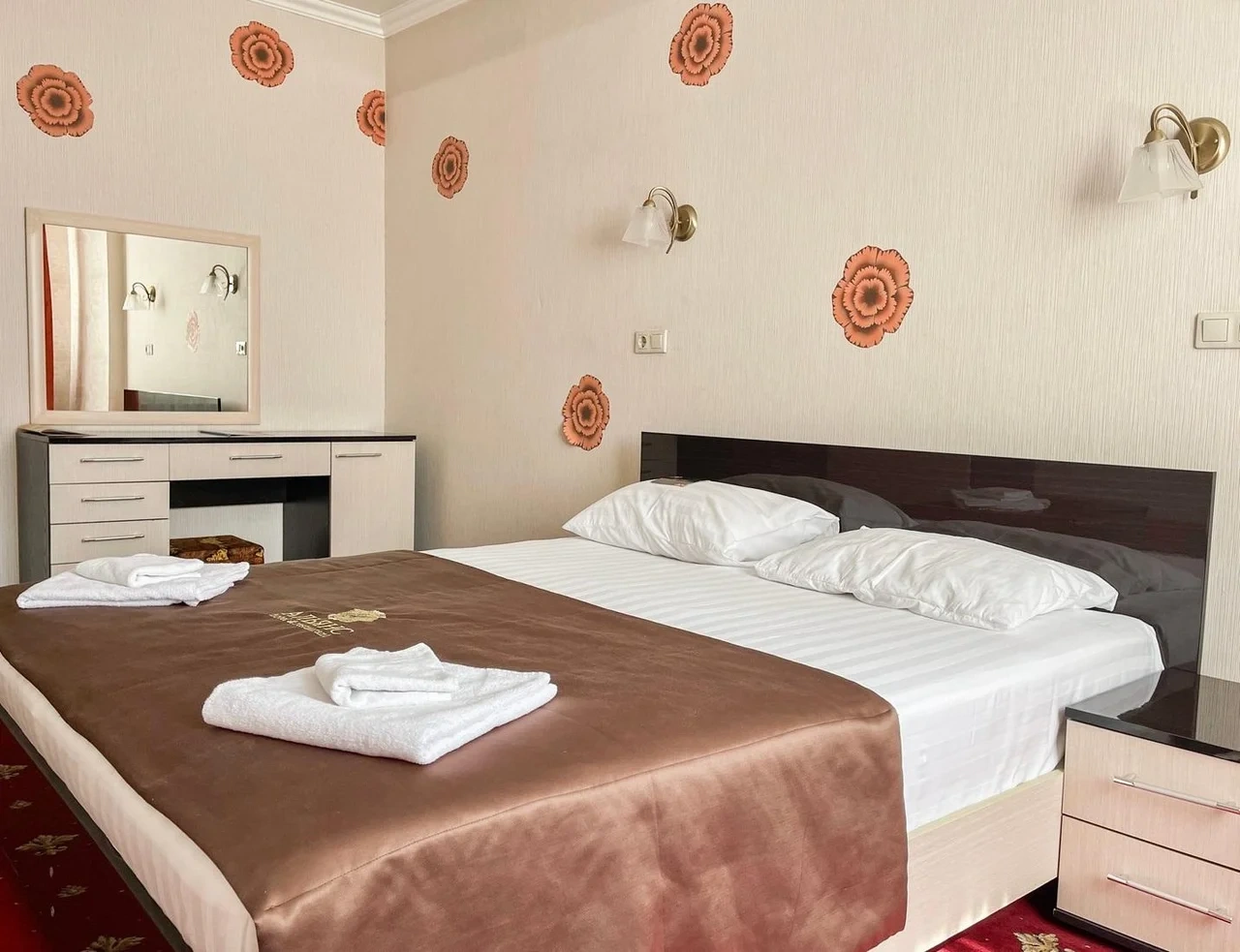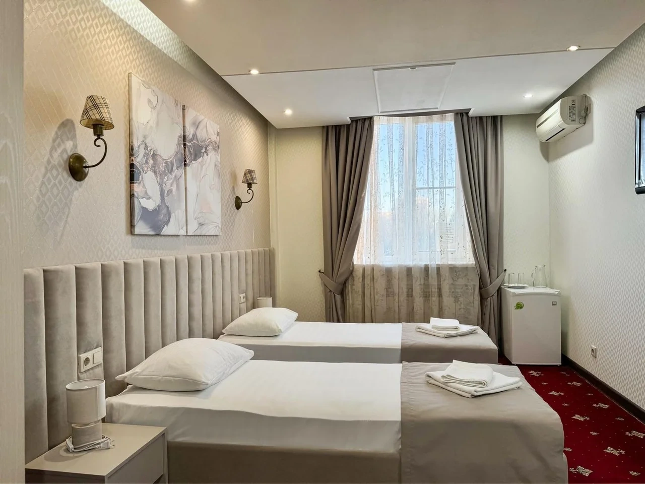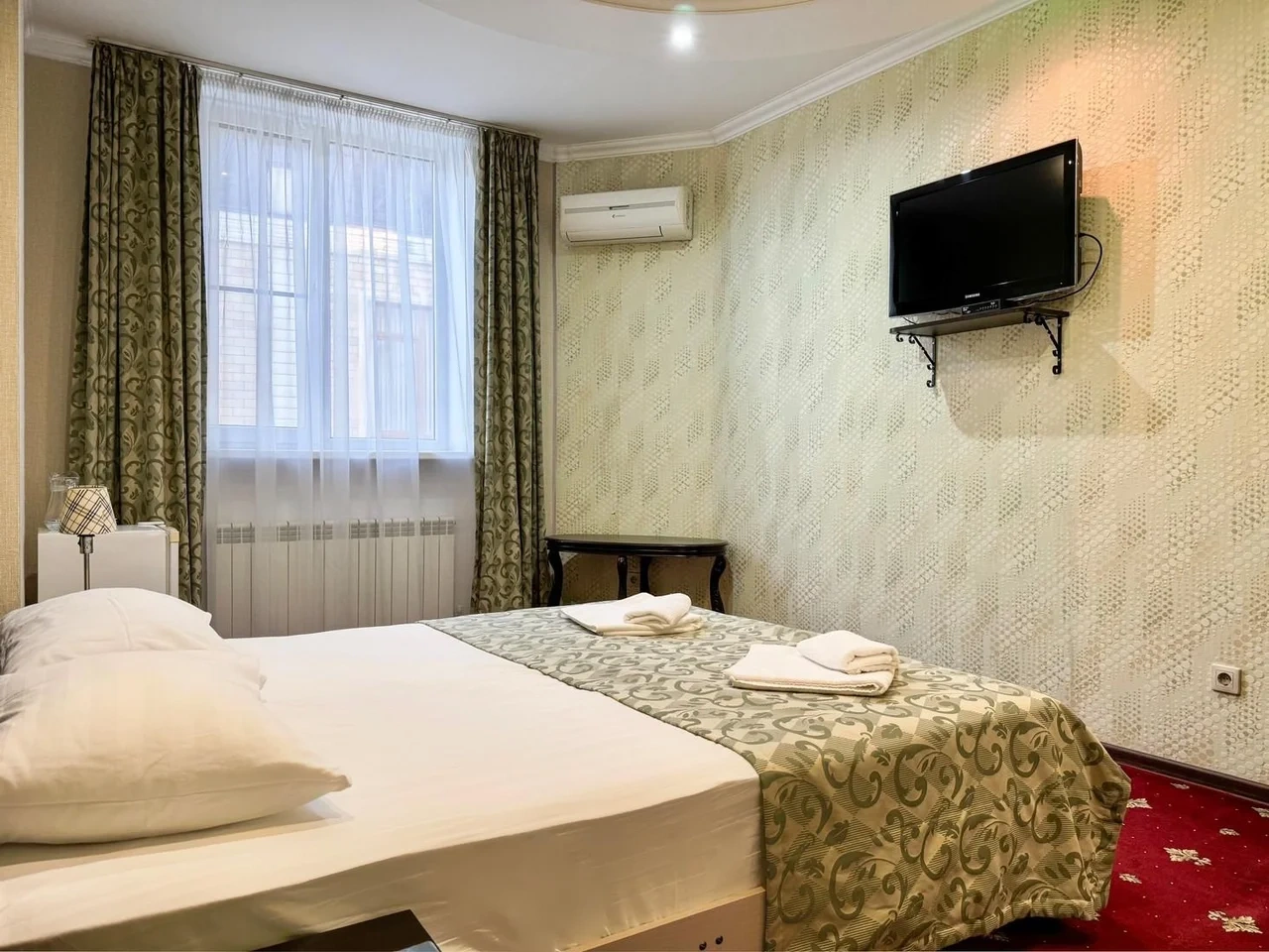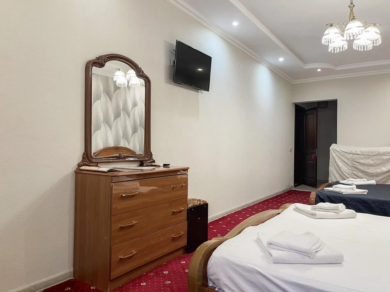 В номере воняет куревом! Вечером внизу (хозяева видимо) жарят шашлык и запах этого шашлыка вместе с дымом в номере. Мебель вся уставшая. Кровать для супружеского долга вообще не подходит, так как если на ней что то делать, то будет слышать все три этажа отеля. Матрац убитый. В санузле стоит джакузи и объявление что она не работает, но это полбеды. Воды в номере нет вообще, она просто идёт тонкой струечкой. Но это ещё тоже ладно, подмыться ещё хоть как то можно. Но как стоять в этой ванной вообще не понятно, так как у джакузи пол не ровный, нужно стоять, точнее сидеть в уголке ванной возле крана, так как вода не идёт совсем. Короче это не гостиница, а недоразумение. Слышимость в гостинице тоже нормальная. Заехали ночью люди всю ночь ругались, орали, но им даже никто не сделал замечание потому что вся администрация спит. Остановиться можно только если едешь на юг на одну ночь и то если не сильно вспотел, так как мыться и спать тут невозможно!!!