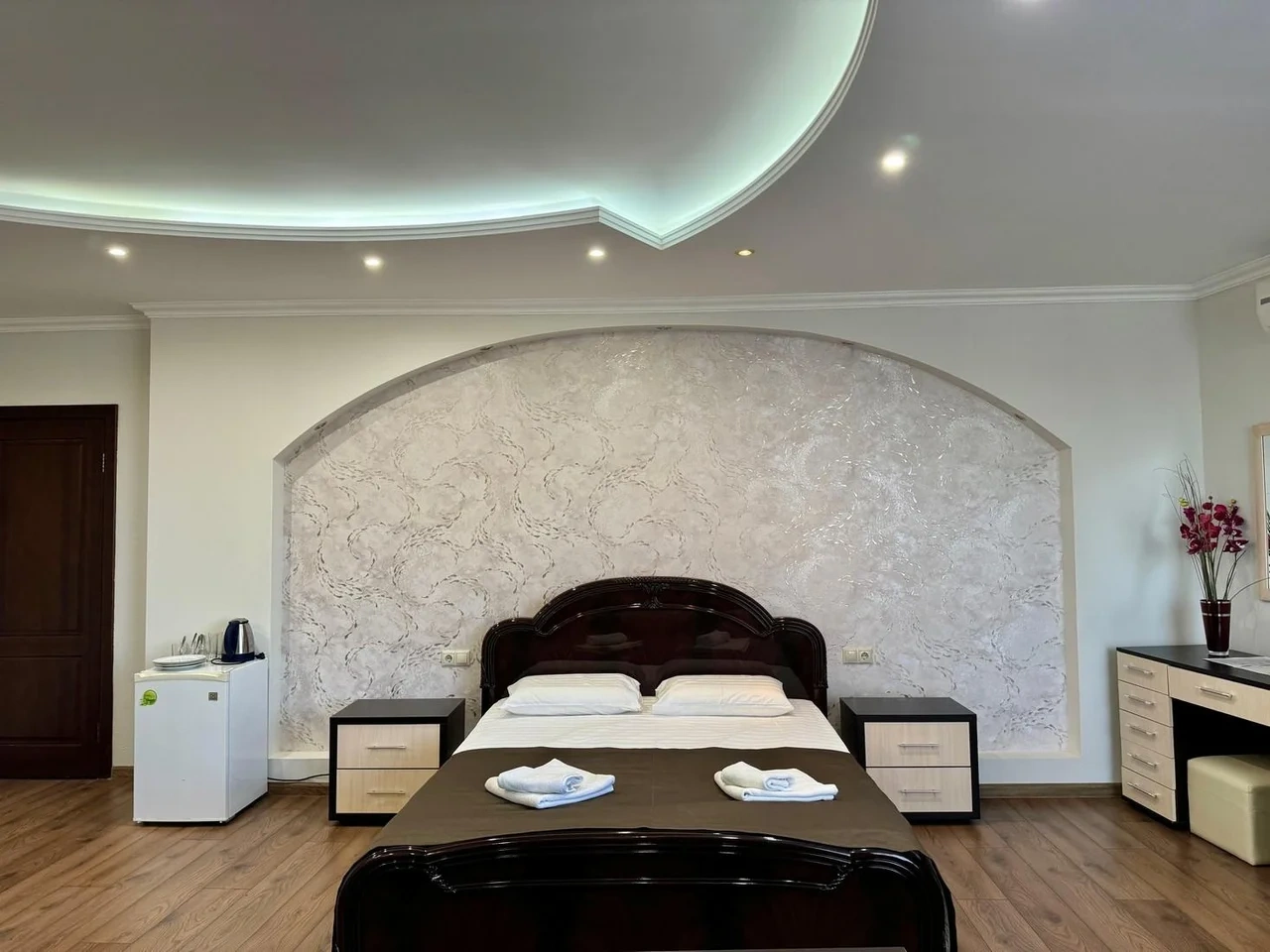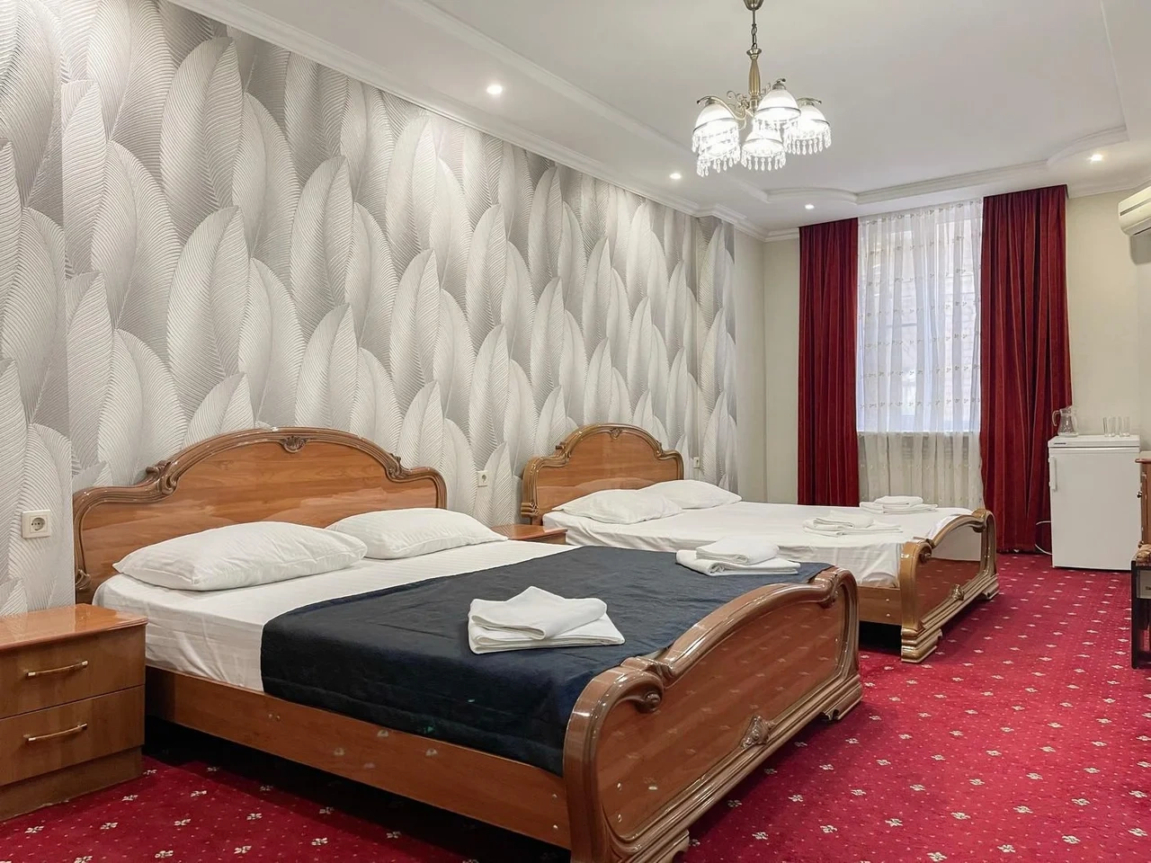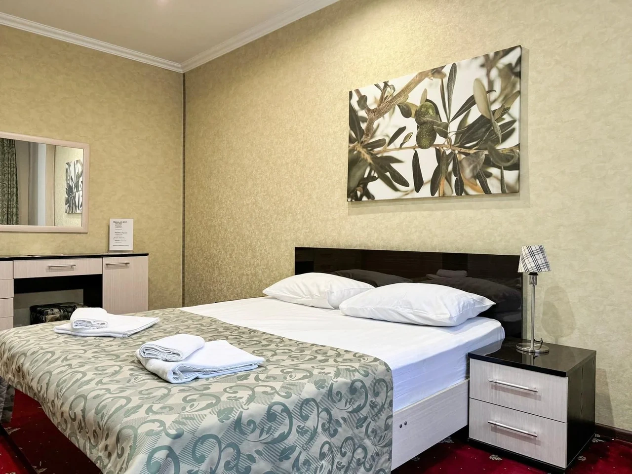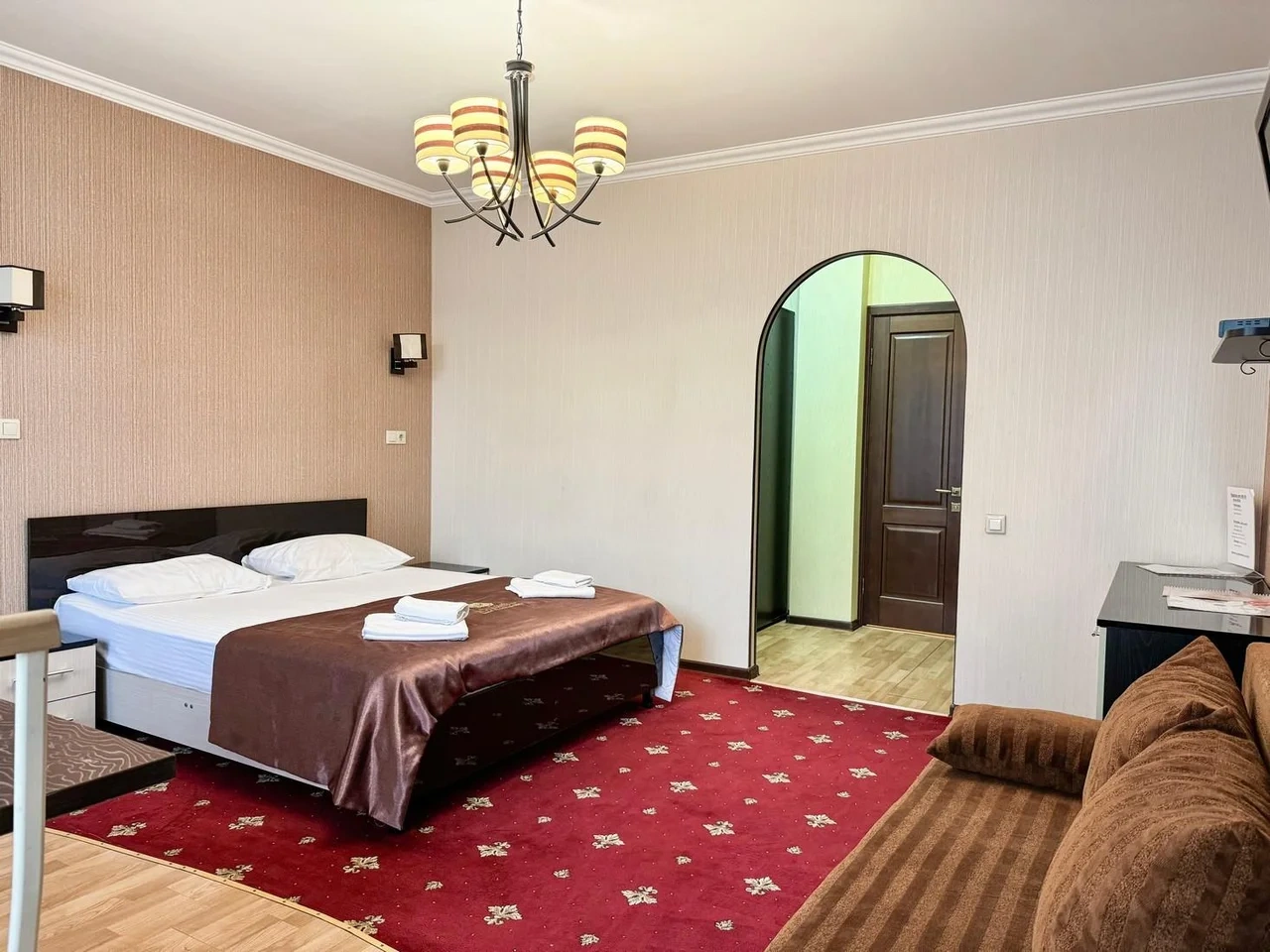 В номере воняет куревом! Вечером внизу (хозяева видимо) жарят шашлык и запах этого шашлыка вместе с дымом в номере. Мебель вся уставшая. Кровать для супружеского долга вообще не подходит, так как если на ней что то делать, то будет слышать все три этажа отеля. Матрац убитый. В санузле стоит джакузи и объявление что она не работает, но это полбеды. Воды в номере нет вообще, она просто идёт тонкой струечкой. Но это ещё тоже ладно, подмыться ещё хоть как то можно. Но как стоять в этой ванной вообще не понятно, так как у джакузи пол не ровный, нужно стоять, точнее сидеть в уголке ванной возле крана, так как вода не идёт совсем. Короче это не гостиница, а недоразумение. Слышимость в гостинице тоже нормальная. Заехали ночью люди всю ночь ругались, орали, но им даже никто не сделал замечание потому что вся администрация спит. Остановиться можно только если едешь на юг на одну ночь и то если не сильно вспотел, так как мыться и спать тут невозможно!!!