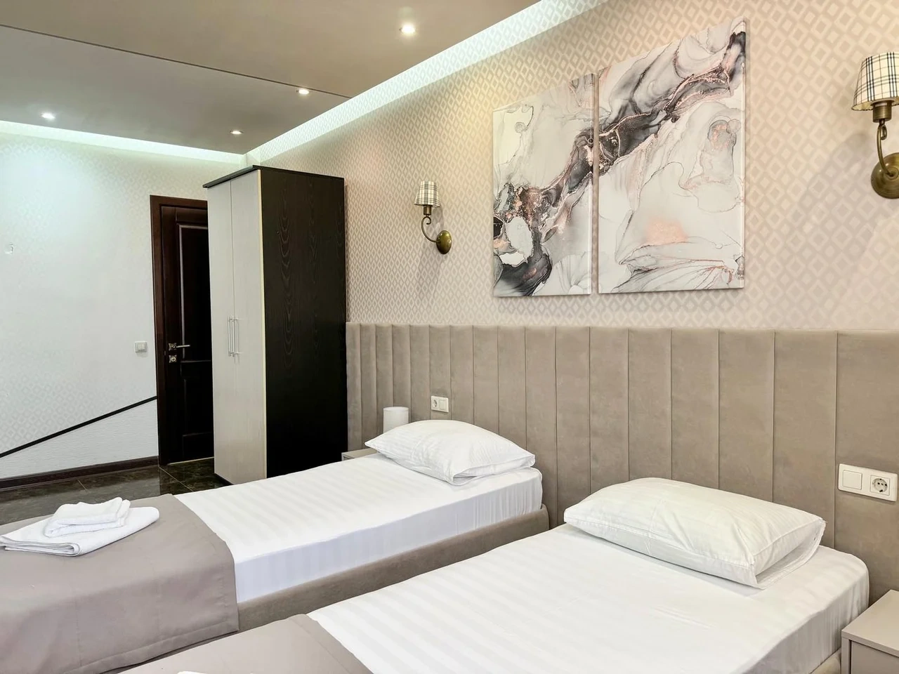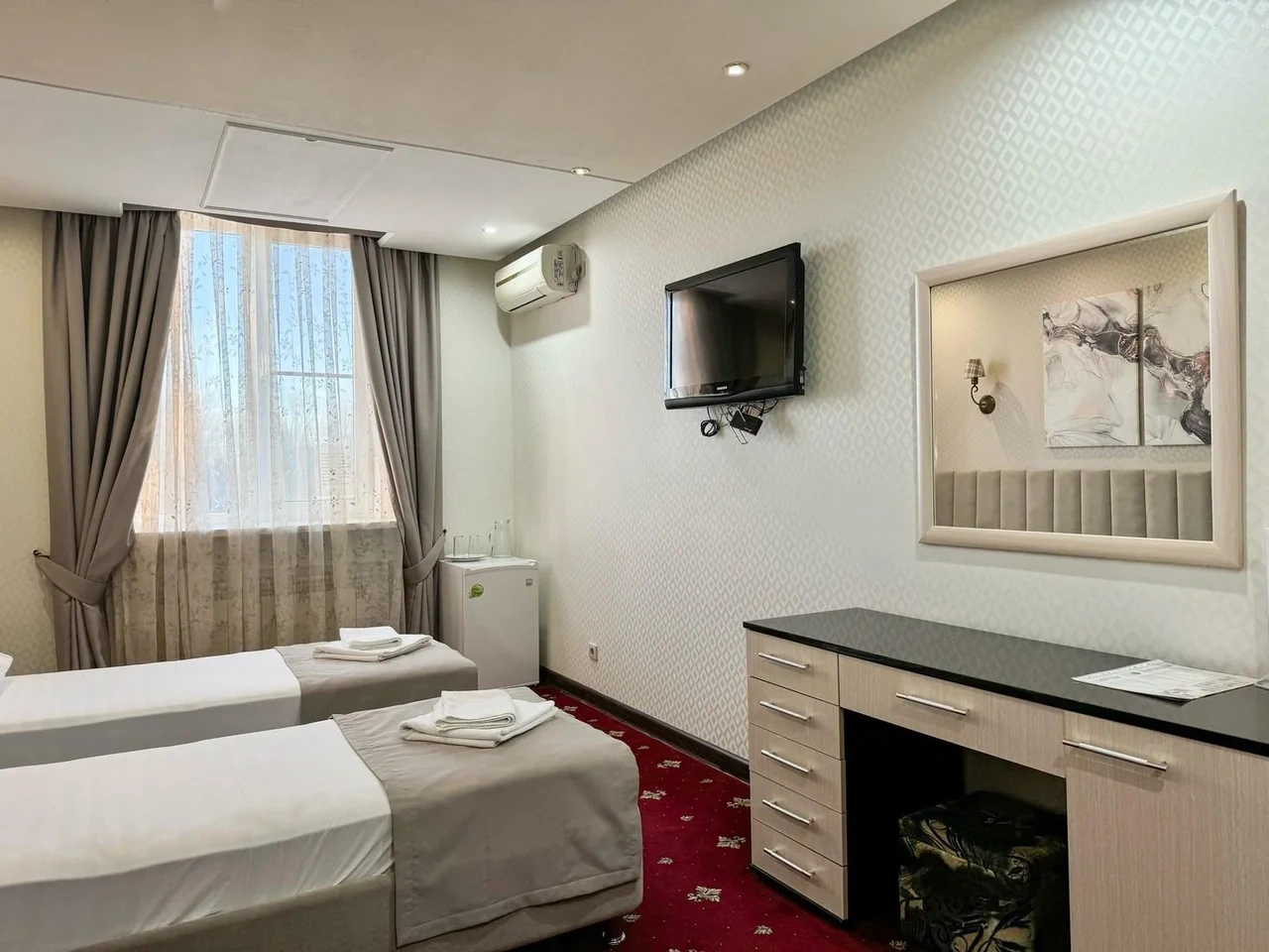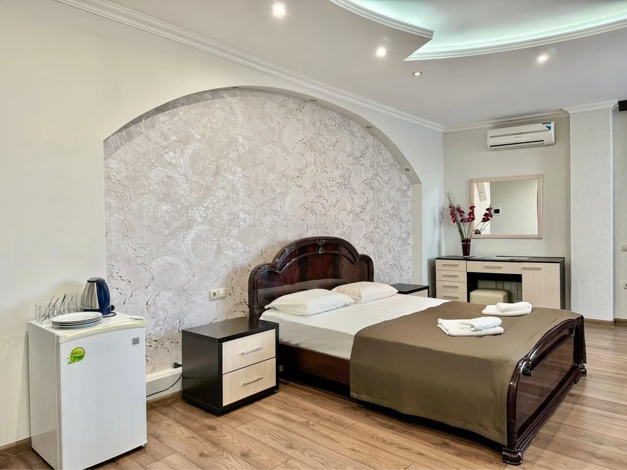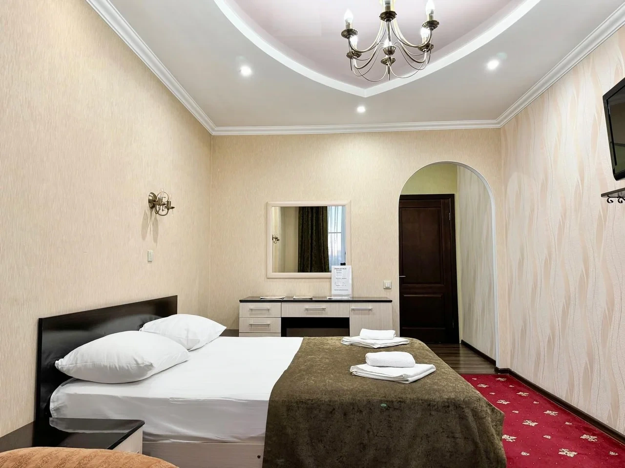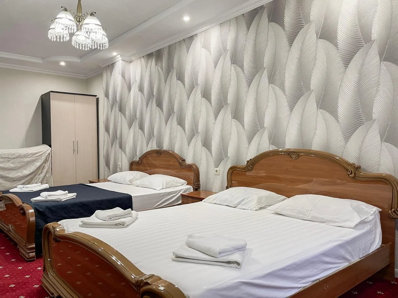В номере воняет куревом! Вечером внизу (хозяева видимо) жарят шашлык и запах этого шашлыка вместе с дымом в номере. Мебель вся уставшая. Кровать для супружеского долга вообще не подходит, так как если на ней что то делать, то будет слышать все три этажа отеля. Матрац убитый. В санузле стоит джакузи и объявление что она не работает, но это полбеды. Воды в номере нет вообще, она просто идёт тонкой струечкой. Но это ещё тоже ладно, подмыться ещё хоть как то можно. Но как стоять в этой ванной вообще не понятно, так как у джакузи пол не ровный, нужно стоять, точнее сидеть в уголке ванной возле крана, так как вода не идёт совсем. Короче это не гостиница, а недоразумение. Слышимость в гостинице тоже нормальная. Заехали ночью люди всю ночь ругались, орали, но им даже никто не сделал замечание потому что вся администрация спит. Остановиться можно только если едешь на юг на одну ночь и то если не сильно вспотел, так как мыться и спать тут невозможно!!!