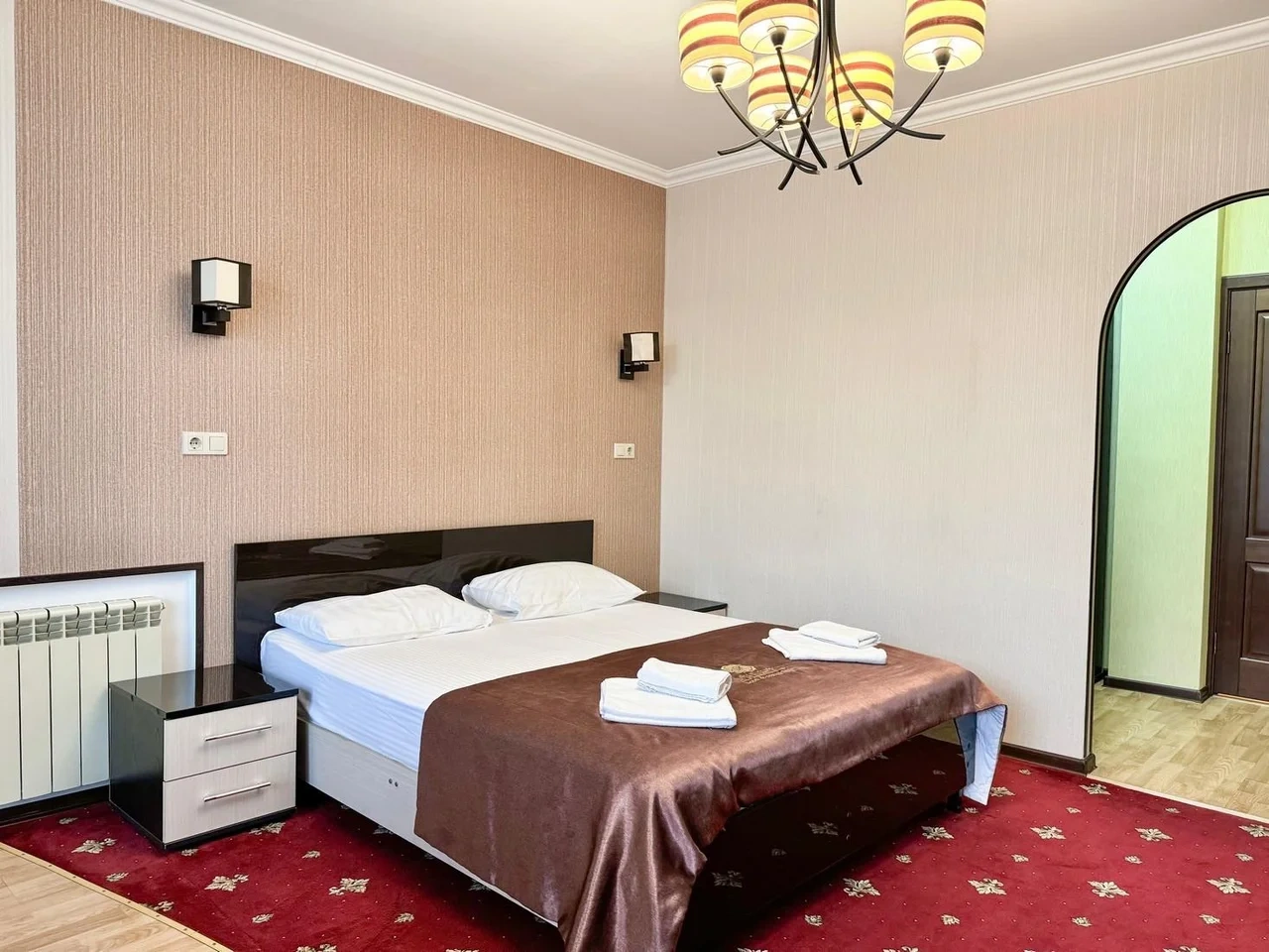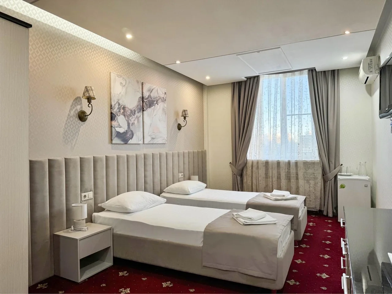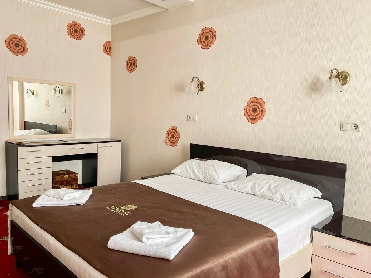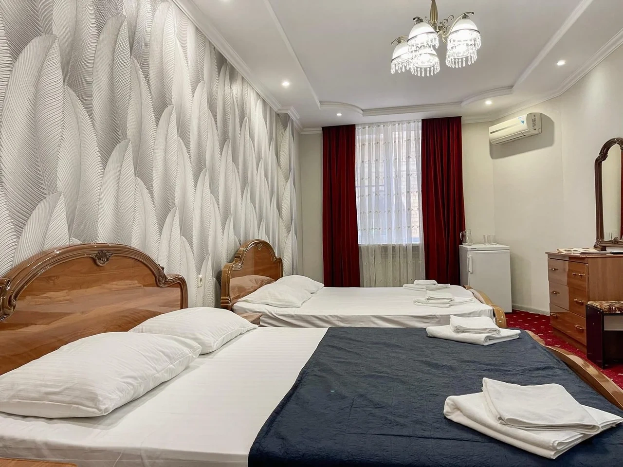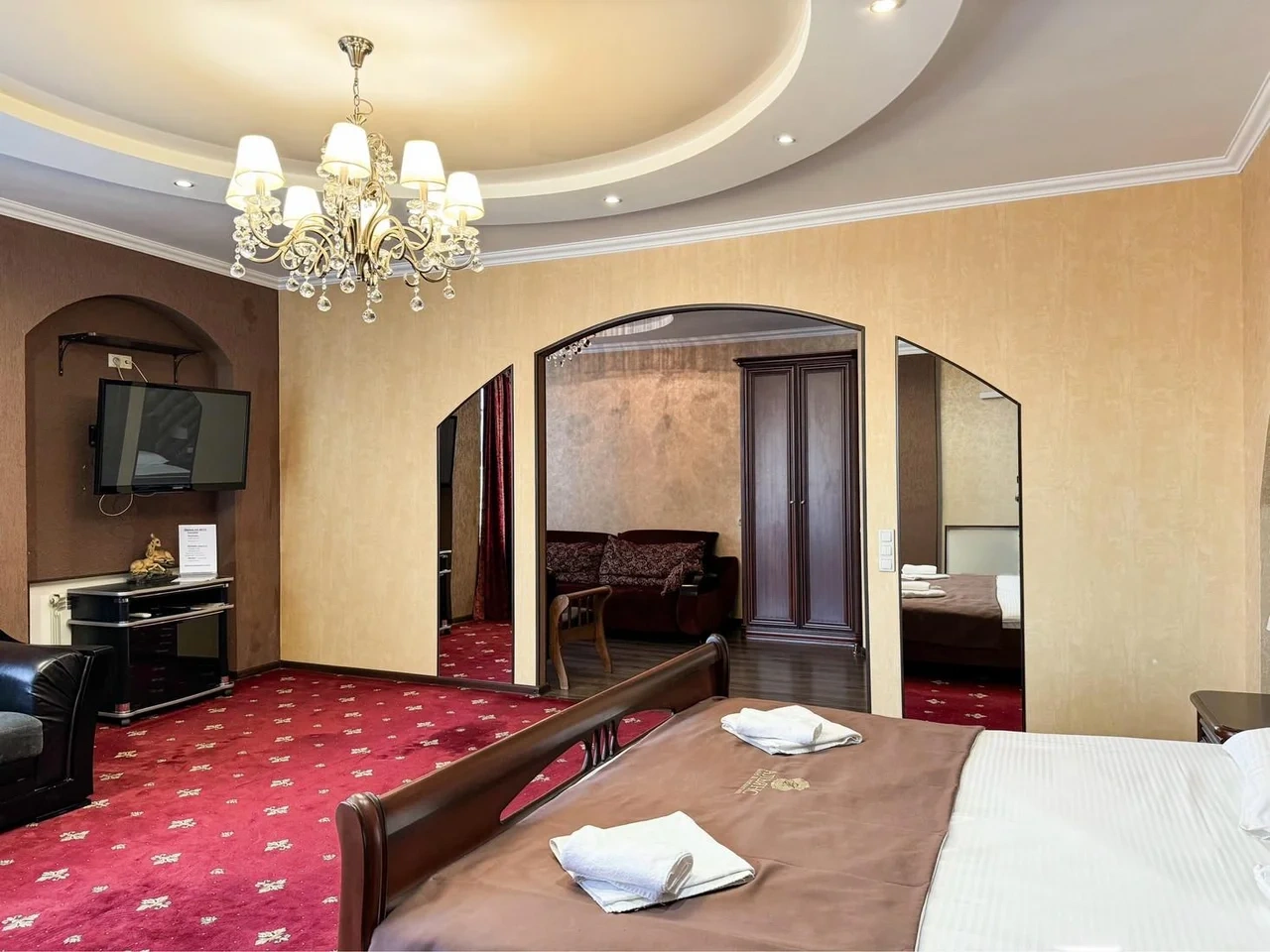 В номере воняет куревом! Вечером внизу (хозяева видимо) жарят шашлык и запах этого шашлыка вместе с дымом в номере. Мебель вся уставшая. Кровать для супружеского долга вообще не подходит, так как если на ней что то делать, то будет слышать все три этажа отеля. Матрац убитый. В санузле стоит джакузи и объявление что она не работает, но это полбеды. Воды в номере нет вообще, она просто идёт тонкой струечкой. Но это ещё тоже ладно, подмыться ещё хоть как то можно. Но как стоять в этой ванной вообще не понятно, так как у джакузи пол не ровный, нужно стоять, точнее сидеть в уголке ванной возле крана, так как вода не идёт совсем. Короче это не гостиница, а недоразумение. Слышимость в гостинице тоже нормальная. Заехали ночью люди всю ночь ругались, орали, но им даже никто не сделал замечание потому что вся администрация спит. Остановиться можно только если едешь на юг на одну ночь и то если не сильно вспотел, так как мыться и спать тут невозможно!!!