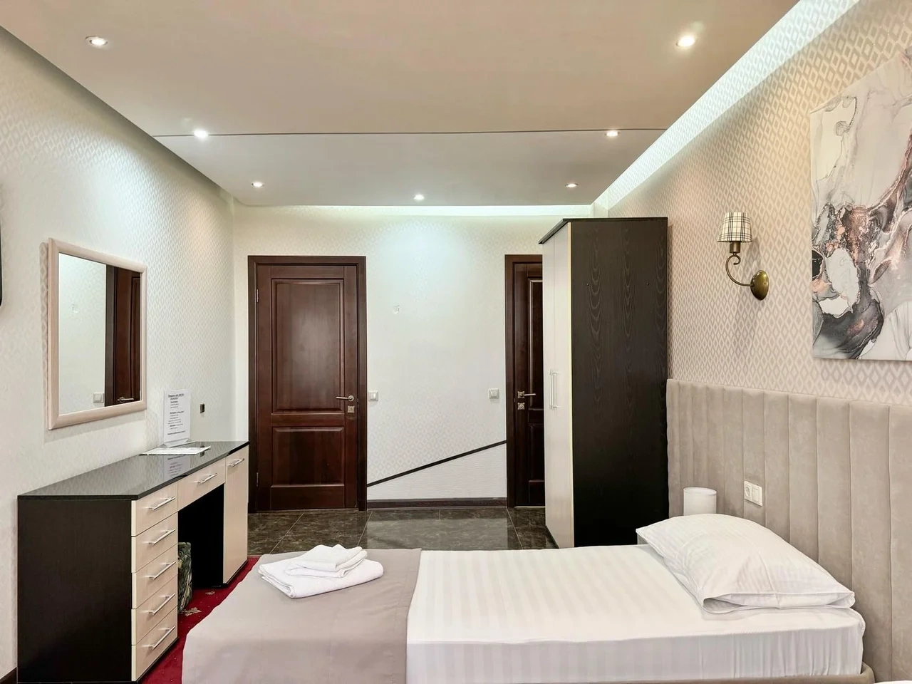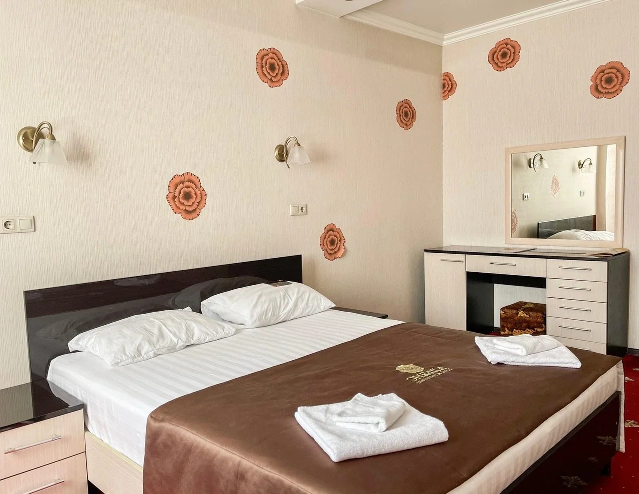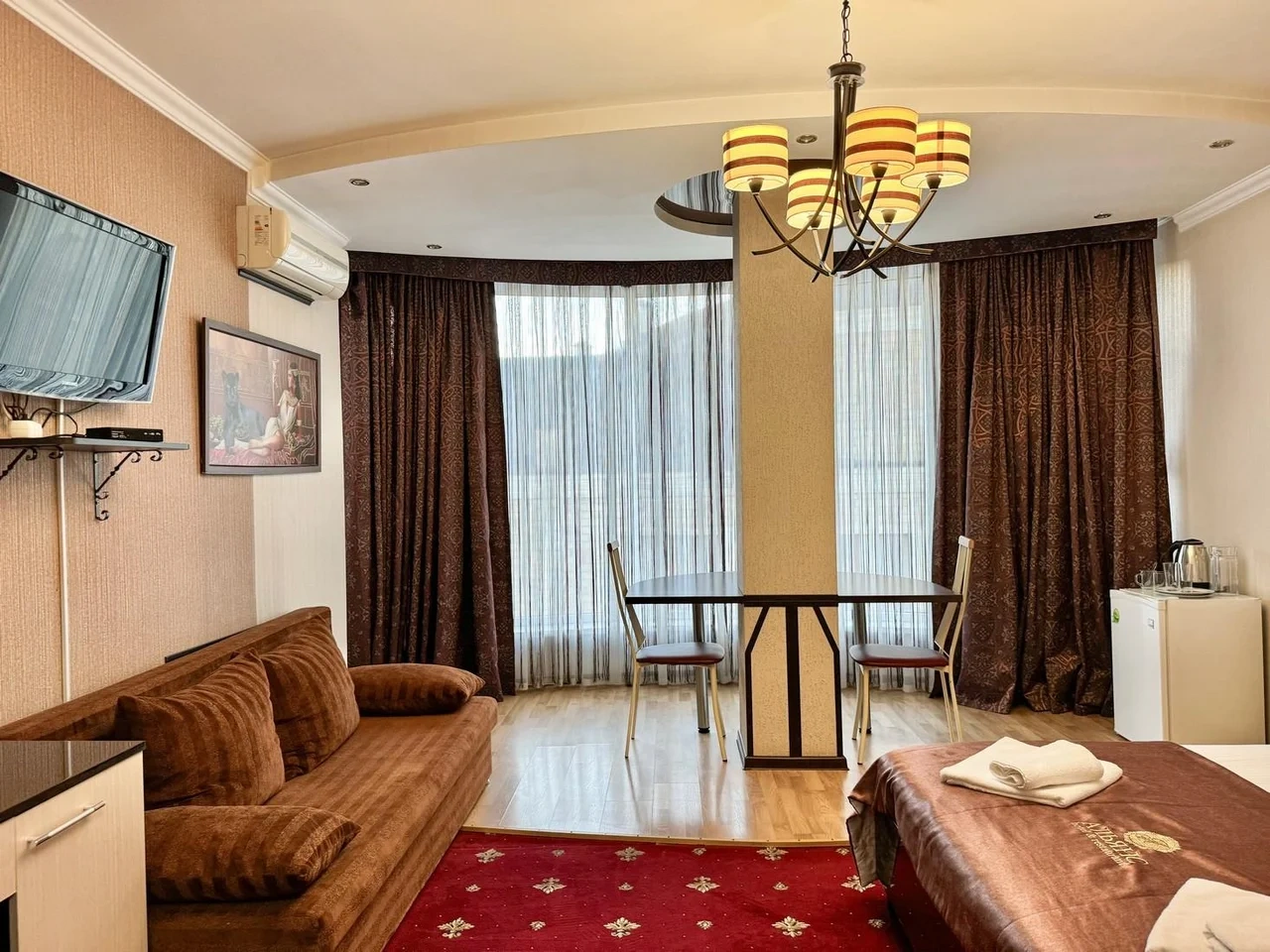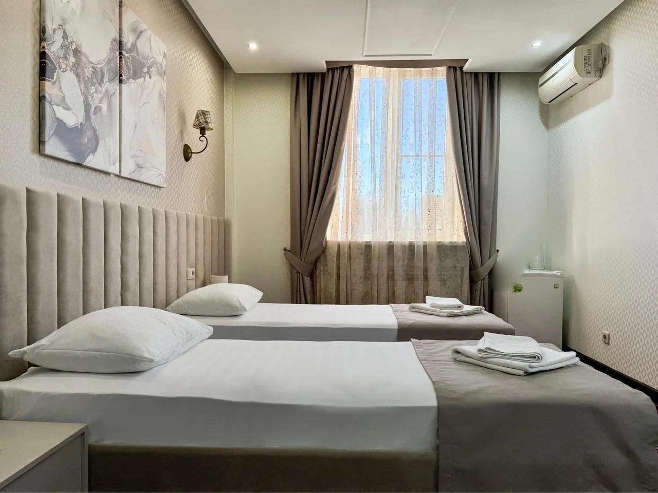 В номере воняет куревом! Вечером внизу (хозяева видимо) жарят шашлык и запах этого шашлыка вместе с дымом в номере. Мебель вся уставшая. Кровать для супружеского долга вообще не подходит, так как если на ней что то делать, то будет слышать все три этажа отеля. Матрац убитый. В санузле стоит джакузи и объявление что она не работает, но это полбеды. Воды в номере нет вообще, она просто идёт тонкой струечкой. Но это ещё тоже ладно, подмыться ещё хоть как то можно. Но как стоять в этой ванной вообще не понятно, так как у джакузи пол не ровный, нужно стоять, точнее сидеть в уголке ванной возле крана, так как вода не идёт совсем. Короче это не гостиница, а недоразумение. Слышимость в гостинице тоже нормальная. Заехали ночью люди всю ночь ругались, орали, но им даже никто не сделал замечание потому что вся администрация спит. Остановиться можно только если едешь на юг на одну ночь и то если не сильно вспотел, так как мыться и спать тут невозможно!!!