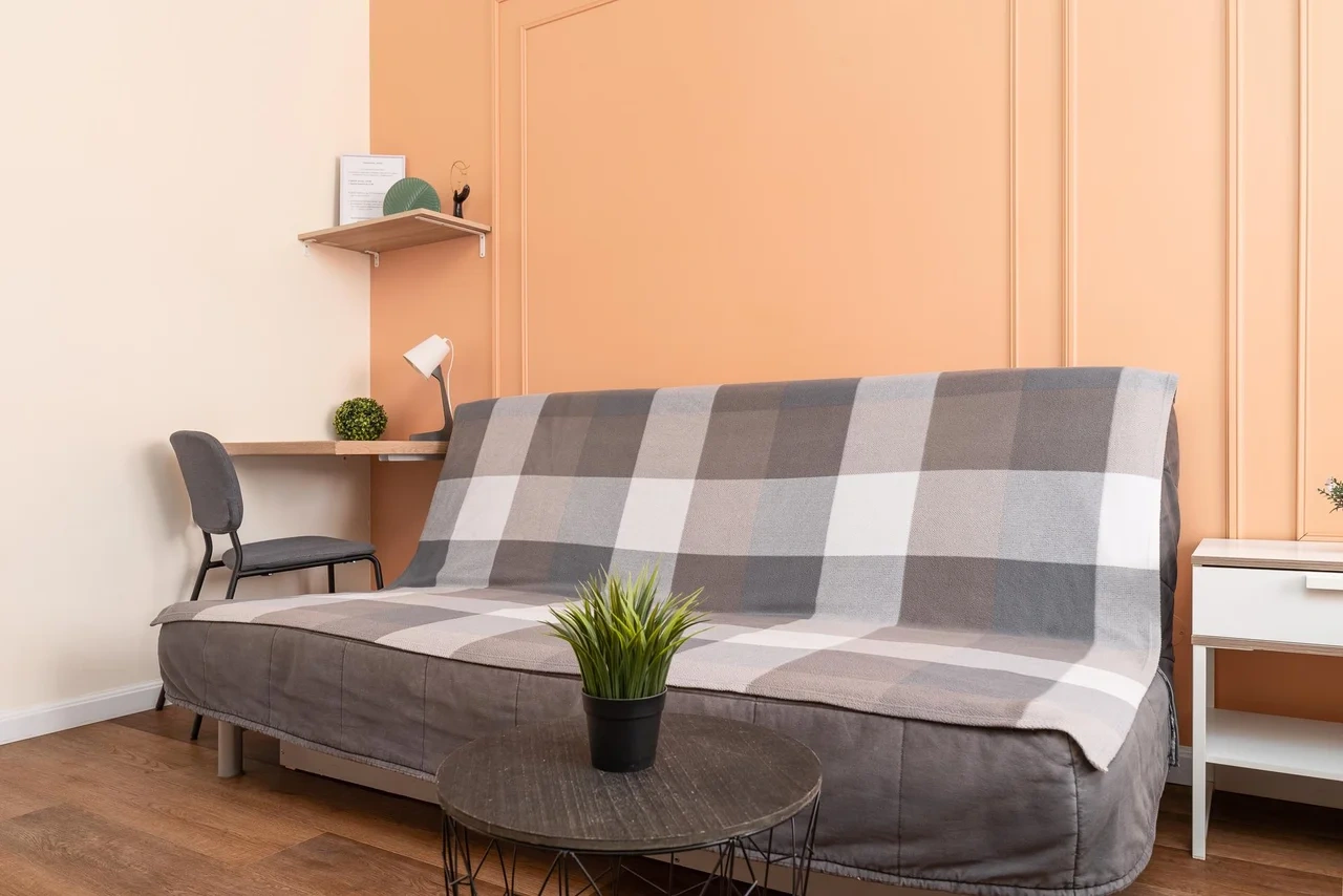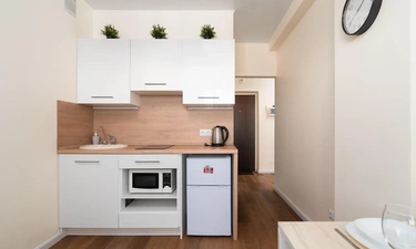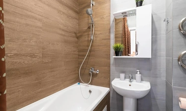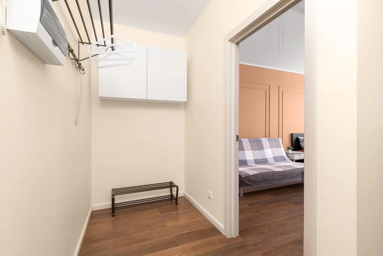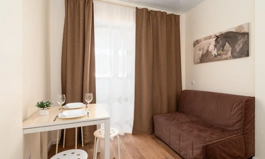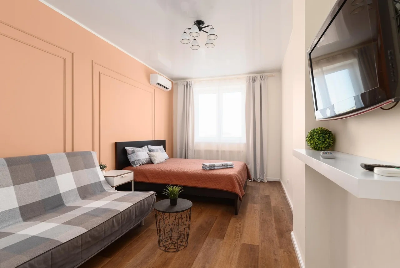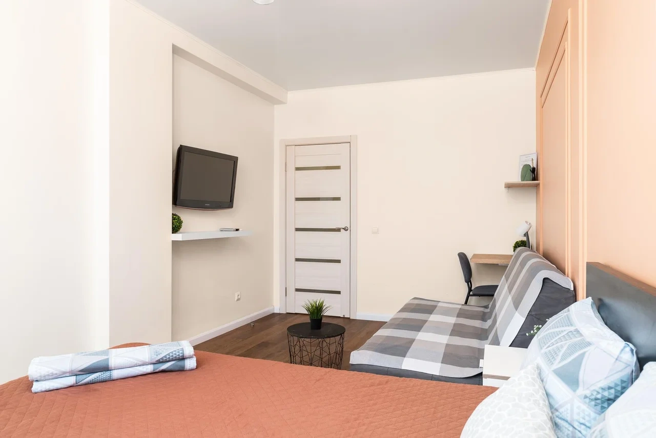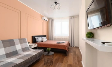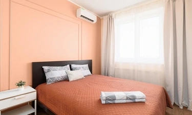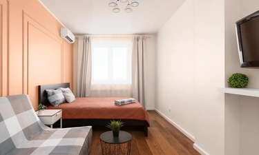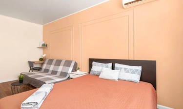Дизайнерский ремонт выполнен в 2021 году. Эргономичное расположение мебели позволяет разместить до 5 гостей. Кухня укомплектована техникой и посудой для приготовления пищи. В спальной комнате установлены кровать с пружинным матрасом и двуспальный диван. Комната оборудована удобным рабочим местом для удаленной работы. Подключен скоростной интернет, телевидение. Спальные комплекты и полотенца предоставляются. Приветственный чай/кофе.