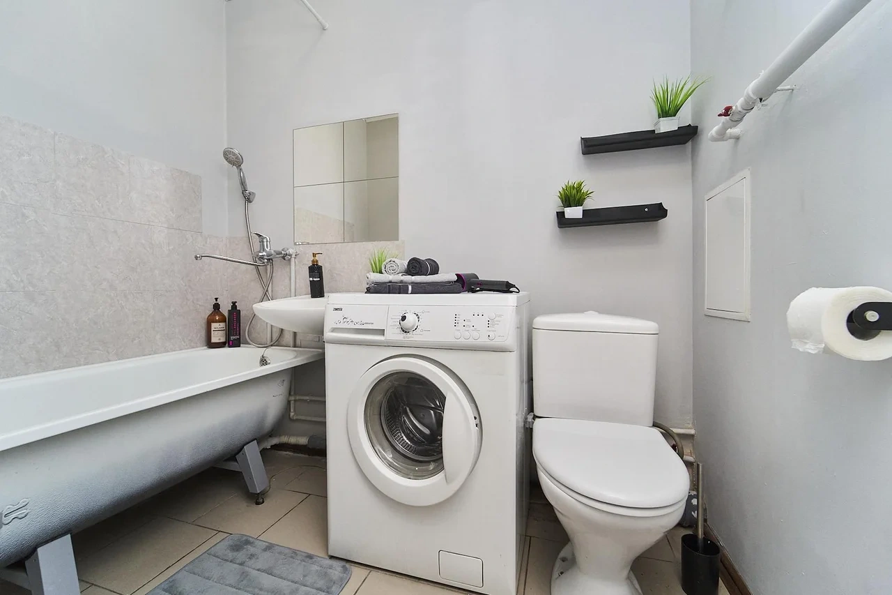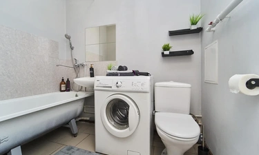 -ванна или душевая кабина, стиральная машина, полотенца, шампунь, мыло, фен, сушилка.