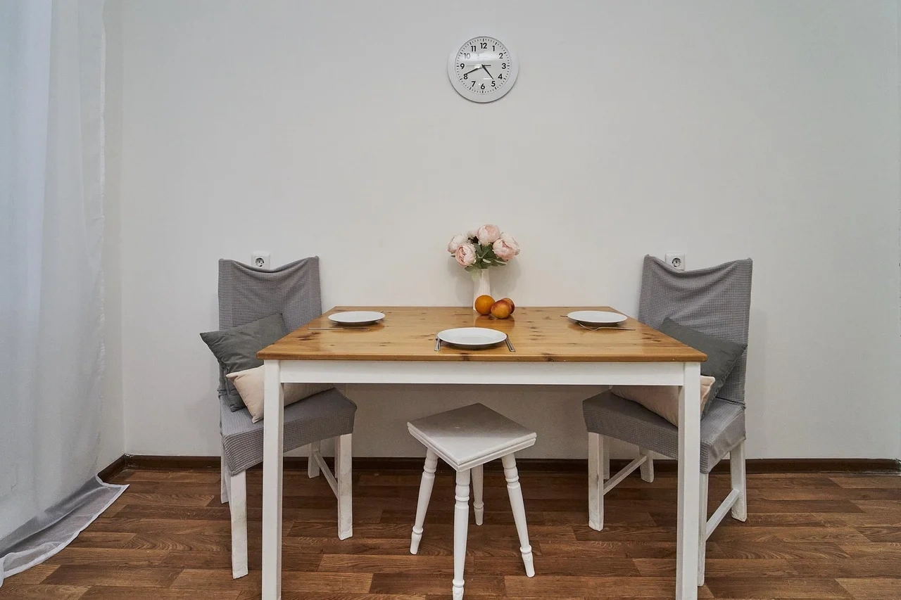 -Расчетный час пребывания в квартире - заезд с 14:00, выезд до 12:00 (двенадцать часов дня), т.е. независимо от того во сколько Вы заехали в квартиру, освободить ее нужно до 12:00 дня.