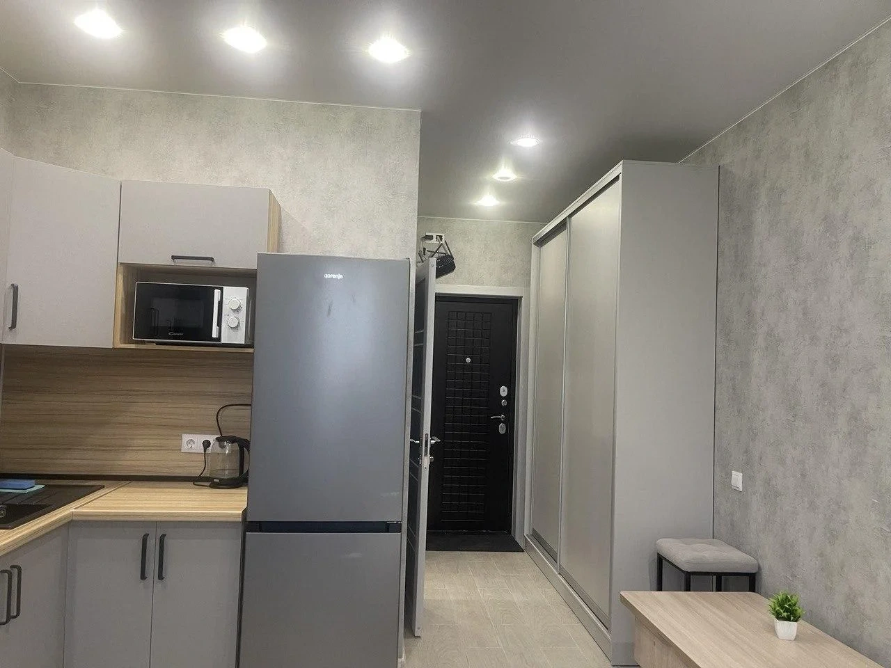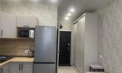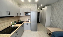 -плита, холодильник, микроволновая печь, чайник, набор посуды;