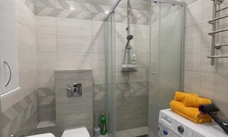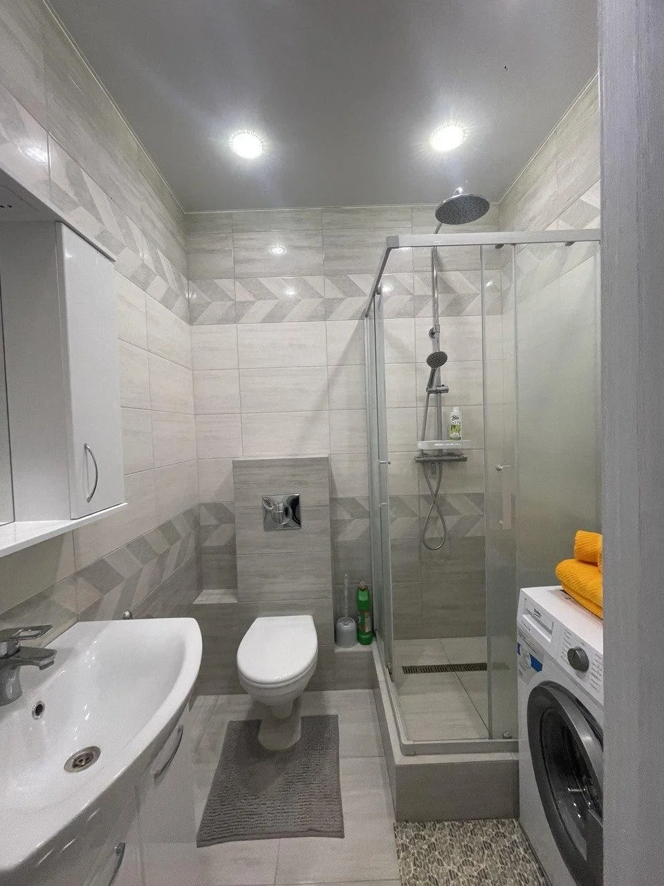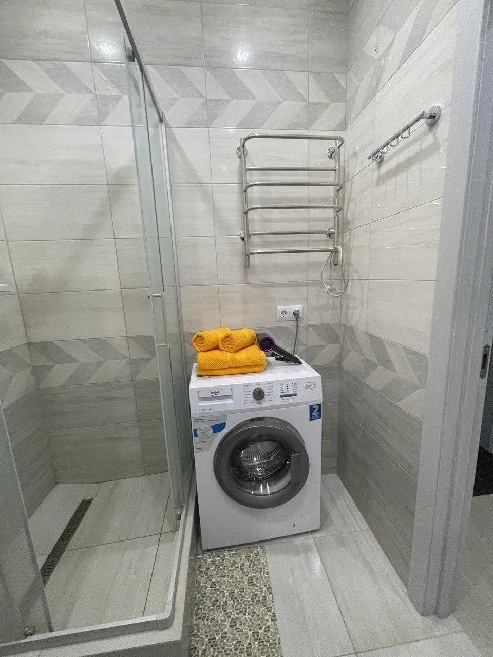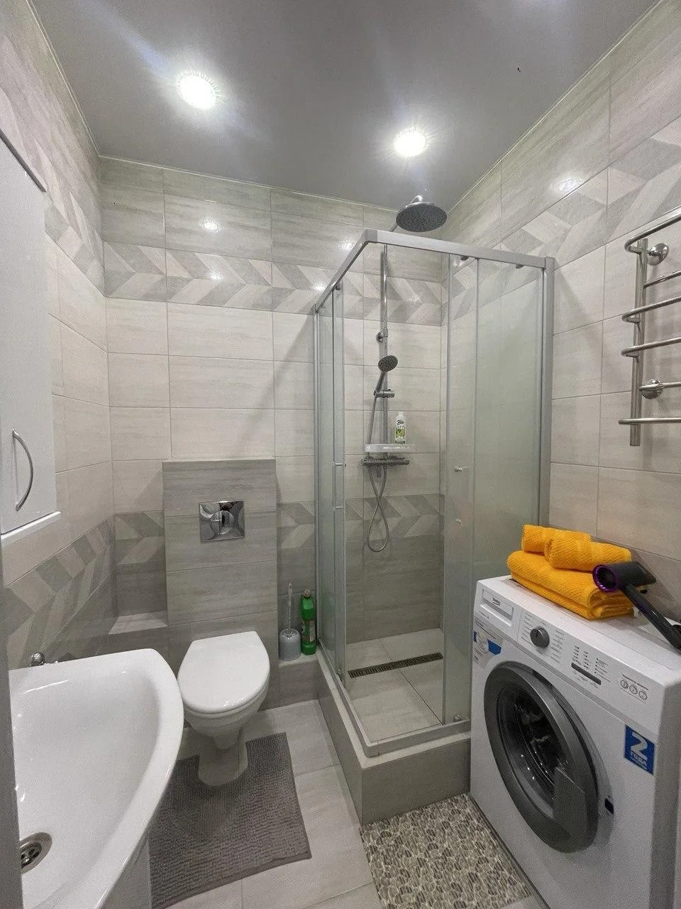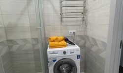 -ванна или душевая кабина, стиральная машина, полотенца, шампунь, мыло, фен, сушилка.