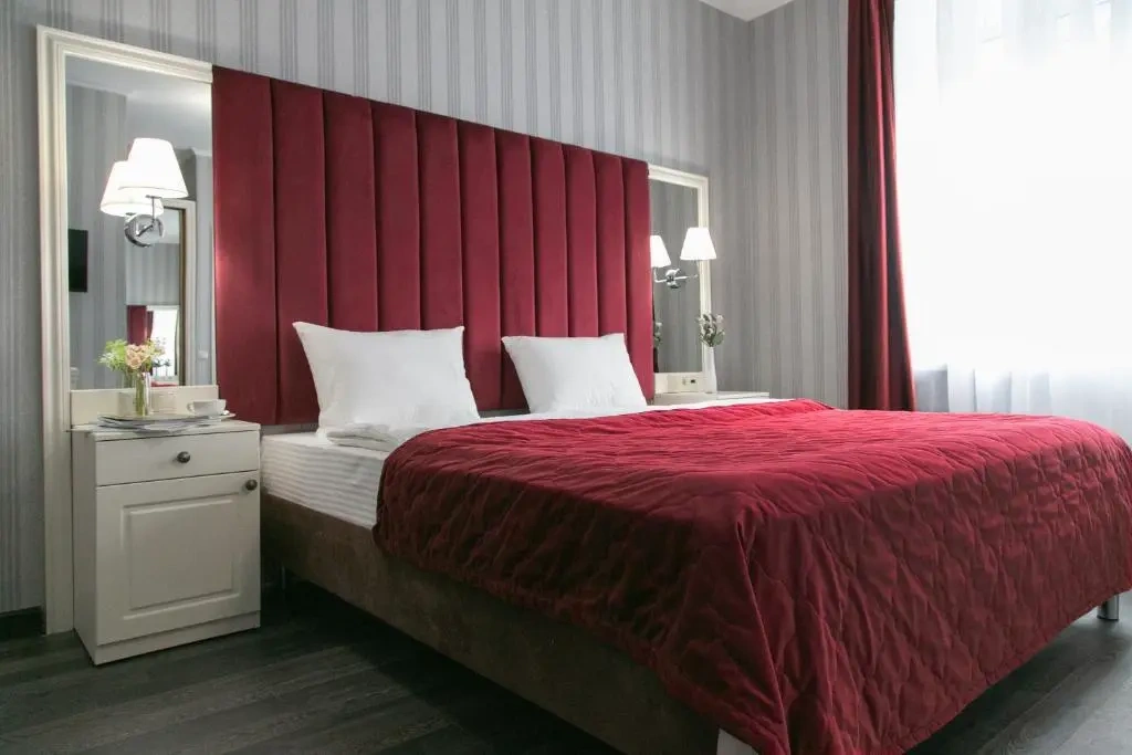 Улучшенный двухместный номер оснащен одной двуспальной кроватью размера king-size (180*200 см) и оборудован всем необходимым для комфортного проживания: телевизором, электрочайником, прикроватными бра, розетками, тумбочками, ортопедическим матрацем, который обеспечит комфортный отдых любому, даже самому восприимчивому Гостю. Все номера категории Улучшенный также оснащены письменным столом и шкафом. Собственная ванная комната оборудована душем, зеркалом, феном. Тапочки, вафельный халат и туалетные принадлежности (мыло, шампунь, гель для душа, зубной набор), а также чайная пара предоставляются бесплатно. WI-FI работает на всей территории отеля и предоставляется бесплатно. Вид из номера на тихую улицу или во двор. Площадь номера = 18м².