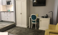 Апартаменты с большой двуспальной кроватью и мини-кухней. Идеально подходит для семей с детьми. Изысканная меблировка и декор, наличие кухонной плиты и телефонной связи. Номер оснащен мини-баром, чайной станцией с чайными принадлежностями, телевизором , феном ,кондиционером. Возможно для размещения семей с маленькими детьми. Наличие мягкого халата и пушистых полотенец помогут создают домашнюю атмосферу. Ванная комната оснащена немецким сантехническим оборудованием.Площадь номера варьируется от 24 до 28 кв.м. Планировка номера возможна в трех различных вариантах.