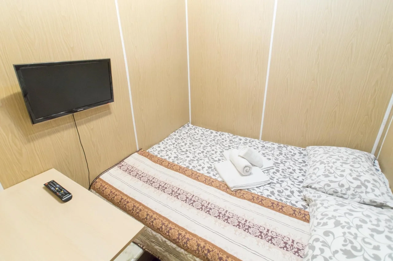 В номере есть телевизор, работающий  от интернета. Но, так как интернет очень медленный, трансляция постоянно прерывалась.