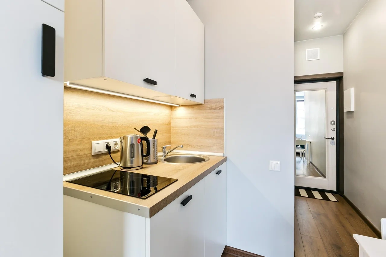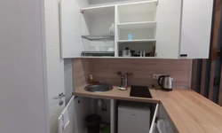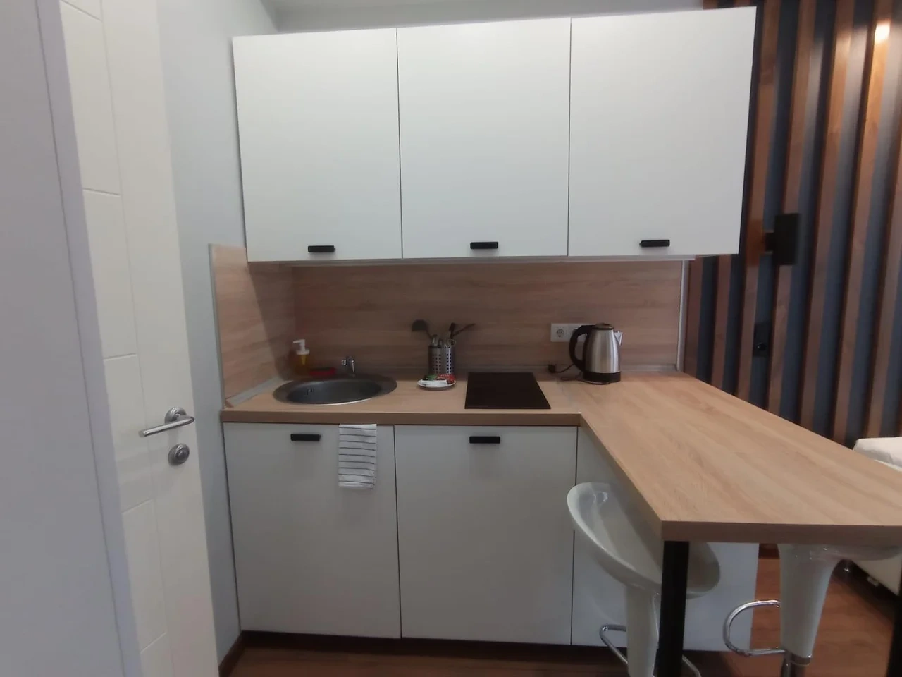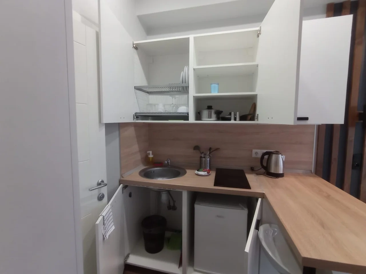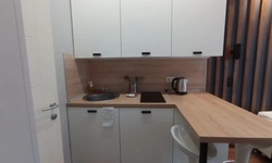 - Кухня с минимальным набором посуды для приготовления пищи, а также холодильник, варочная панель и электрический чайник;