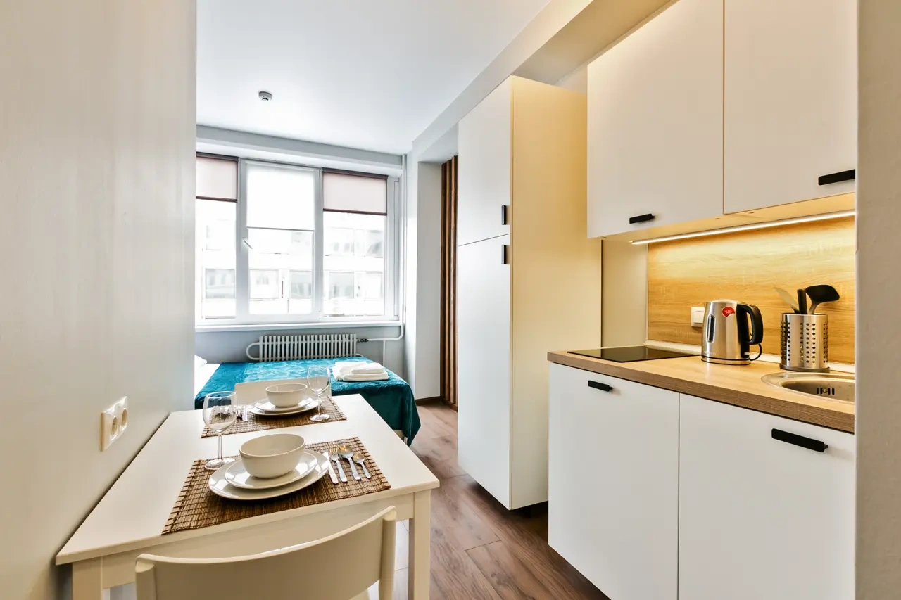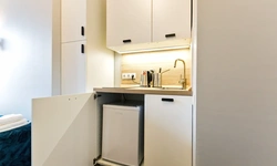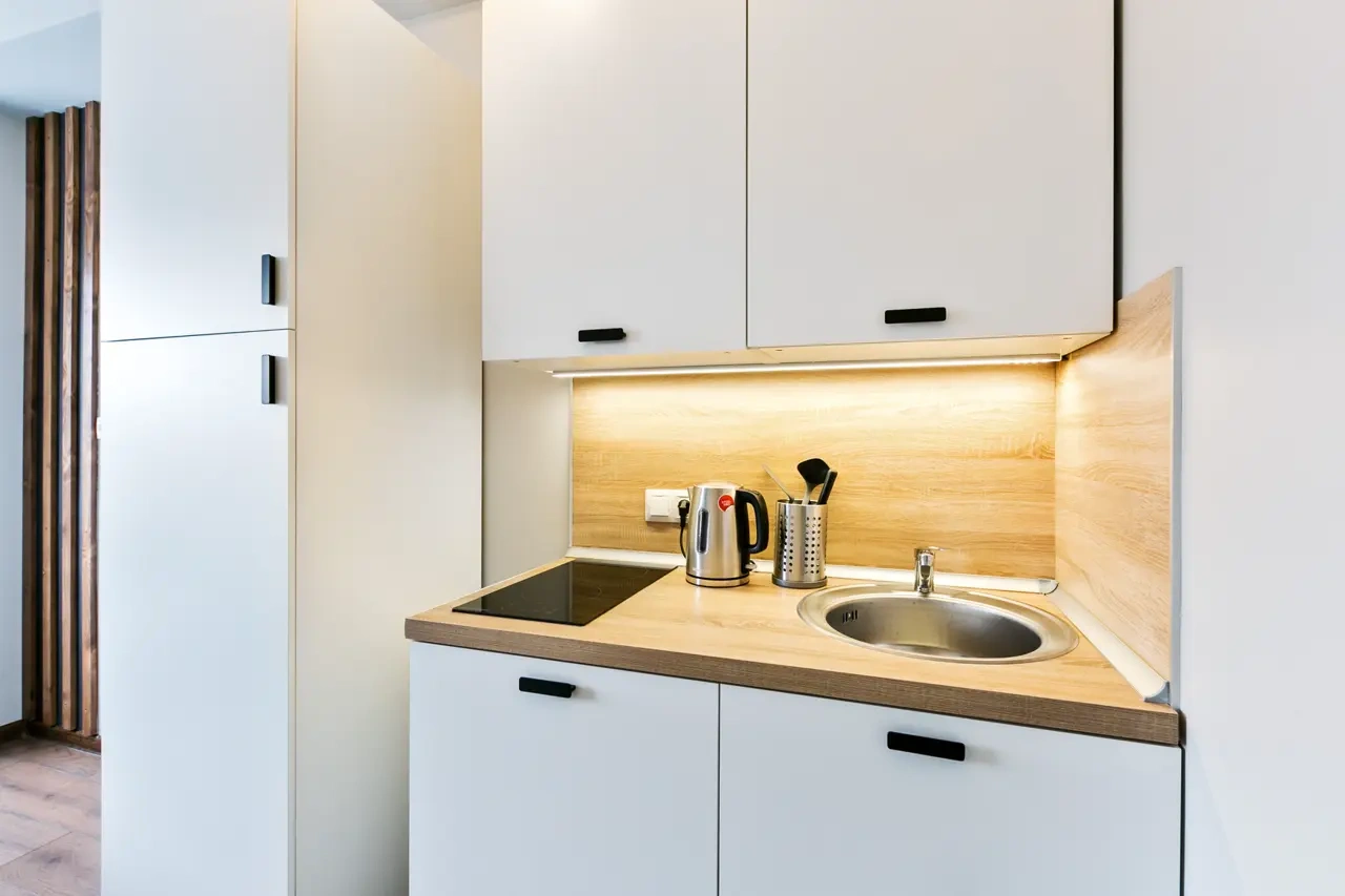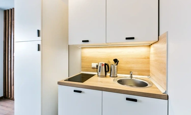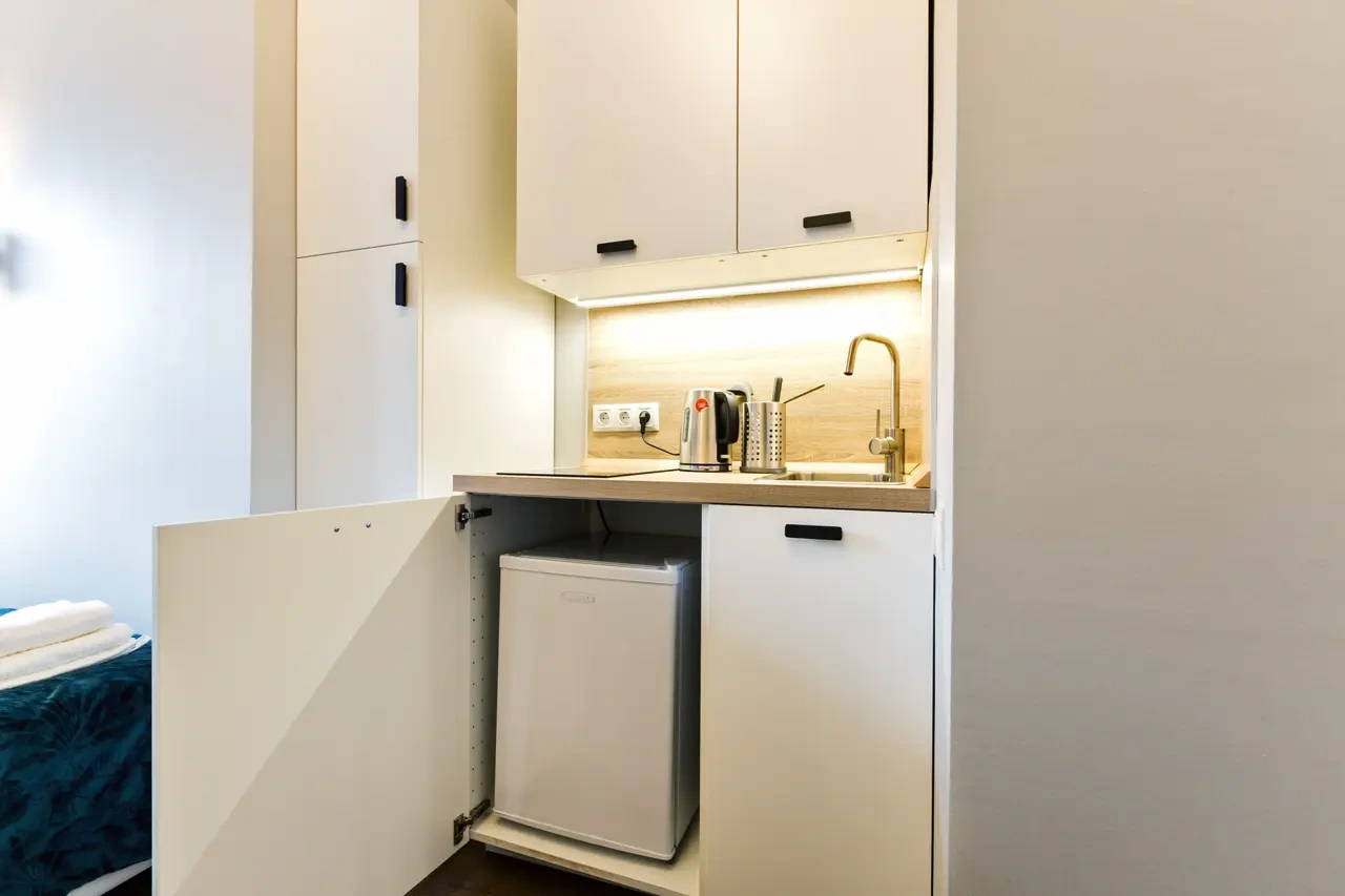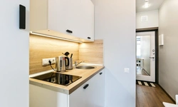 - Кухня с минимальным набором посуды для приготовления пищи, а также холодильник, варочная панель и электрический чайник;