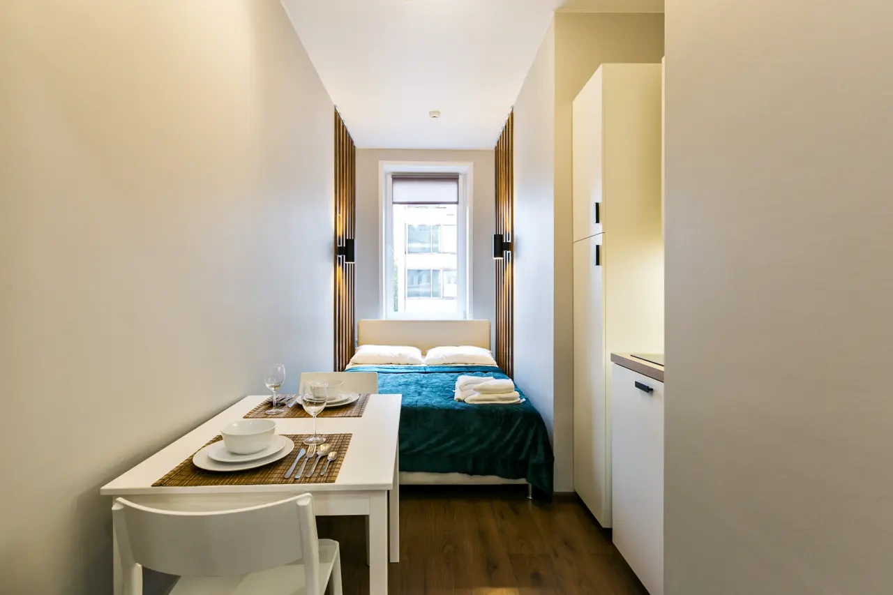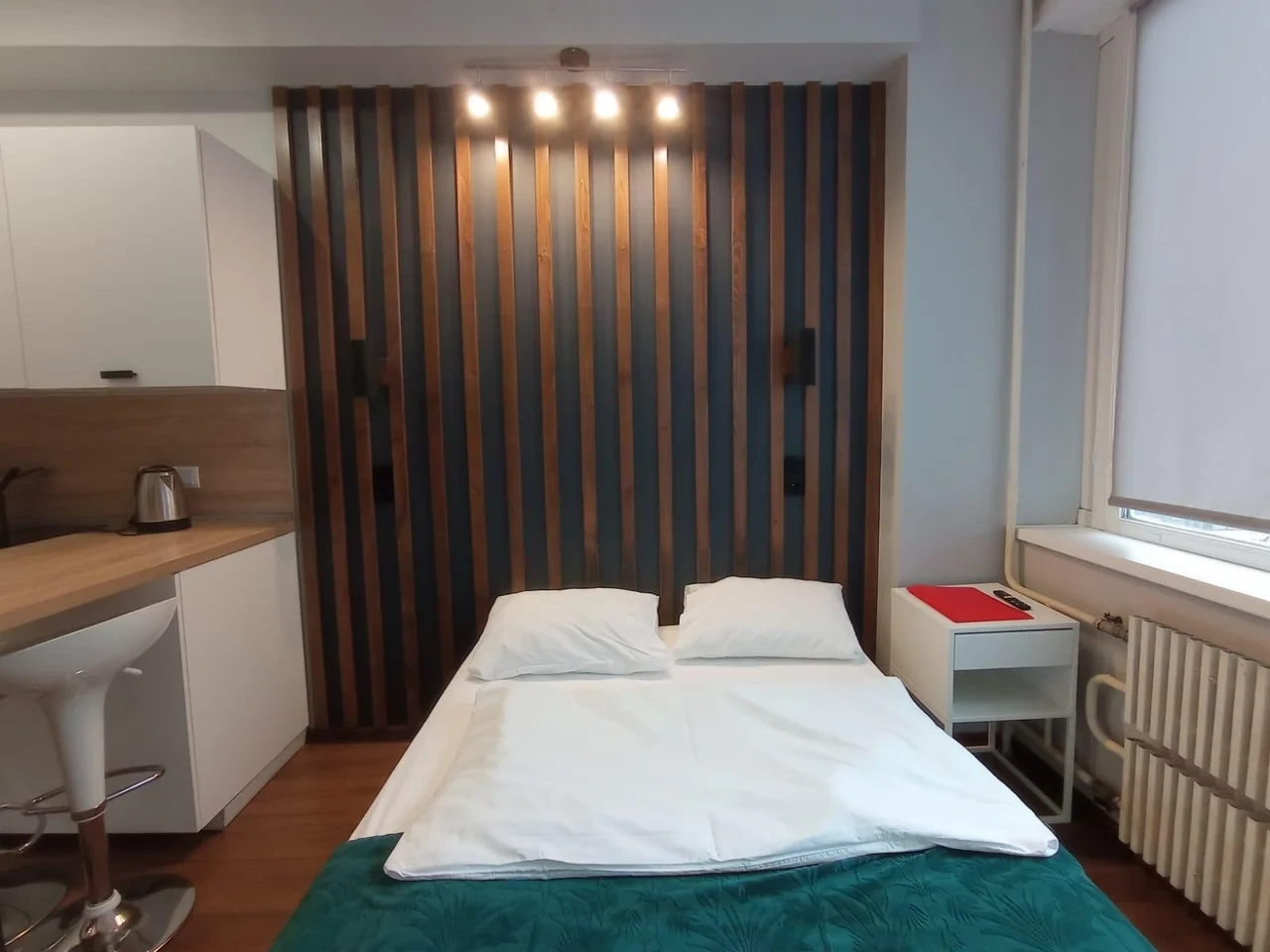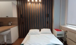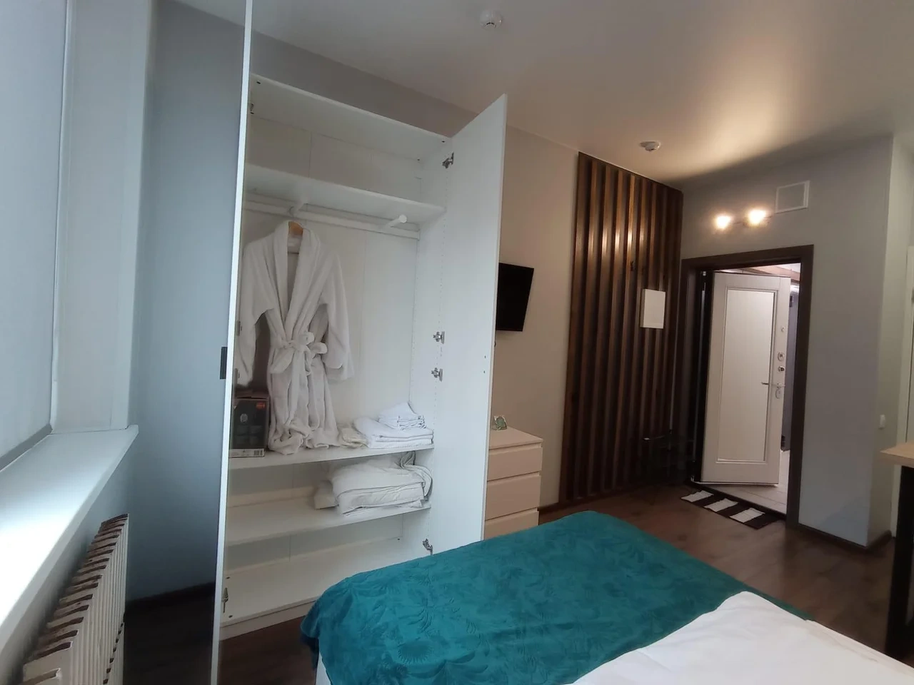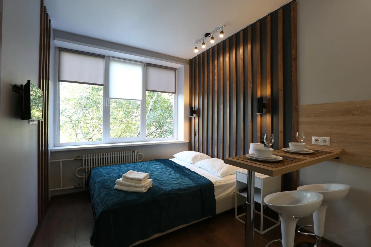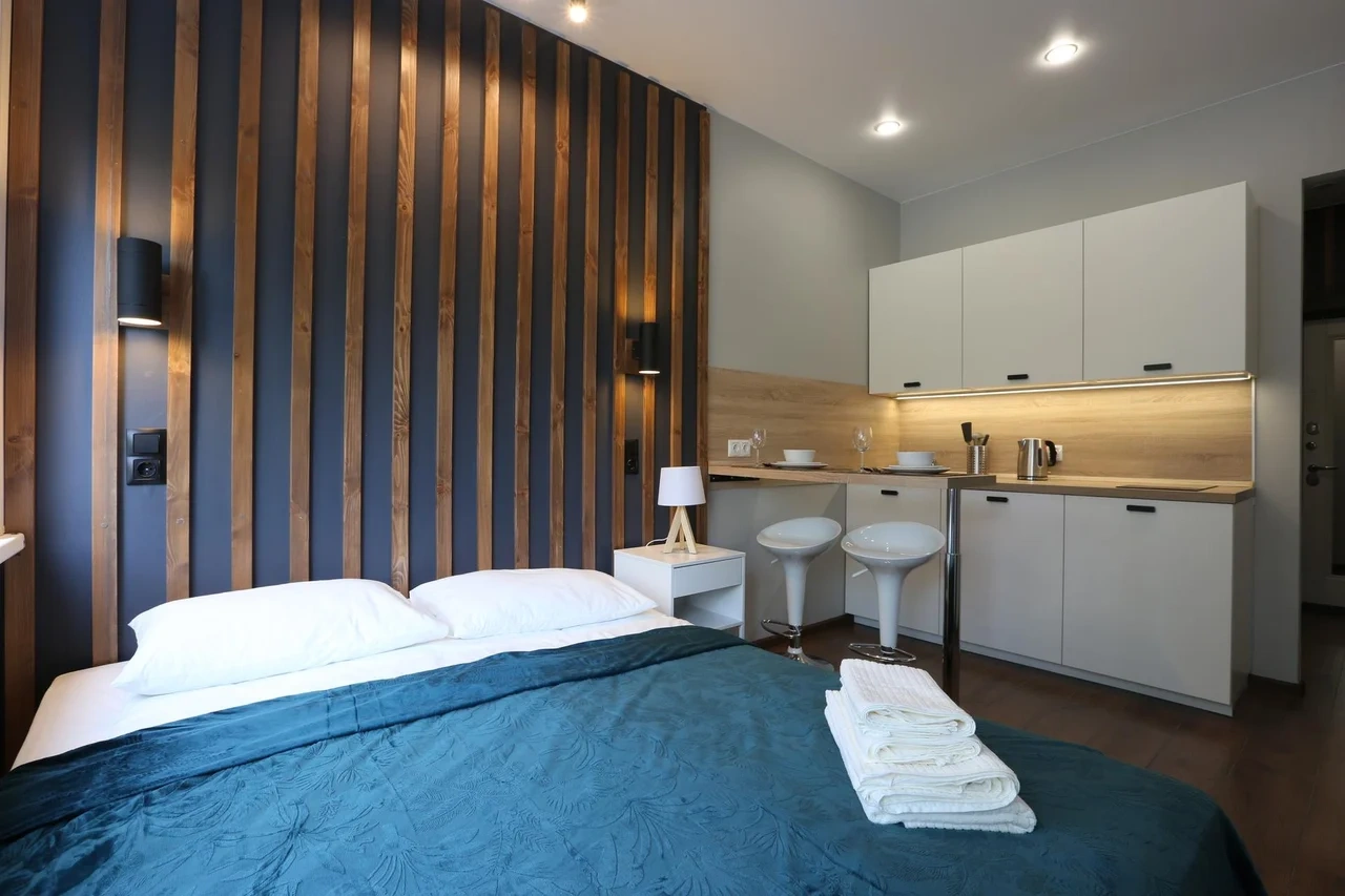 Гостям предлагается студия, в которой установлена большая двуспальная кровать, либо 2 раздельные односпальные кровати. Также возможно поставить дополнительную кровать. В апартаментах дизайнерский ремонт, они отлично подойдут для размещения двух гостей.
