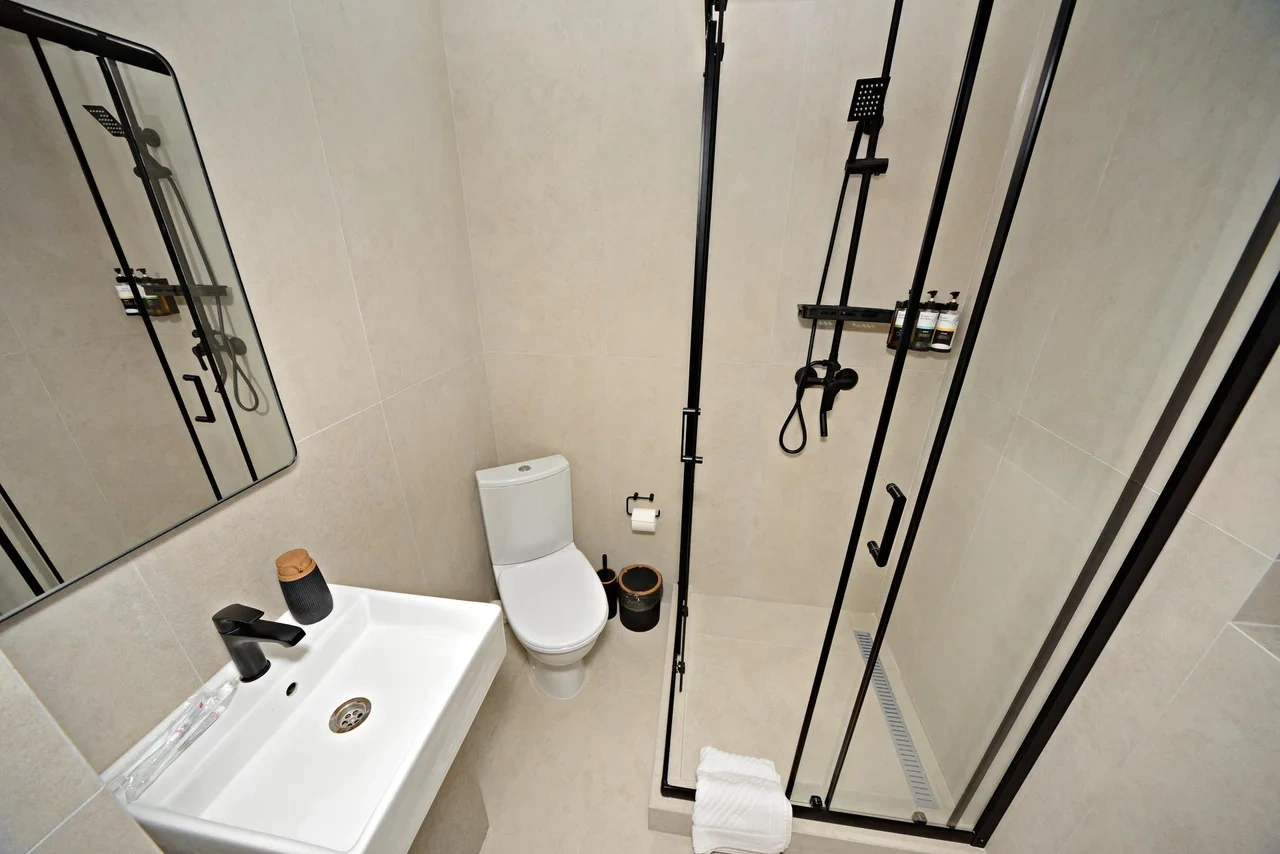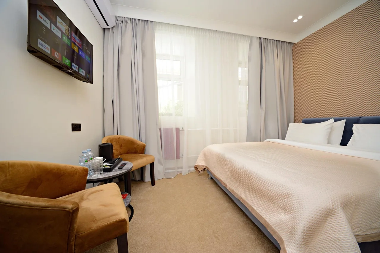 Номер с современным дизайном, кондиционером и смарт-тв. В вашем распоряжении собственная ванная комната. Услуги и удобства: Кондиционер, Туалет, Ванная комната, Ванна или душ, фен, Холодильник , Электрический чайник. Бесплатный Wi-Fi во всех номерах.