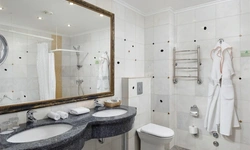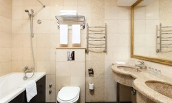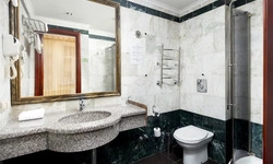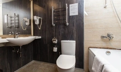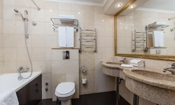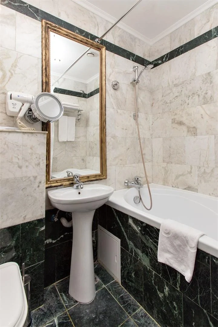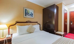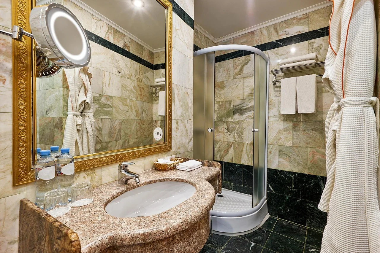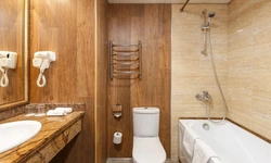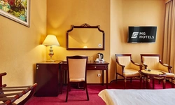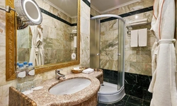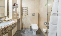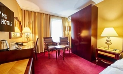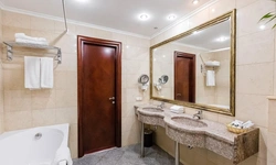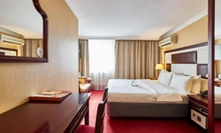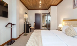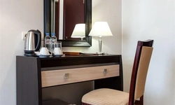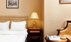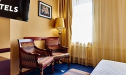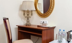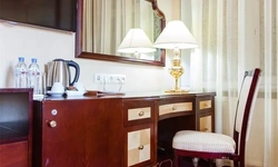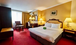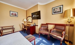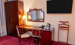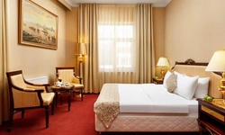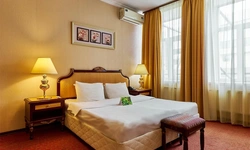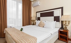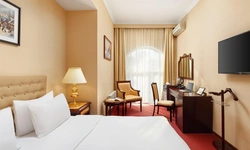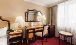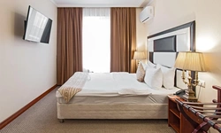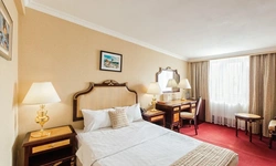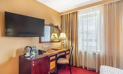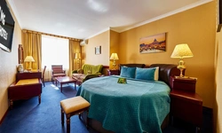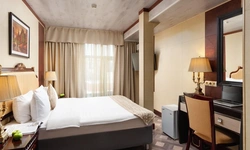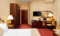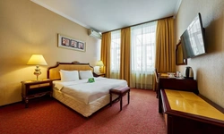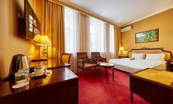 Номер категории «Бизнес» – оптимальный вариант как для рабочей поездки или встречи с деловыми партнерами, так и для романтического отдыха. Широкая кровать размера «King size» с ортопедическим матрасом гарантирует вам прекрасный сон. Теплые тона отделки дарят ощущение комфорта и способствуют расслаблению, мебель из ценных пород дерева выглядит изысканно и одновременно солидно. Интерьер номера тщательно продуман, здесь есть все, что может понадобиться во время отдыха. Ценные вещи и документы можно оставить в сейфе. Номера укомплектованы мини-баром, чайной станцией, телефоном, феном, гладильными принадлежностями и халатами. Ежедневно при жилой уборке происходит пополнение гигиенических принадлежностей, питьевой воды, чая и сахара. Мини-бар не входит в стоимость номера и оплачивается отдельно. Под запрос предоставляются косметический и бритвенный наборы. Окна номера выходят на тихую улицу, внутренний двор и на город, так что можете быть уверены: вашему отдыху не помешает шум.