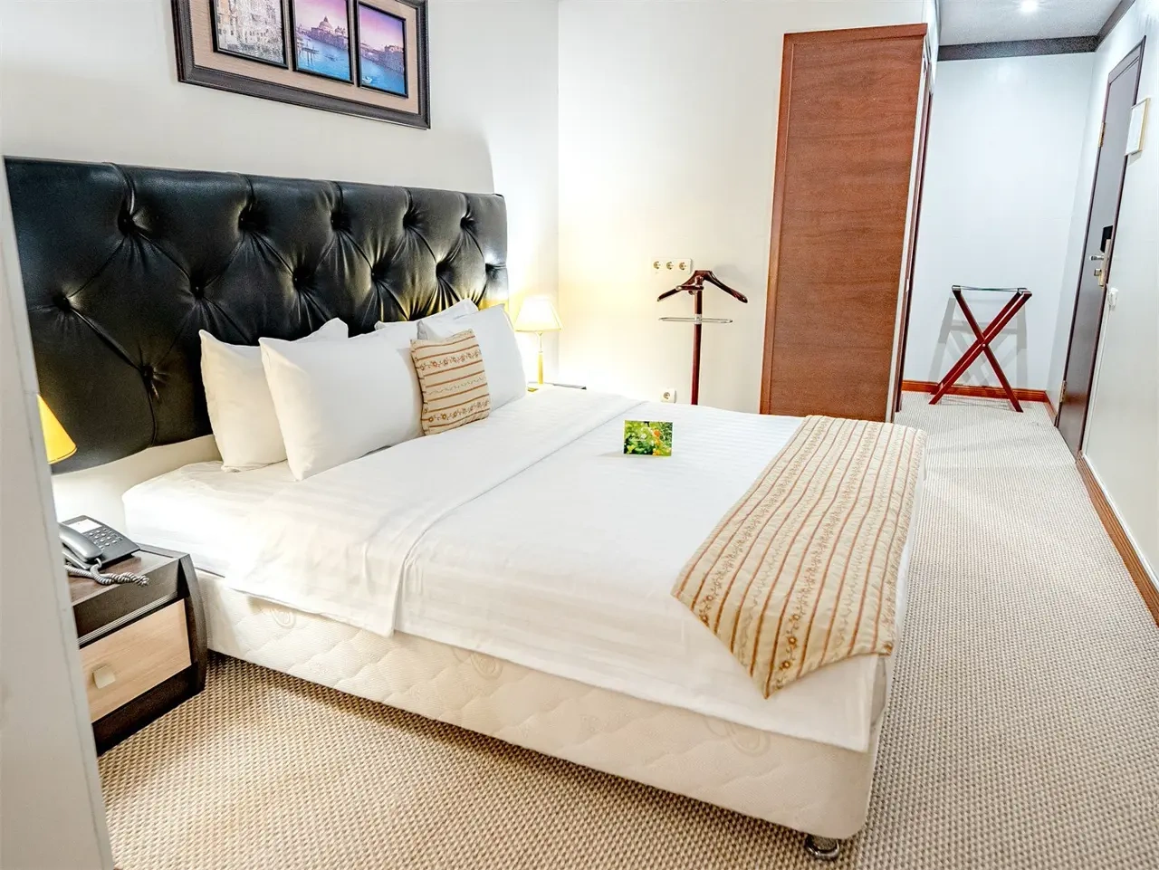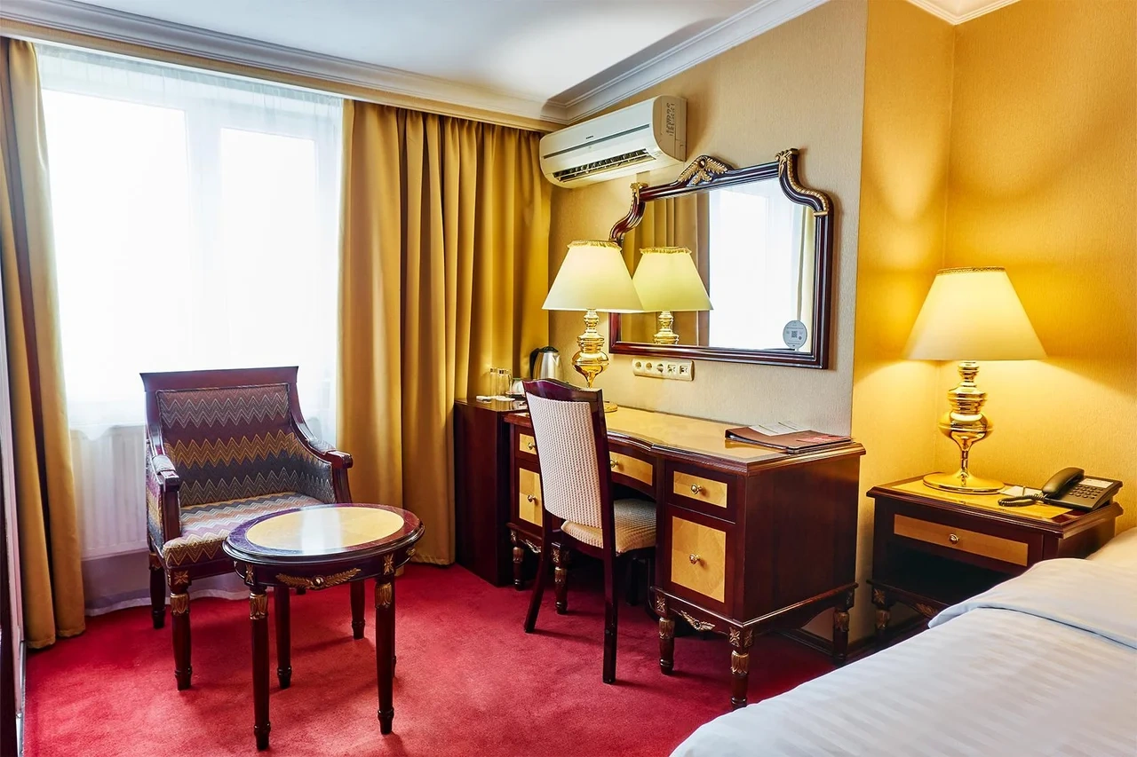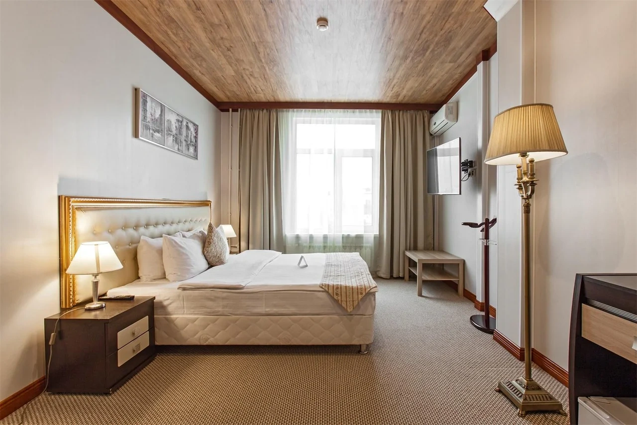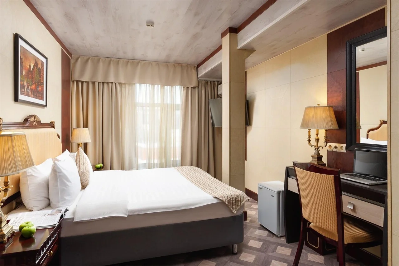 Путешествуете вдвоем? Один из лучших вариантов размещения — комфортный двухместный номер категории «улучшенный». В компактном номере нашлось место не только для комфортной двуспальной кровати с ортопедическим матрасом, но и для полноценной рабочей зоны с удобным столом и высокоскоростным беспроводным интернетом. Дизайн прост и лаконичен, но благодаря ему небольшое по площади помещение выглядит просторным и светлым. Ценные вещи и документы можно оставить в сейфе. Номера укомплектованы мини-баром, чайной станцией, телефоном, феном, гладильными принадлежностями и халатами. Ежедневно при жилой уборке происходит пополнение гигиенических принадлежностей, питьевой воды, чая и сахара. Мини-бар не входит в стоимость номера и оплачивается отдельно. Под запрос предоставляются косметический и бритвенный наборы. Окна номера выходят на тихую улицу, внутренний двор и на город, так что можете быть уверены: вашему отдыху не помешает шум.