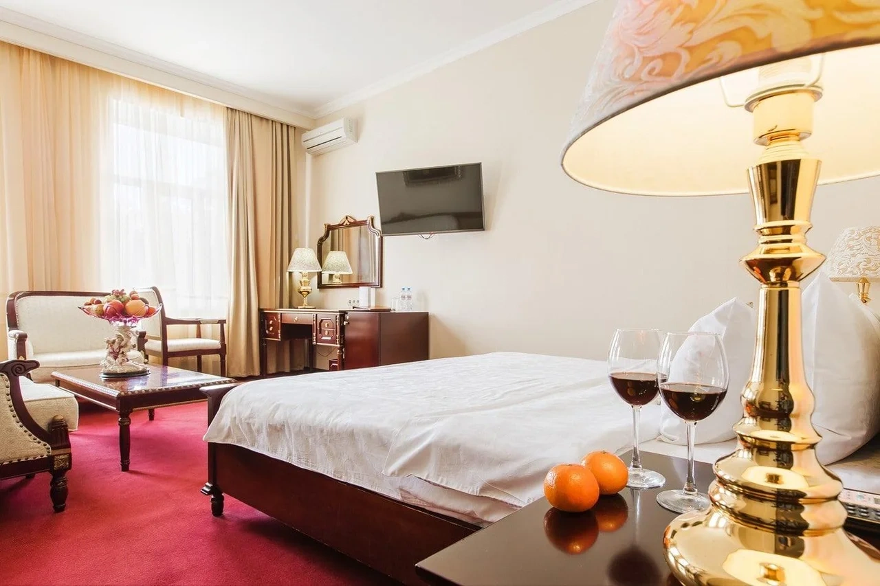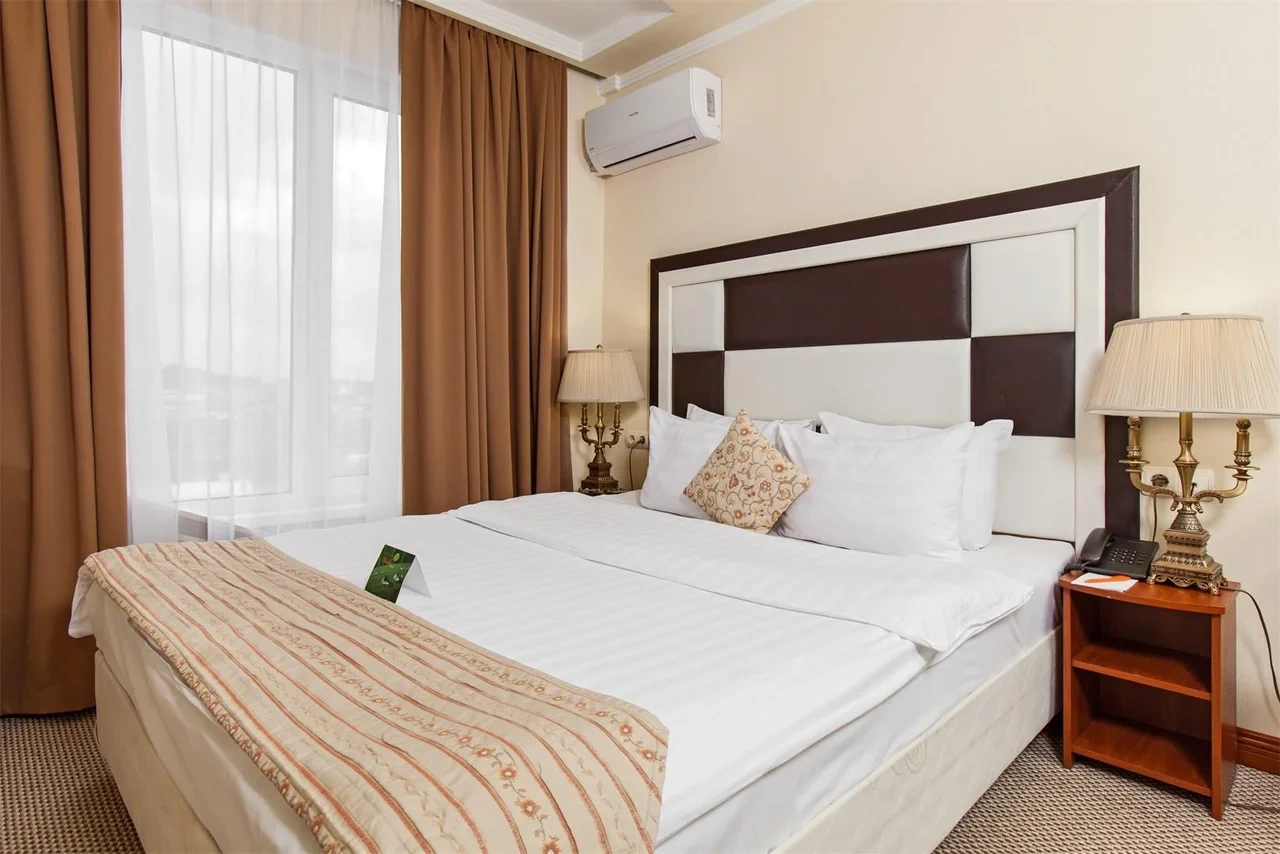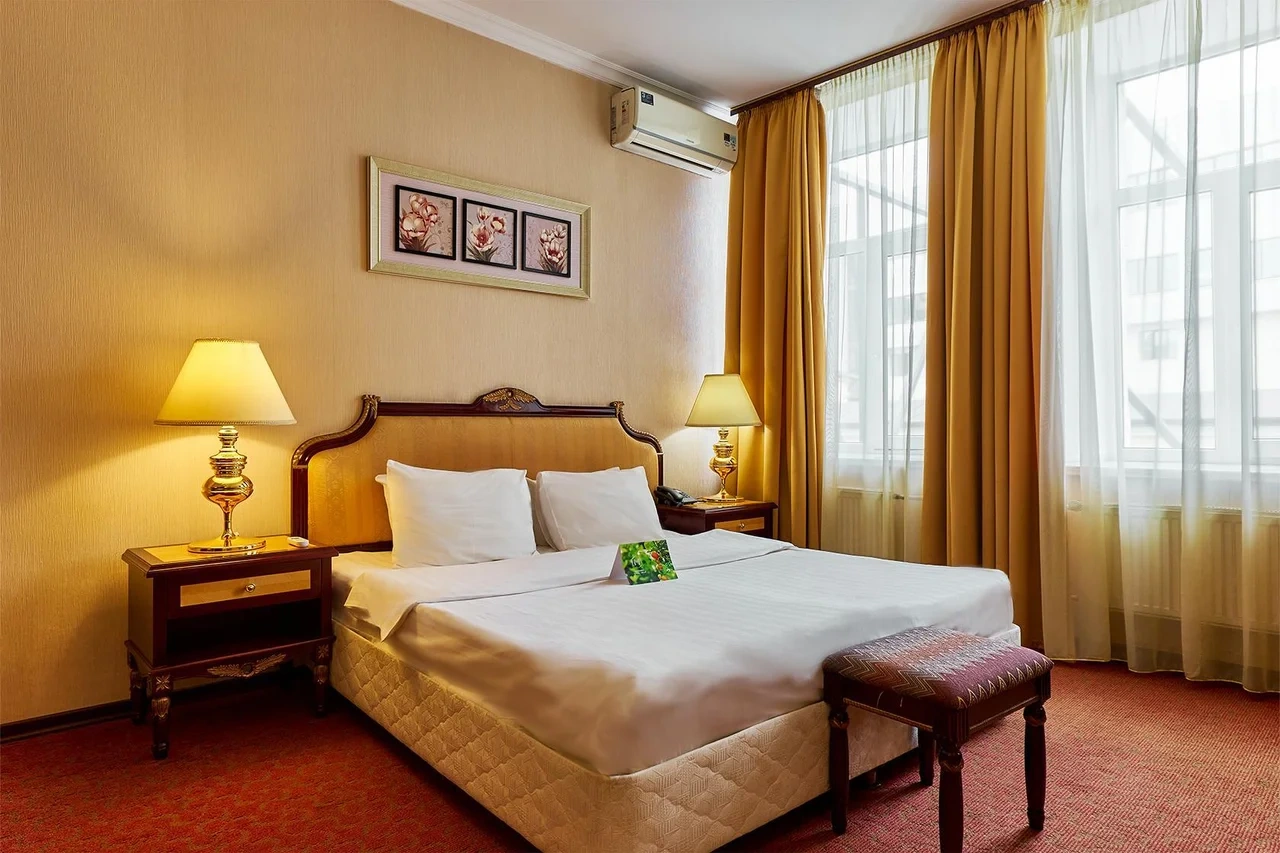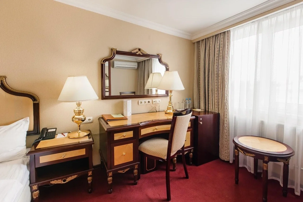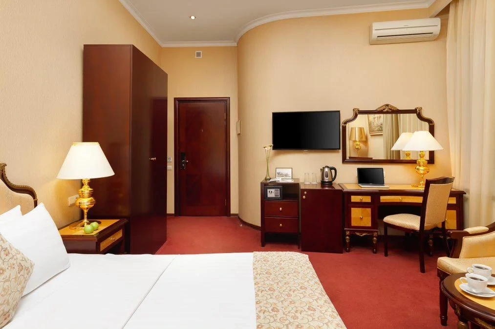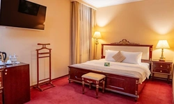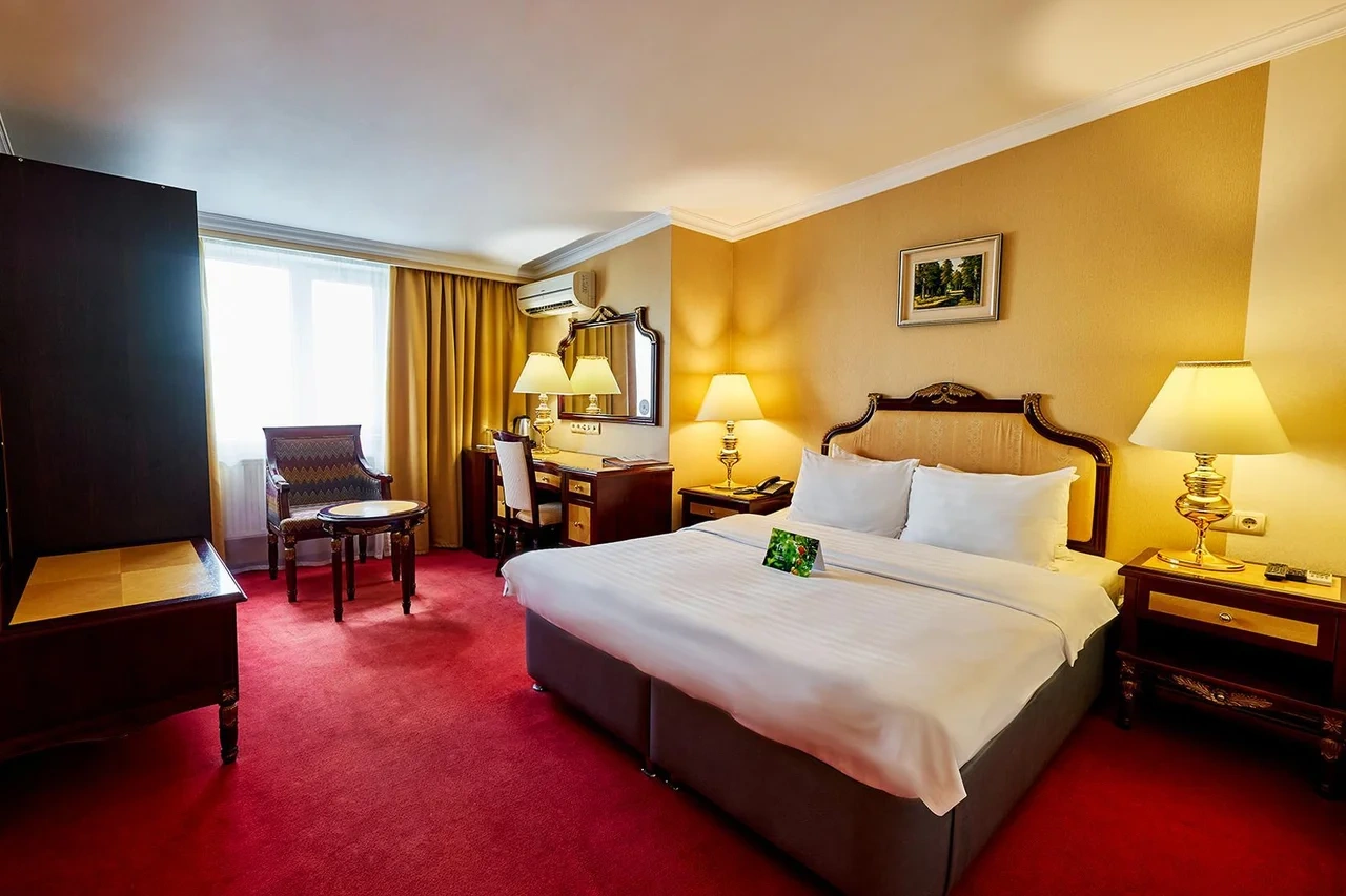 Шикарный номер категории «Делюкс» – оптимальный выбор для солидного человека, влюбленной пары, молодоженов. Просторный и комфортный, с тщательно продуманным интерьером — здесь есть все, что может понадобиться вам во время отдыха. Интерьер выдержан в приятной теплой гамме, которая располагает к спокойному отдыху после насыщенного дня. Широкая двухместная кровать размера «King Size» снабжена ортопедическим матрасом, который гарантирует великолепный сон, а современная система климат-контроля обеспечит оптимальную температуру и максимальный уют в номере. В номере есть удобный письменный стол и высокоскоростной Wi-Fi, а также индивидуальный сейф для ценных вещей и документов. Номера укомплектованы мини-баром, чайной станцией, телефоном, феном, гладильными принадлежностями и халатами. Ежедневно при жилой уборке происходит пополнение гигиенических принадлежностей, питьевой воды, чая и сахара. Мини-бар не входит в стоимость номера и оплачивается отдельно. Под запрос предоставляются косметический и бритвенный наборы. Окна номера выходят на тихую улицу, внутренний двор и на город, так что можете быть уверены: вашему отдыху не помешает шум.