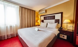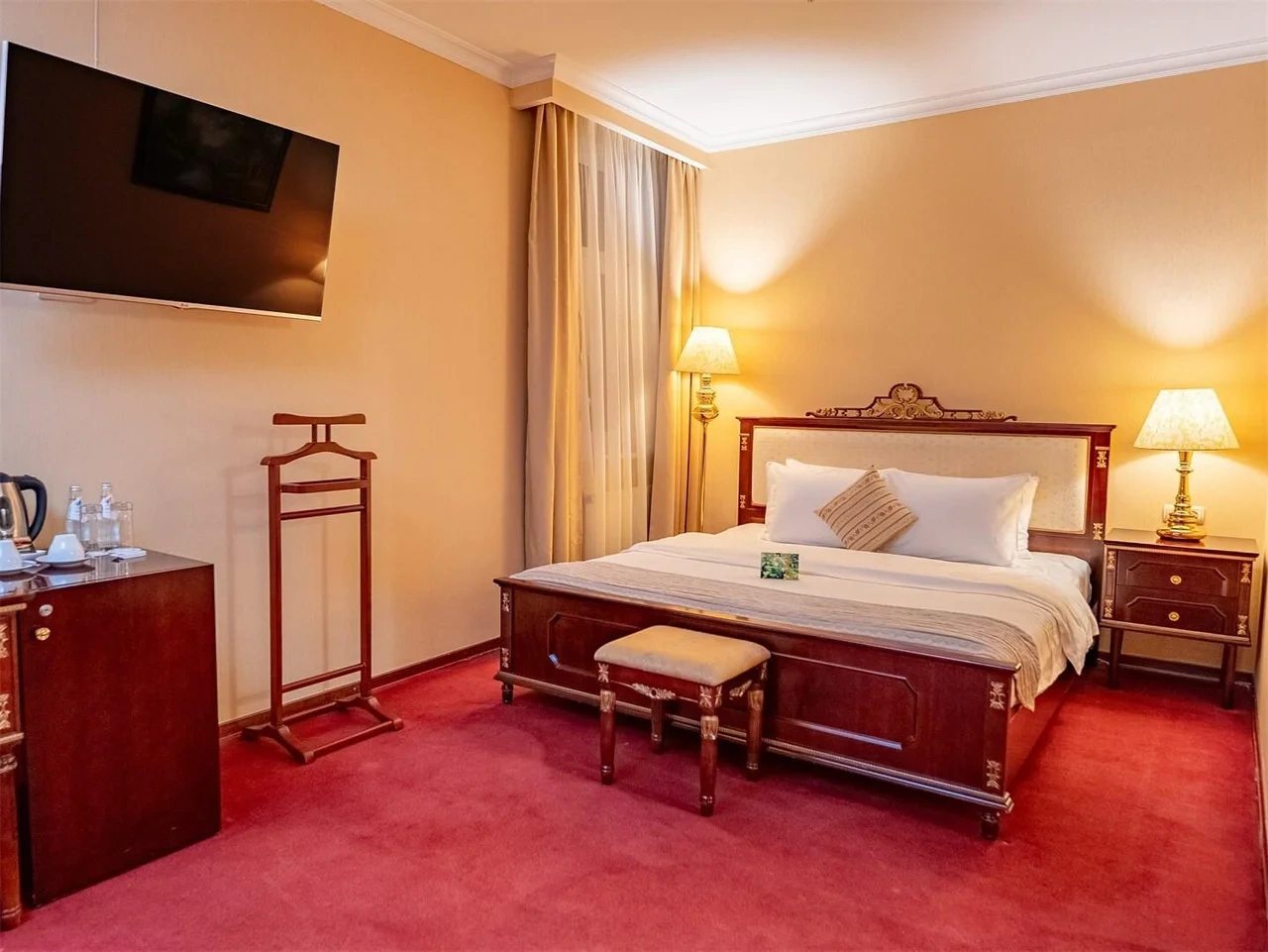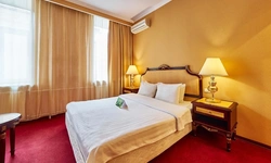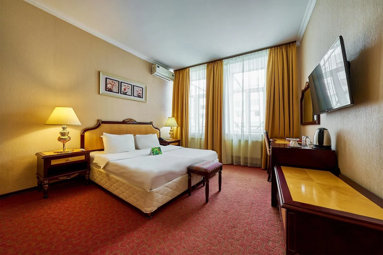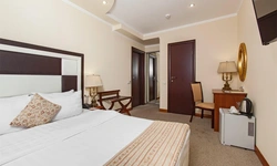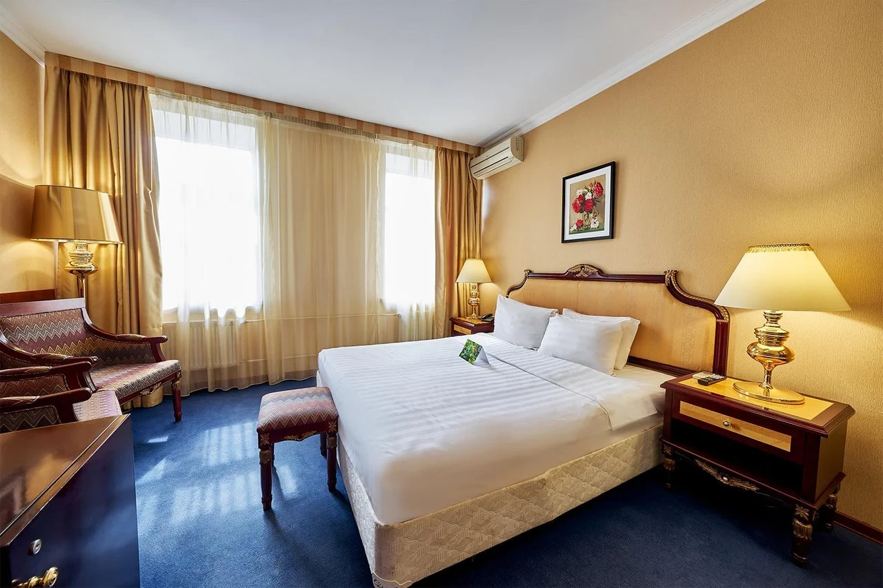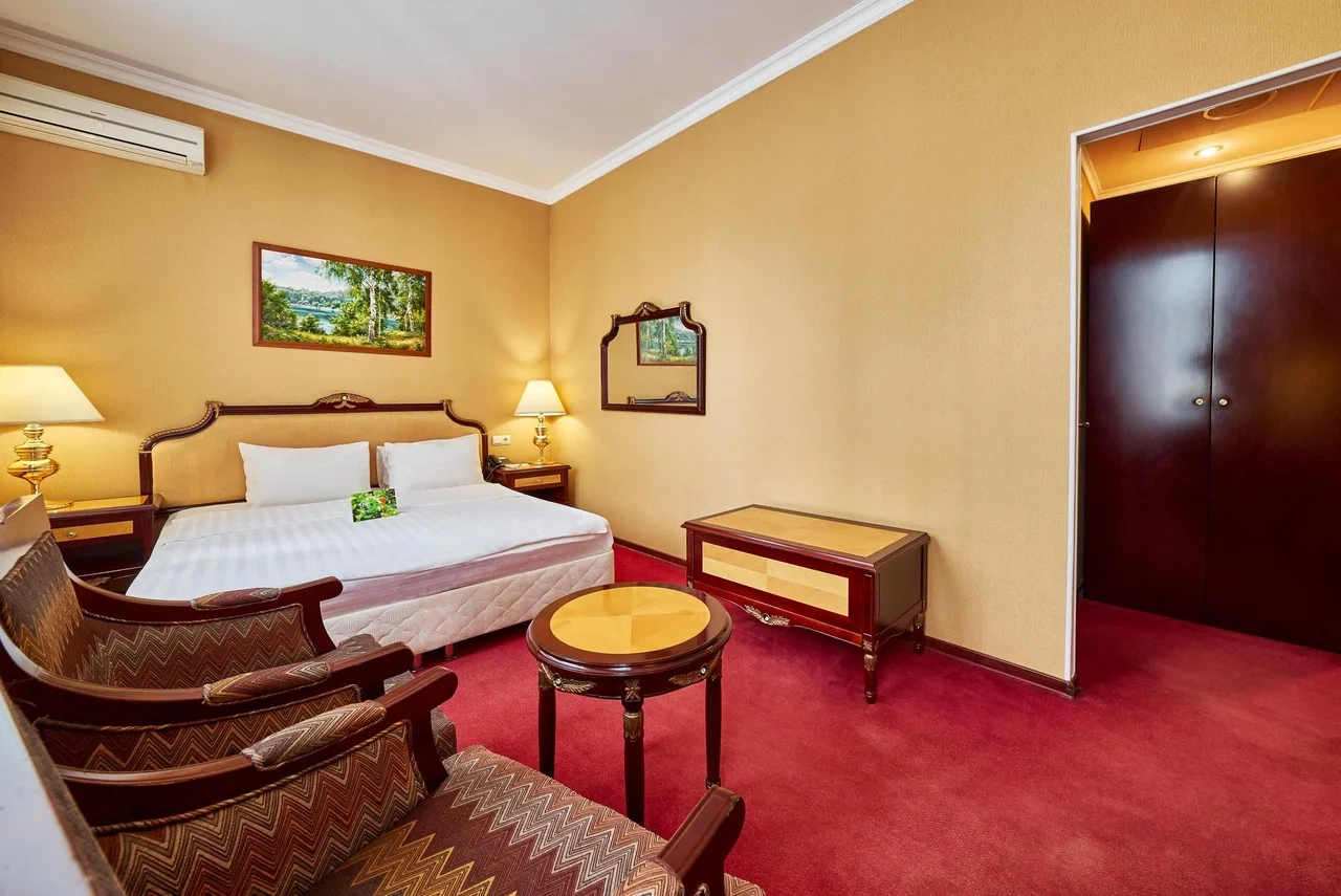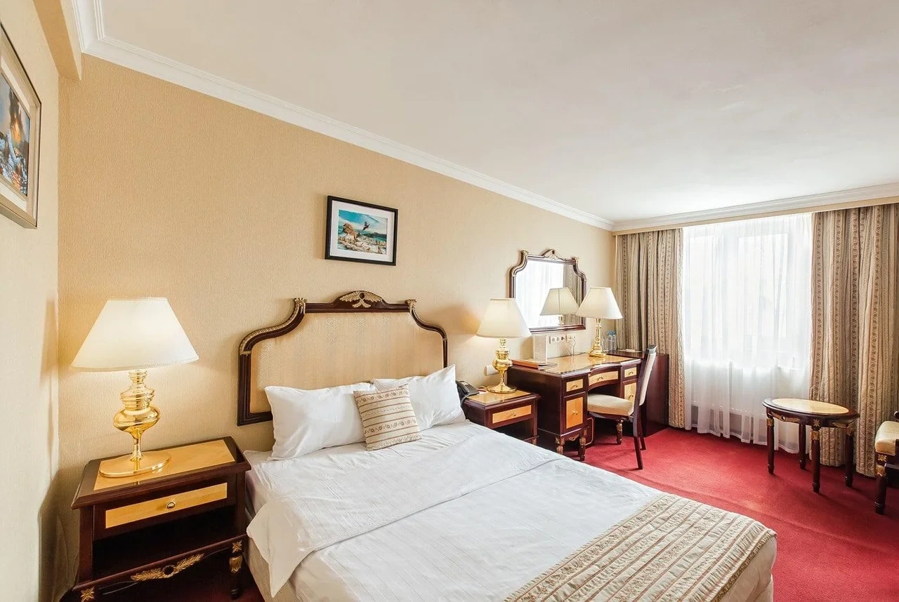 Шикарный номер категории «Делюкс» – оптимальный выбор для солидного человека, влюбленной пары, молодоженов. Просторный и комфортный, с тщательно продуманным интерьером — здесь есть все, что может понадобиться вам во время отдыха. Интерьер выдержан в приятной теплой гамме, которая располагает к спокойному отдыху после насыщенного дня. Широкая двухместная кровать размера «King Size» снабжена ортопедическим матрасом, который гарантирует великолепный сон, а современная система климат-контроля обеспечит оптимальную температуру и максимальный уют в номере. В номере есть удобный письменный стол и высокоскоростной Wi-Fi, а также индивидуальный сейф для ценных вещей и документов. Номера укомплектованы мини-баром, чайной станцией, телефоном, феном, гладильными принадлежностями и халатами. Ежедневно при жилой уборке происходит пополнение гигиенических принадлежностей, питьевой воды, чая и сахара. Мини-бар не входит в стоимость номера и оплачивается отдельно. Под запрос предоставляются косметический и бритвенный наборы. Окна номера выходят на тихую улицу, внутренний двор и на город, так что можете быть уверены: вашему отдыху не помешает шум.