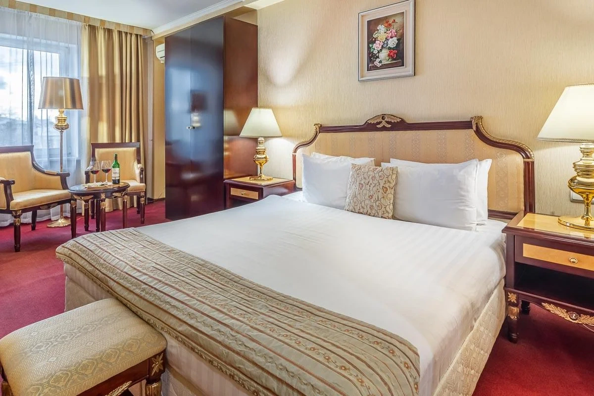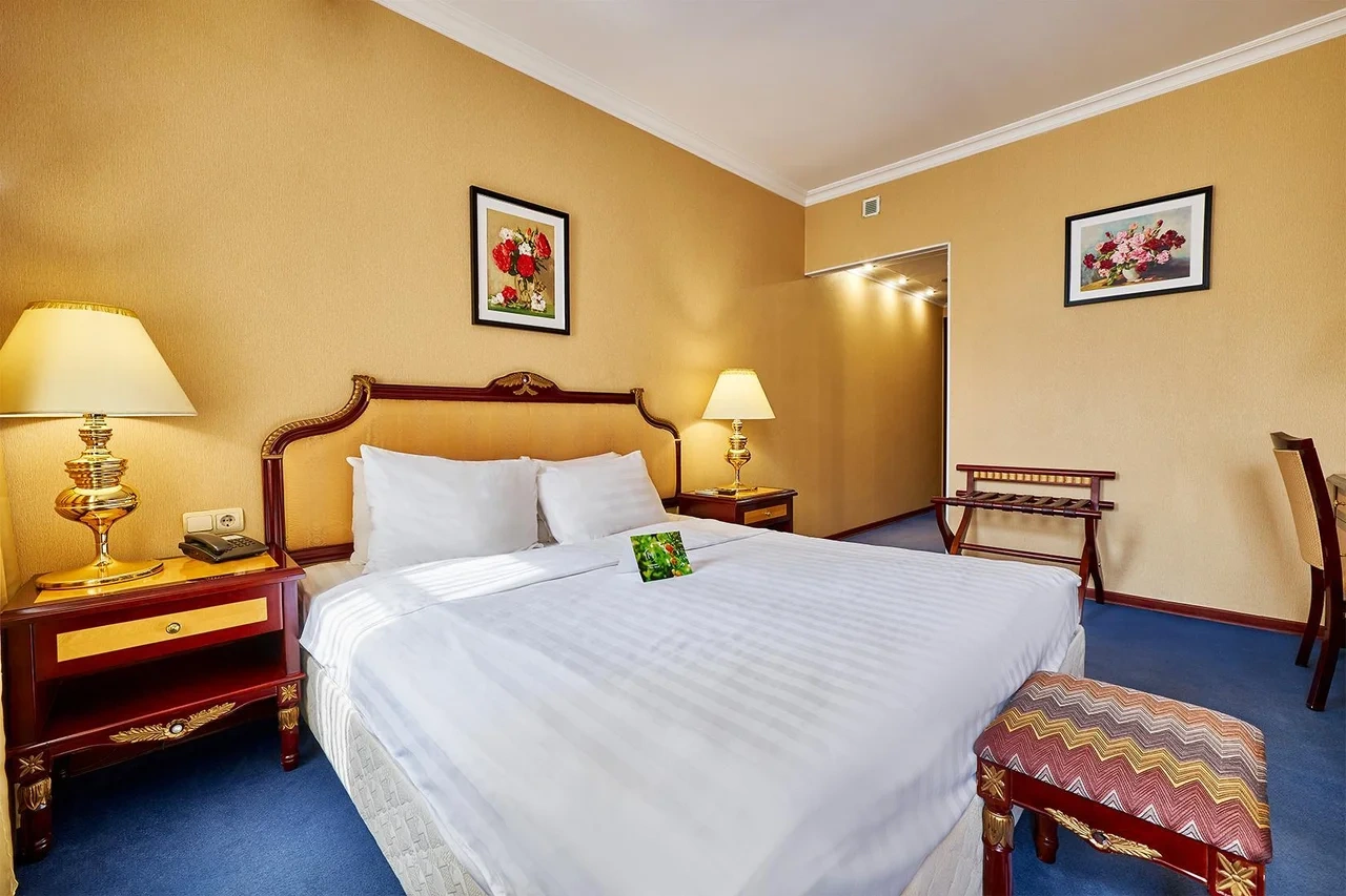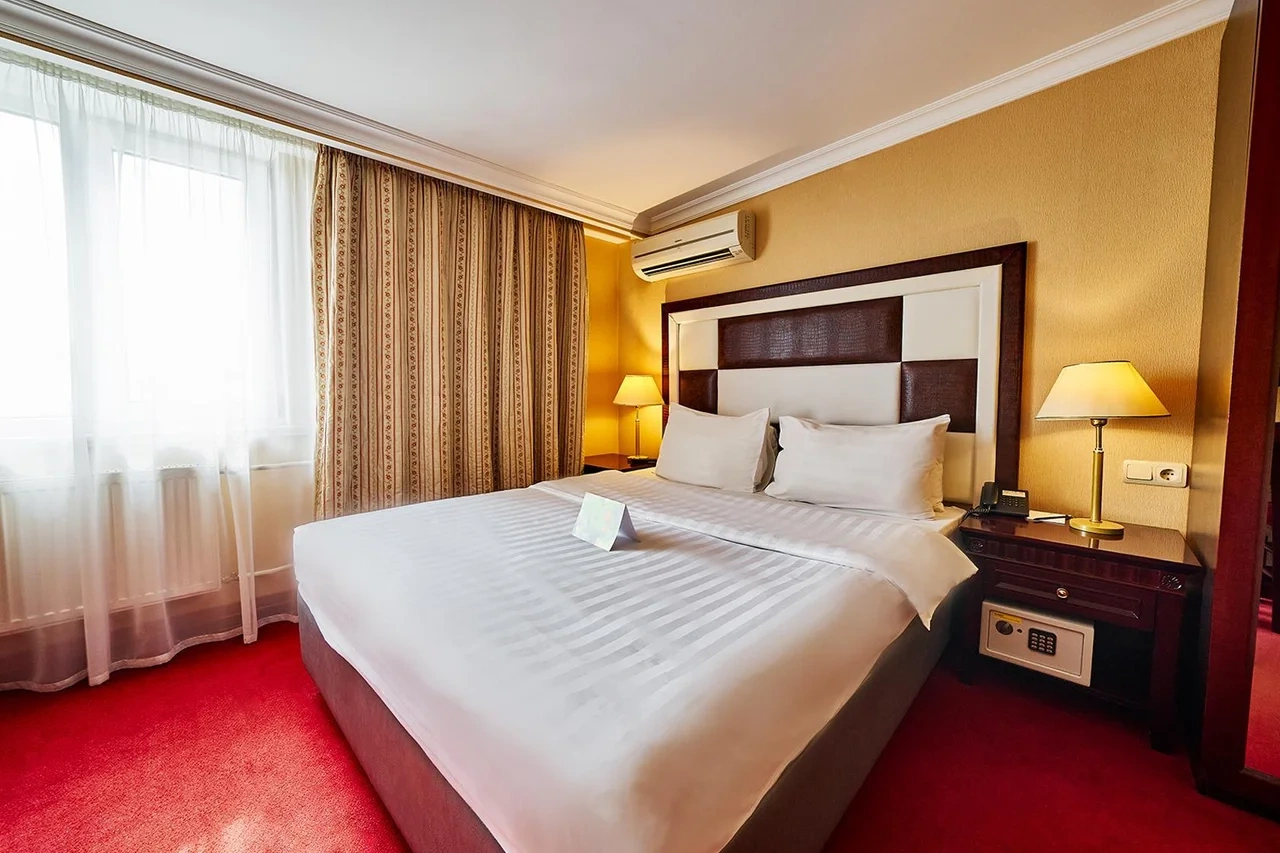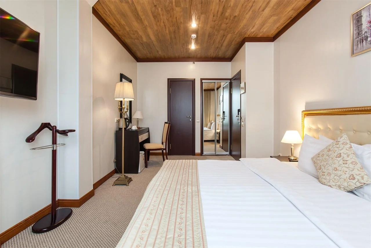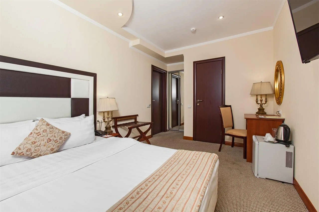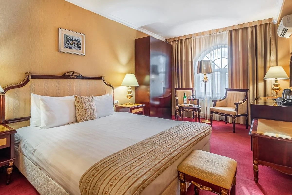 Шикарный номер категории «Делюкс» – оптимальный выбор для солидного человека, влюбленной пары, молодоженов. Просторный и комфортный, с тщательно продуманным интерьером — здесь есть все, что может понадобиться вам во время отдыха. Интерьер выдержан в приятной теплой гамме, которая располагает к спокойному отдыху после насыщенного дня. Широкая двухместная кровать размера «King Size» снабжена ортопедическим матрасом, который гарантирует великолепный сон, а современная система климат-контроля обеспечит оптимальную температуру и максимальный уют в номере. В номере есть удобный письменный стол и высокоскоростной Wi-Fi, а также индивидуальный сейф для ценных вещей и документов. Номера укомплектованы мини-баром, чайной станцией, телефоном, феном, гладильными принадлежностями и халатами. Ежедневно при жилой уборке происходит пополнение гигиенических принадлежностей, питьевой воды, чая и сахара. Мини-бар не входит в стоимость номера и оплачивается отдельно. Под запрос предоставляются косметический и бритвенный наборы. Окна номера выходят на тихую улицу, внутренний двор и на город, так что можете быть уверены: вашему отдыху не помешает шум.