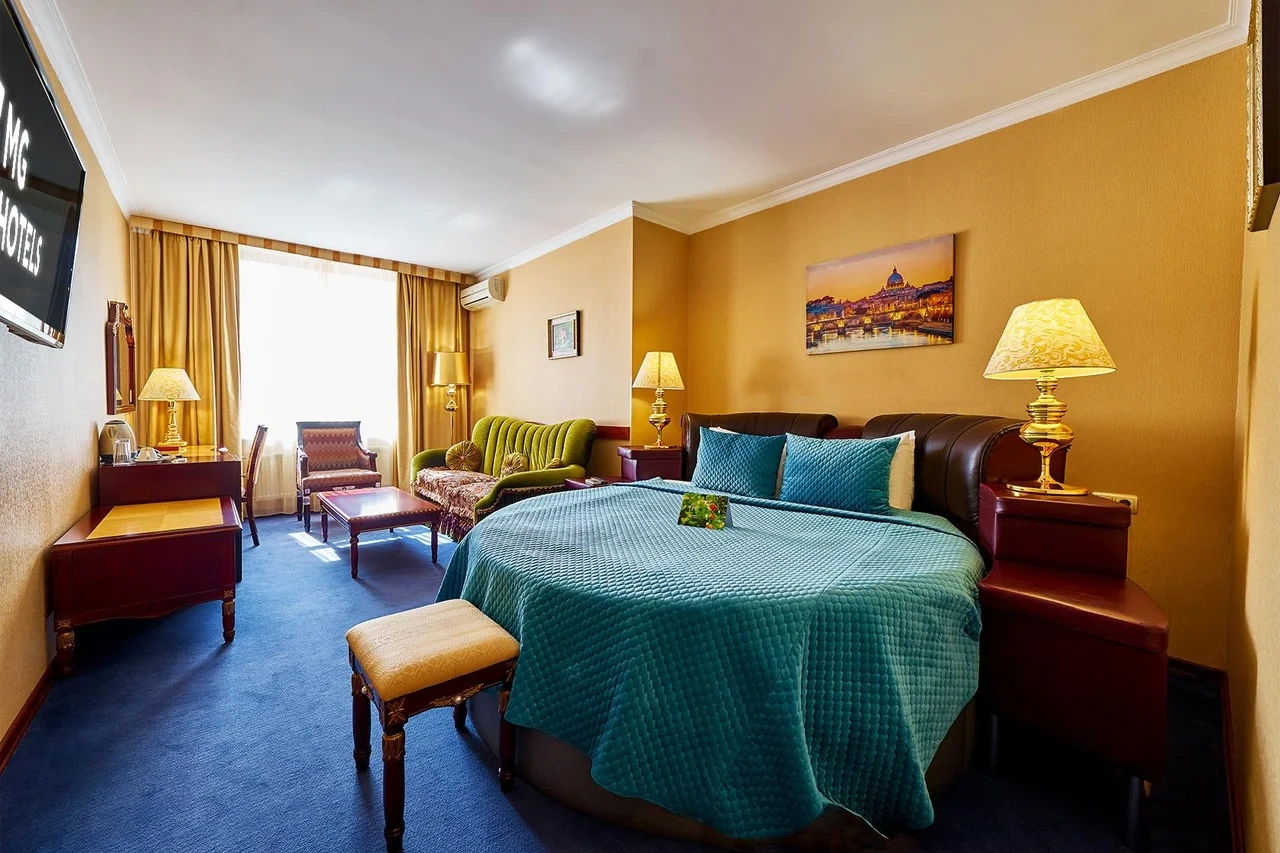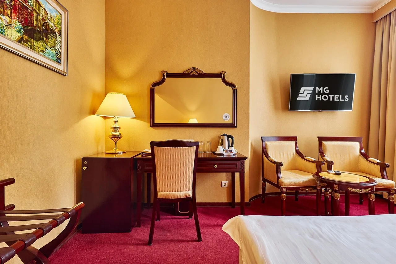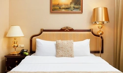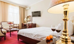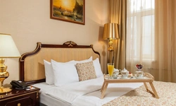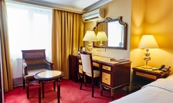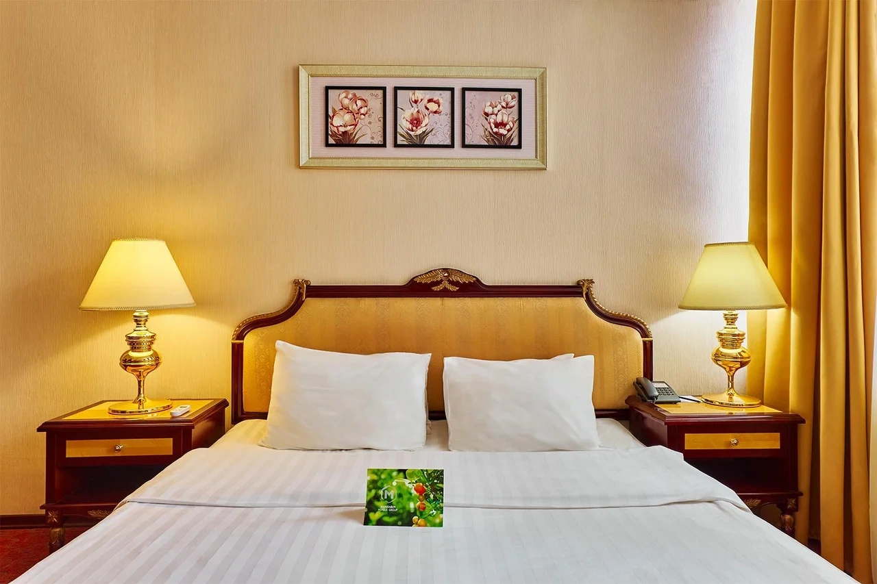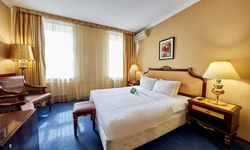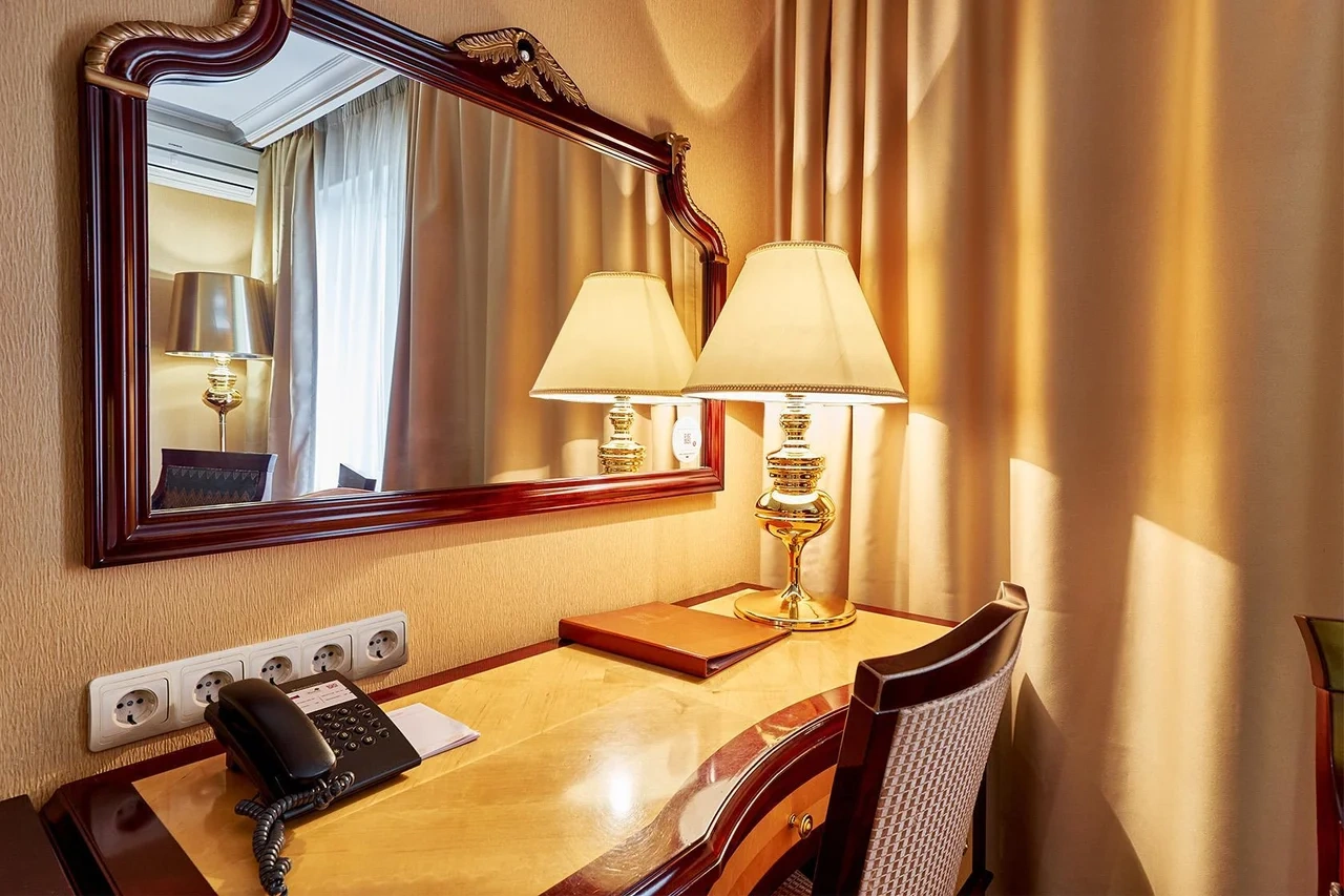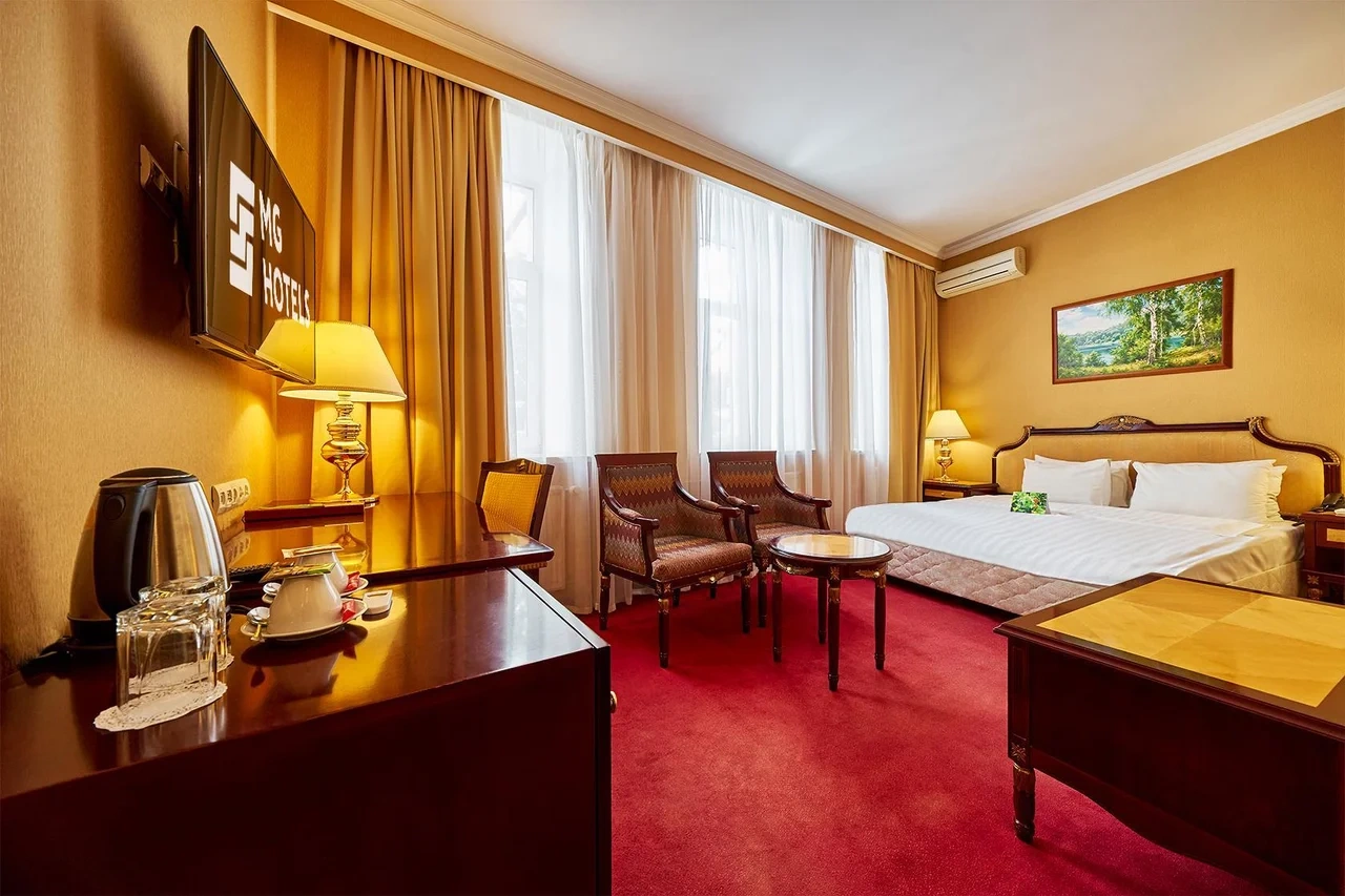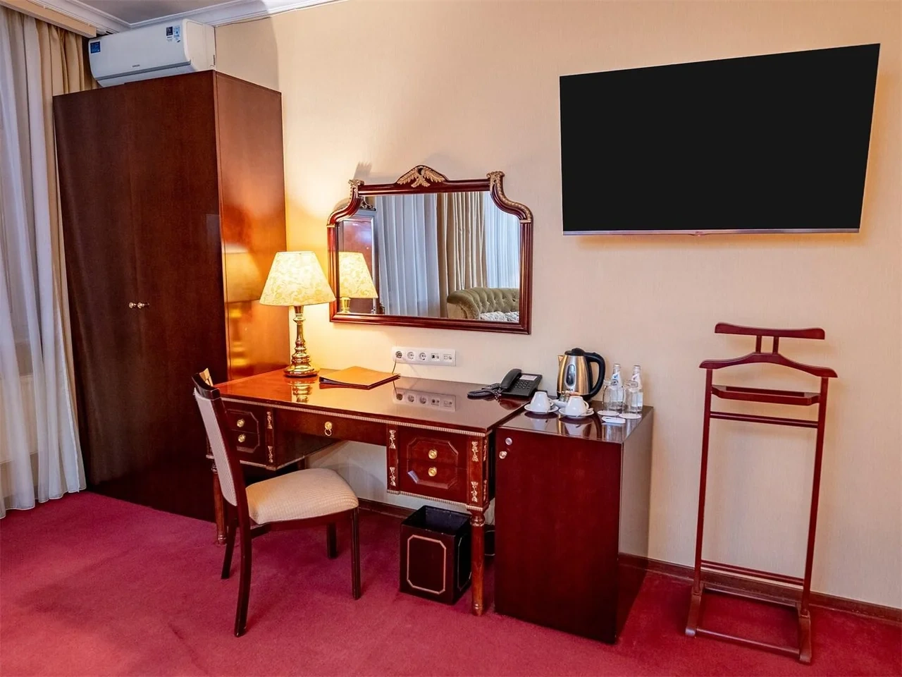 Шикарный номер категории «Делюкс» – оптимальный выбор для солидного человека, влюбленной пары, молодоженов. Просторный и комфортный, с тщательно продуманным интерьером — здесь есть все, что может понадобиться вам во время отдыха. Интерьер выдержан в приятной теплой гамме, которая располагает к спокойному отдыху после насыщенного дня. Широкая двухместная кровать размера «King Size» снабжена ортопедическим матрасом, который гарантирует великолепный сон, а современная система климат-контроля обеспечит оптимальную температуру и максимальный уют в номере. В номере есть удобный письменный стол и высокоскоростной Wi-Fi, а также индивидуальный сейф для ценных вещей и документов. Номера укомплектованы мини-баром, чайной станцией, телефоном, феном, гладильными принадлежностями и халатами. Ежедневно при жилой уборке происходит пополнение гигиенических принадлежностей, питьевой воды, чая и сахара. Мини-бар не входит в стоимость номера и оплачивается отдельно. Под запрос предоставляются косметический и бритвенный наборы. Окна номера выходят на тихую улицу, внутренний двор и на город, так что можете быть уверены: вашему отдыху не помешает шум.