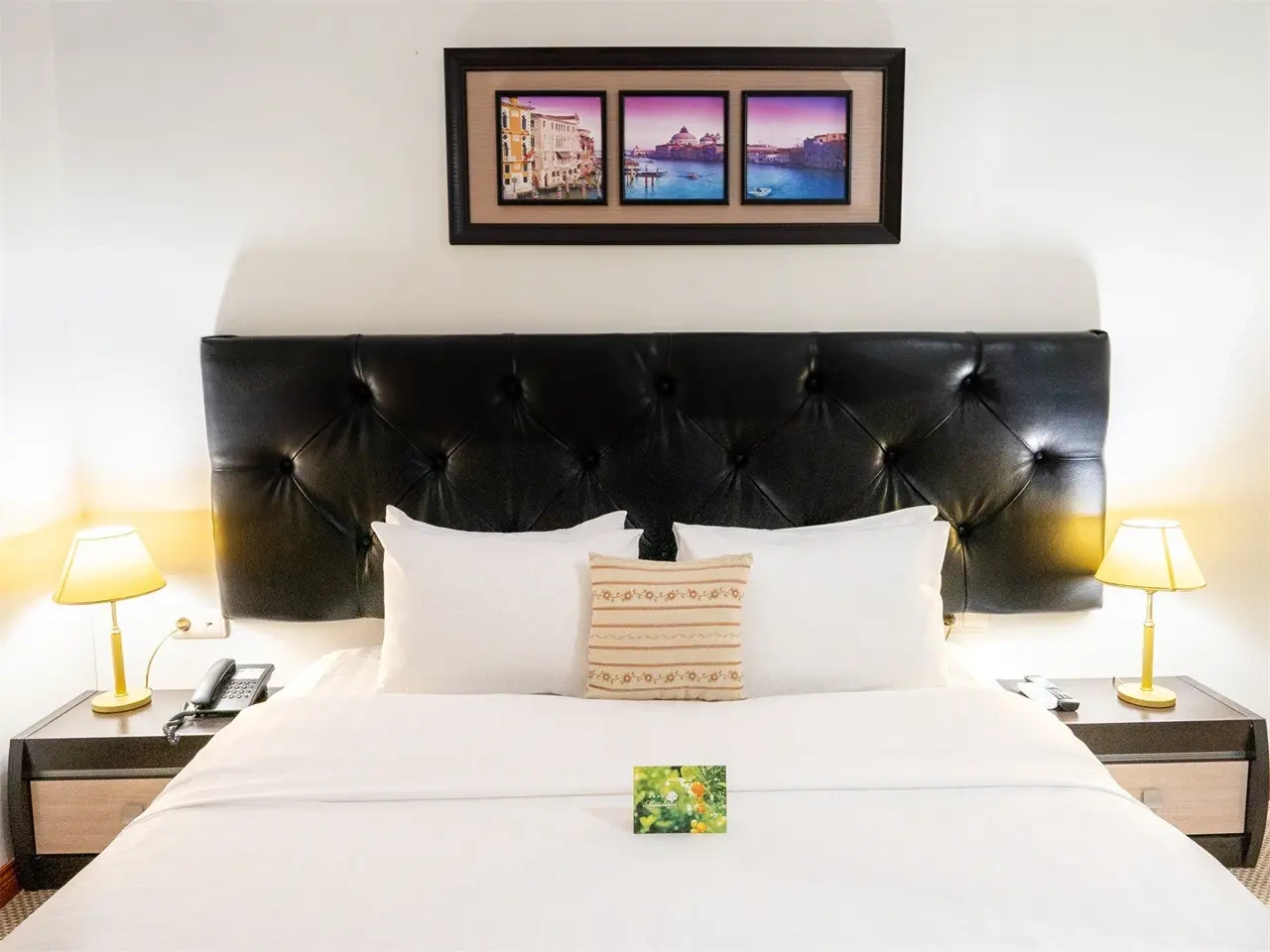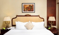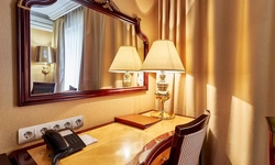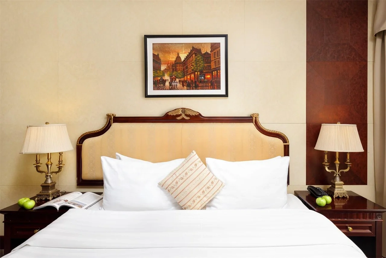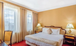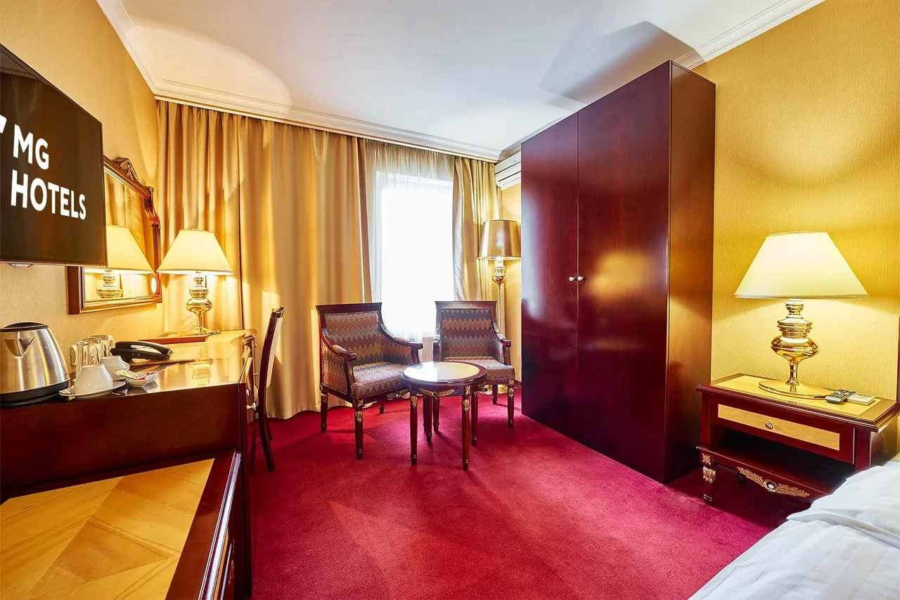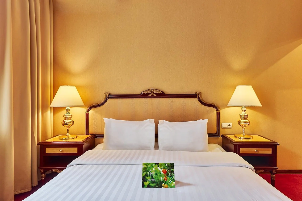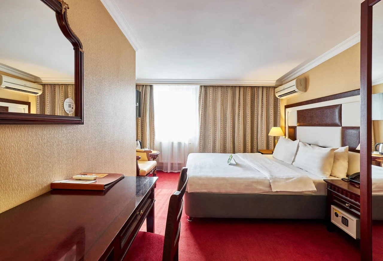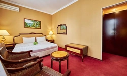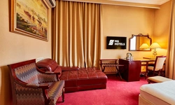 Шикарный номер категории «Делюкс» – оптимальный выбор для солидного человека, влюбленной пары, молодоженов. Просторный и комфортный, с тщательно продуманным интерьером — здесь есть все, что может понадобиться вам во время отдыха. Интерьер выдержан в приятной теплой гамме, которая располагает к спокойному отдыху после насыщенного дня. Широкая двухместная кровать размера «King Size» снабжена ортопедическим матрасом, который гарантирует великолепный сон, а современная система климат-контроля обеспечит оптимальную температуру и максимальный уют в номере. В номере есть удобный письменный стол и высокоскоростной Wi-Fi, а также индивидуальный сейф для ценных вещей и документов. Номера укомплектованы мини-баром, чайной станцией, телефоном, феном, гладильными принадлежностями и халатами. Ежедневно при жилой уборке происходит пополнение гигиенических принадлежностей, питьевой воды, чая и сахара. Мини-бар не входит в стоимость номера и оплачивается отдельно. Под запрос предоставляются косметический и бритвенный наборы. Окна номера выходят на тихую улицу, внутренний двор и на город, так что можете быть уверены: вашему отдыху не помешает шум.