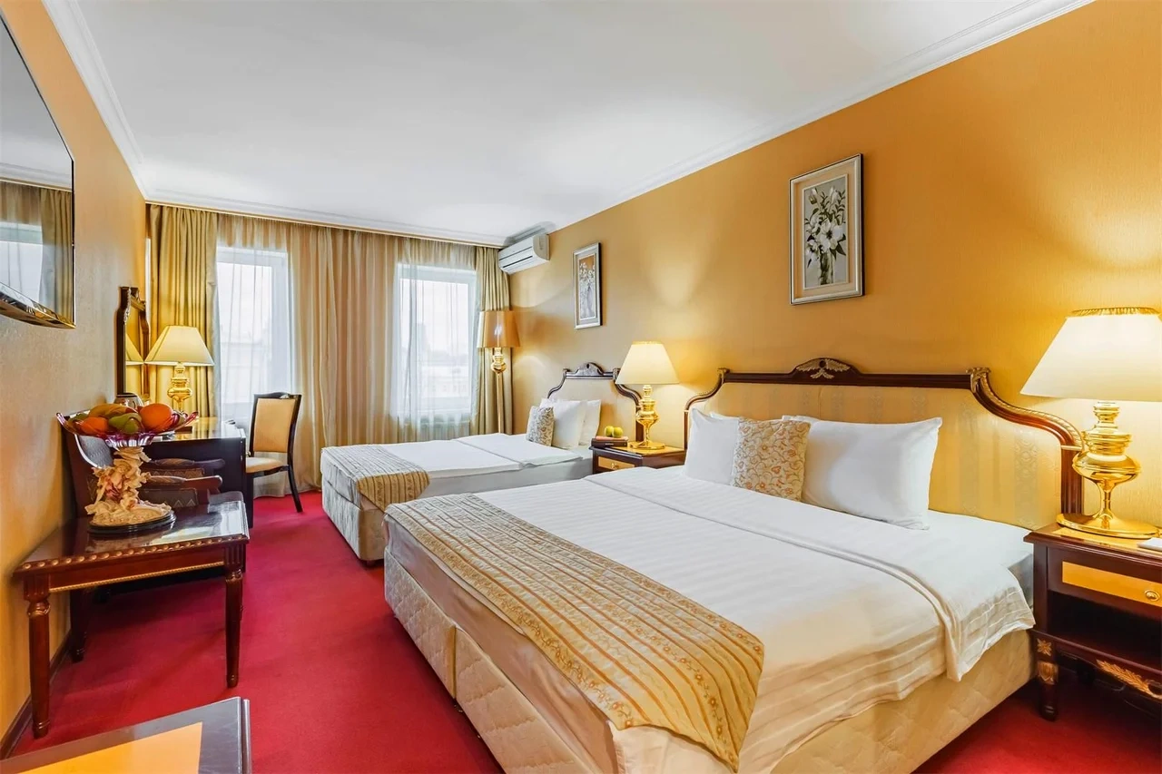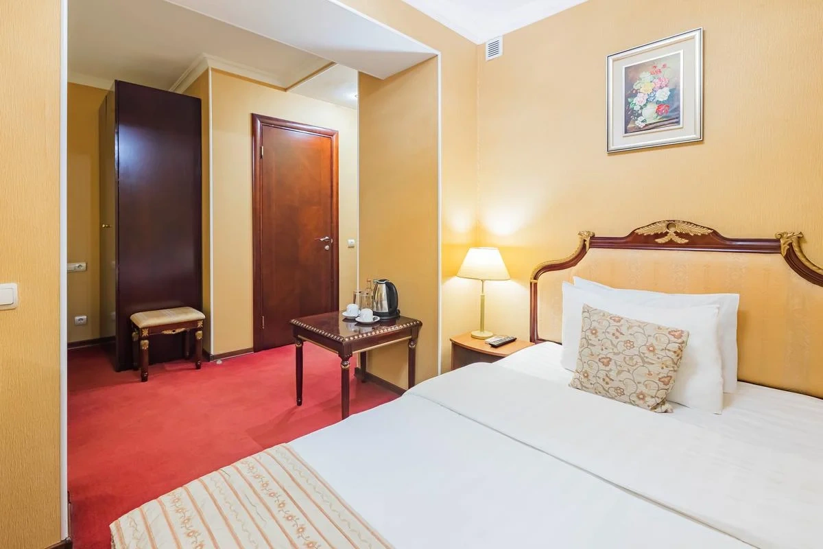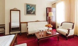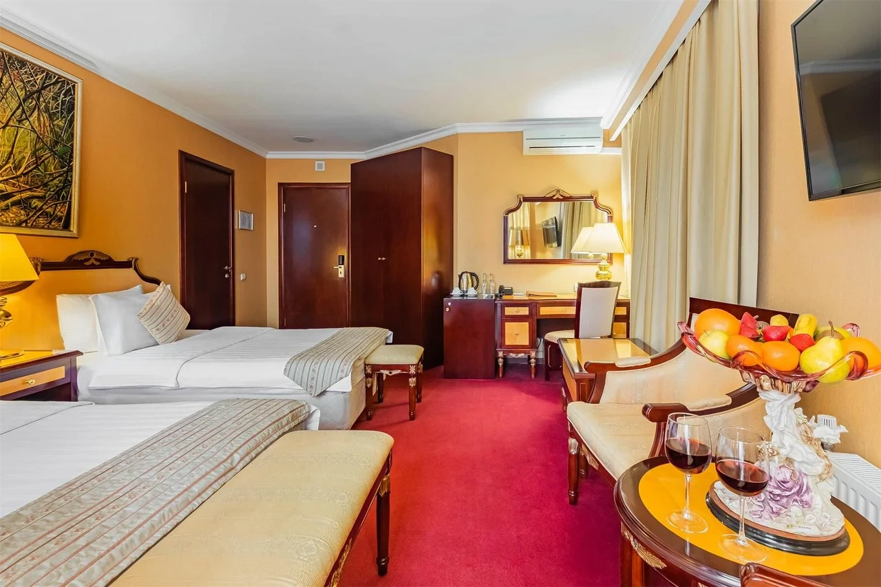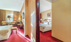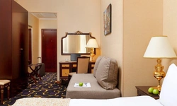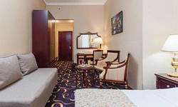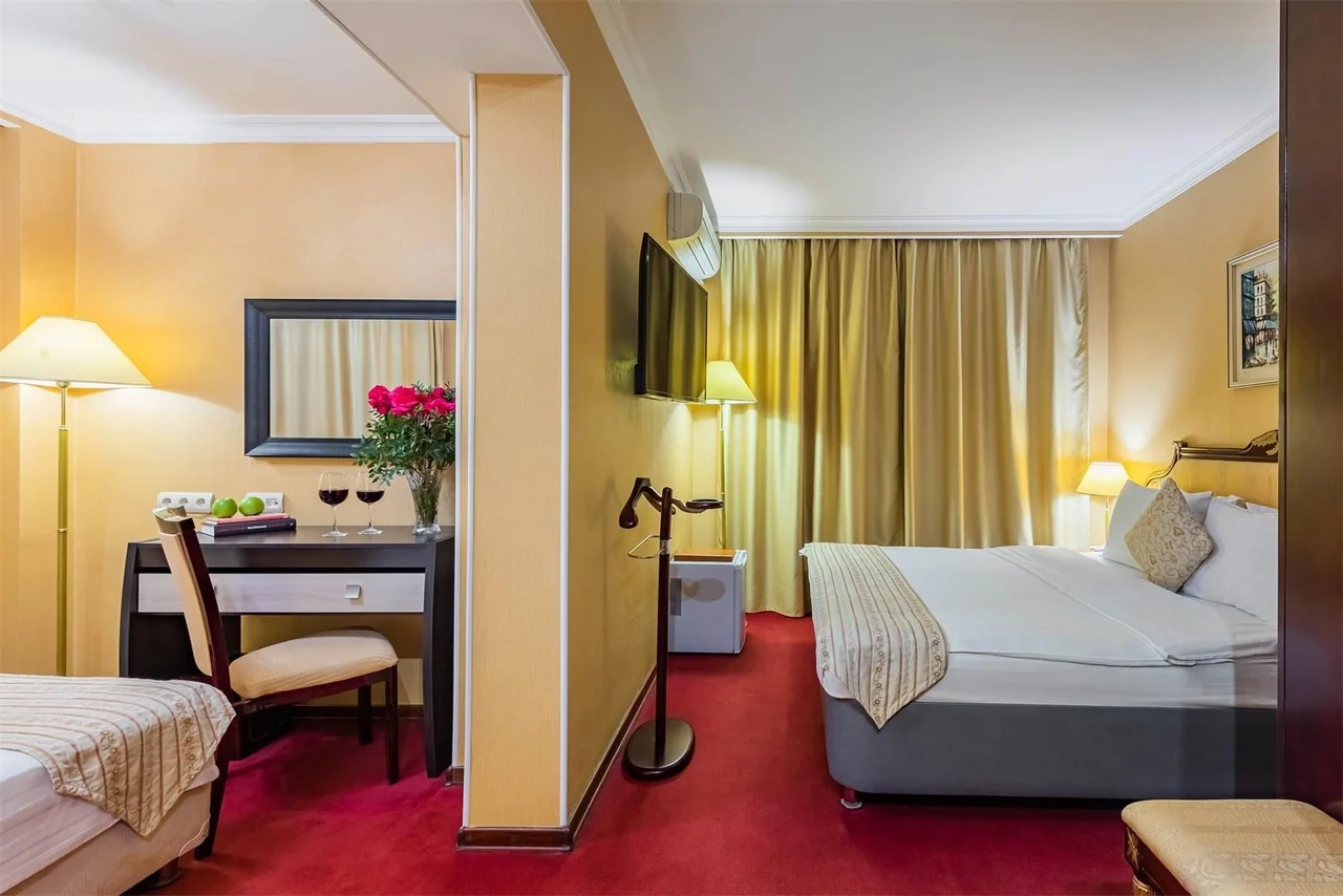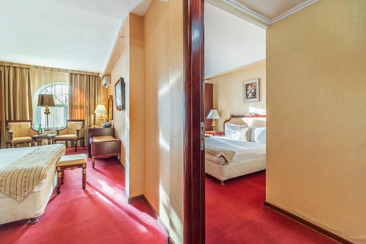 Просторный «семейный» двухкомнатный номер с двумя комфортными кроватями размера «King size» — оптимальный вариант размещения для семьи с детьми или небольшой компании до 6 человек. Интерьер выдержан в элегантных, золотисто-бежевых и винных оттенках, располагает к комфортному отдыху. Удобные кровати оснащены ортопедическими матрасами. Если вам понадобится поработать — можно воспользоваться удобным столом в рабочей зоне. Уходя на прогулку, вы можете оставить документы и ценности в мини-сейфе. В номере есть телевизор с интерактивным спутниковым ТВ, высокоскоростной интернет. Также номер укомплектованы мини-баром, чайной станцией, телефоном, феном, гладильными принадлежностями и халатами. Ежедневно при жилой уборке происходит пополнение гигиенических принадлежностей, питьевой воды, чая и сахара. Мини-бар не входит в стоимость номера и оплачивается отдельно. Под запрос предоставляются косметический и бритвенный наборы. Окна номера выходят во внутренний двор, так что можете быть уверены: вашему отдыху не помешает шум.