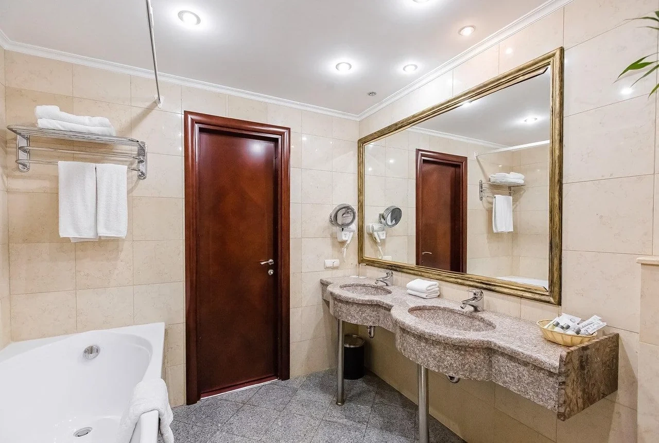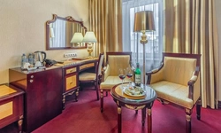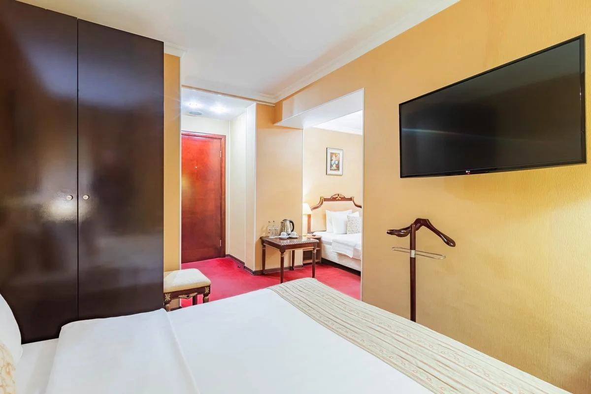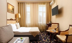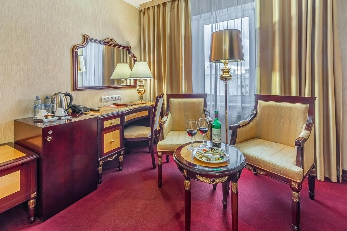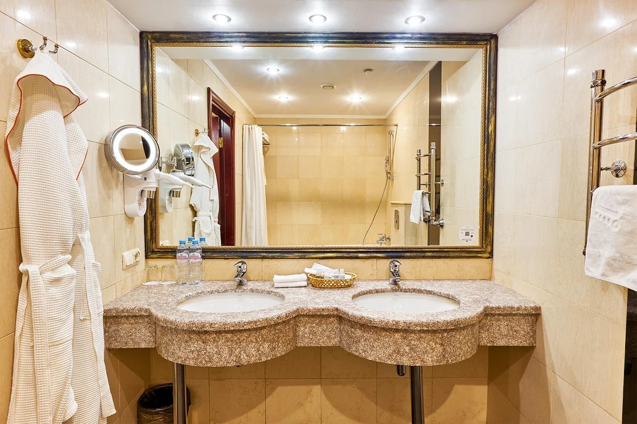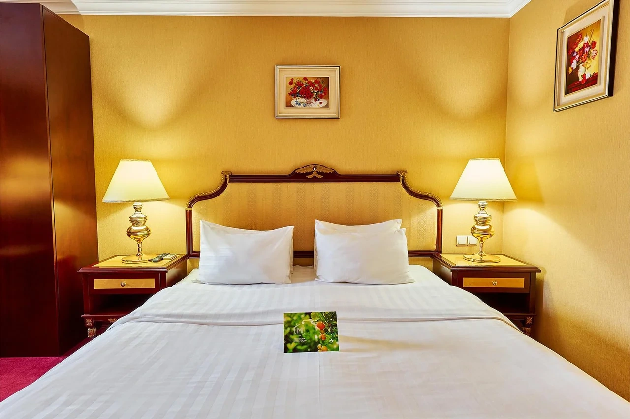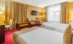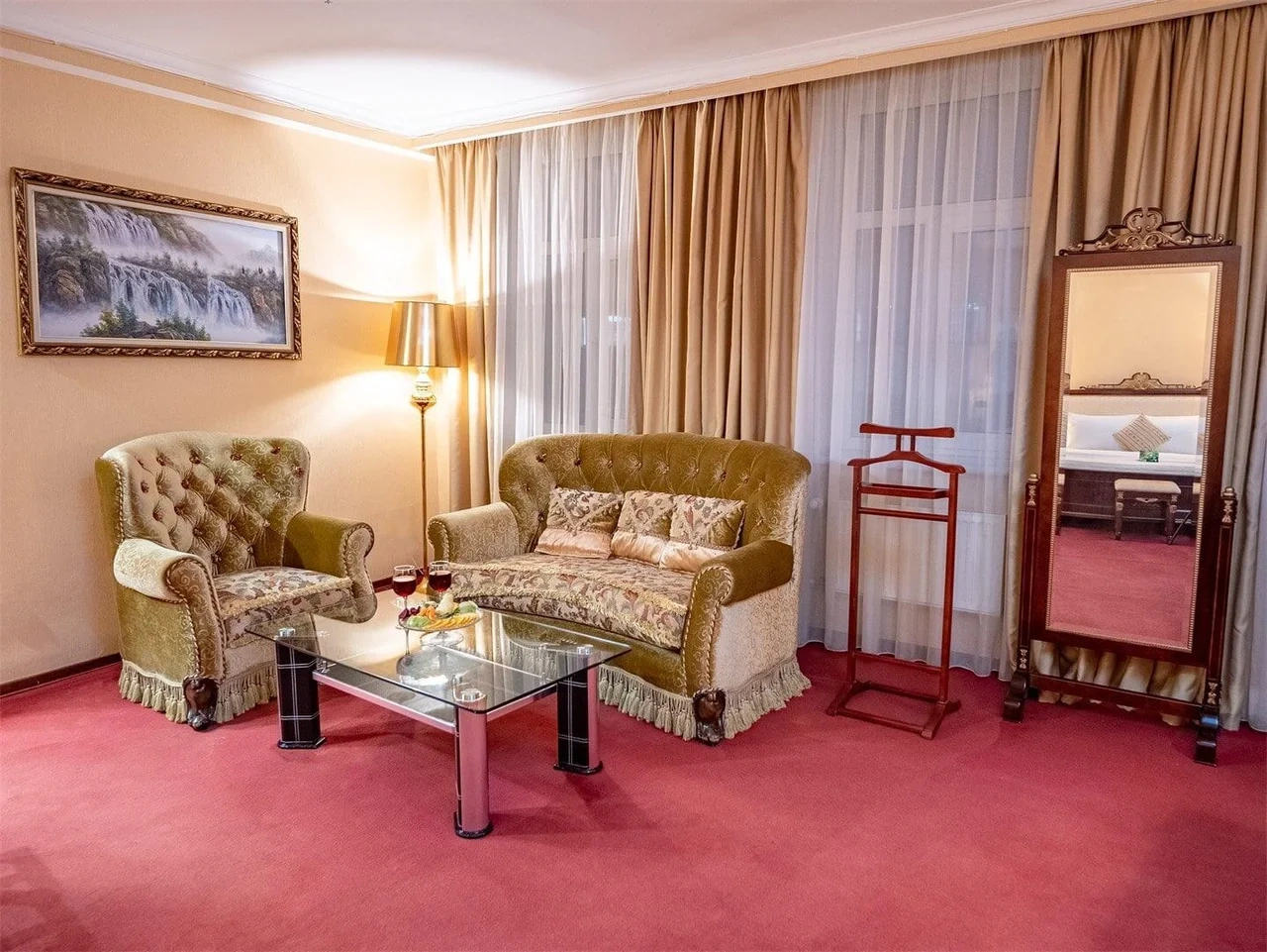 Просторный «семейный» двухкомнатный номер с двумя комфортными кроватями размера «King size» — оптимальный вариант размещения для семьи с детьми или небольшой компании до 6 человек. Интерьер выдержан в элегантных, золотисто-бежевых и винных оттенках, располагает к комфортному отдыху. Удобные кровати оснащены ортопедическими матрасами. Если вам понадобится поработать — можно воспользоваться удобным столом в рабочей зоне. Уходя на прогулку, вы можете оставить документы и ценности в мини-сейфе. В номере есть телевизор с интерактивным спутниковым ТВ, высокоскоростной интернет. Также номер укомплектованы мини-баром, чайной станцией, телефоном, феном, гладильными принадлежностями и халатами. Ежедневно при жилой уборке происходит пополнение гигиенических принадлежностей, питьевой воды, чая и сахара. Мини-бар не входит в стоимость номера и оплачивается отдельно. Под запрос предоставляются косметический и бритвенный наборы. Окна номера выходят во внутренний двор, так что можете быть уверены: вашему отдыху не помешает шум.