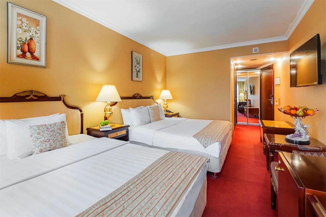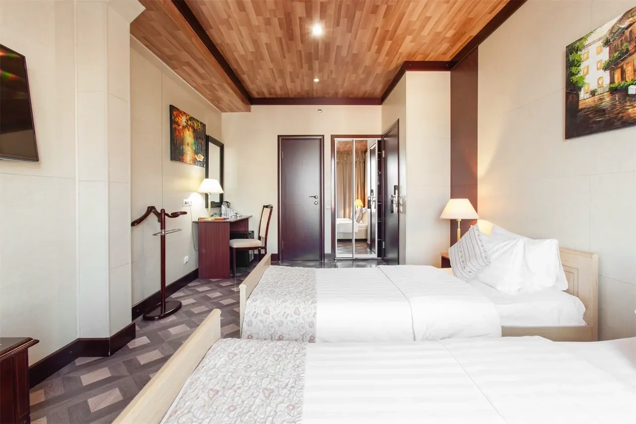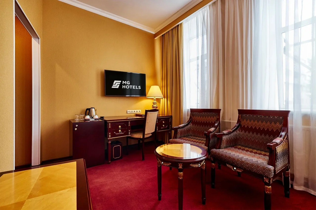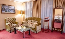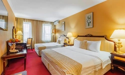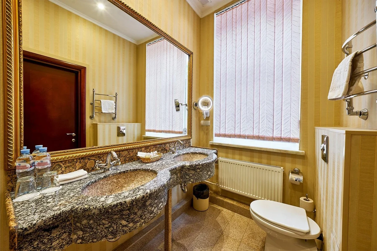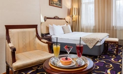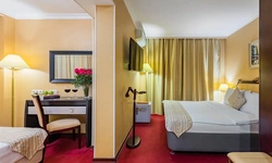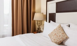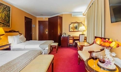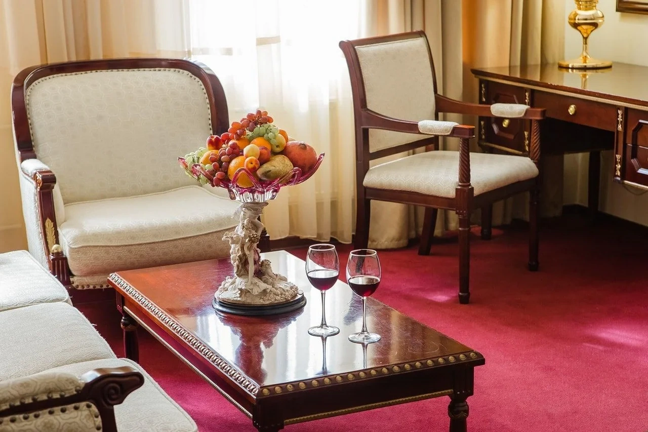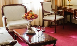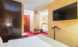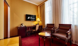 Просторный «семейный» двухкомнатный номер с двумя комфортными кроватями размера «King size» — оптимальный вариант размещения для семьи с детьми или небольшой компании до 6 человек. Интерьер выдержан в элегантных, золотисто-бежевых и винных оттенках, располагает к комфортному отдыху. Удобные кровати оснащены ортопедическими матрасами. Если вам понадобится поработать — можно воспользоваться удобным столом в рабочей зоне. Уходя на прогулку, вы можете оставить документы и ценности в мини-сейфе. В номере есть телевизор с интерактивным спутниковым ТВ, высокоскоростной интернет. Также номер укомплектованы мини-баром, чайной станцией, телефоном, феном, гладильными принадлежностями и халатами. Ежедневно при жилой уборке происходит пополнение гигиенических принадлежностей, питьевой воды, чая и сахара. Мини-бар не входит в стоимость номера и оплачивается отдельно. Под запрос предоставляются косметический и бритвенный наборы. Окна номера выходят во внутренний двор, так что можете быть уверены: вашему отдыху не помешает шум.