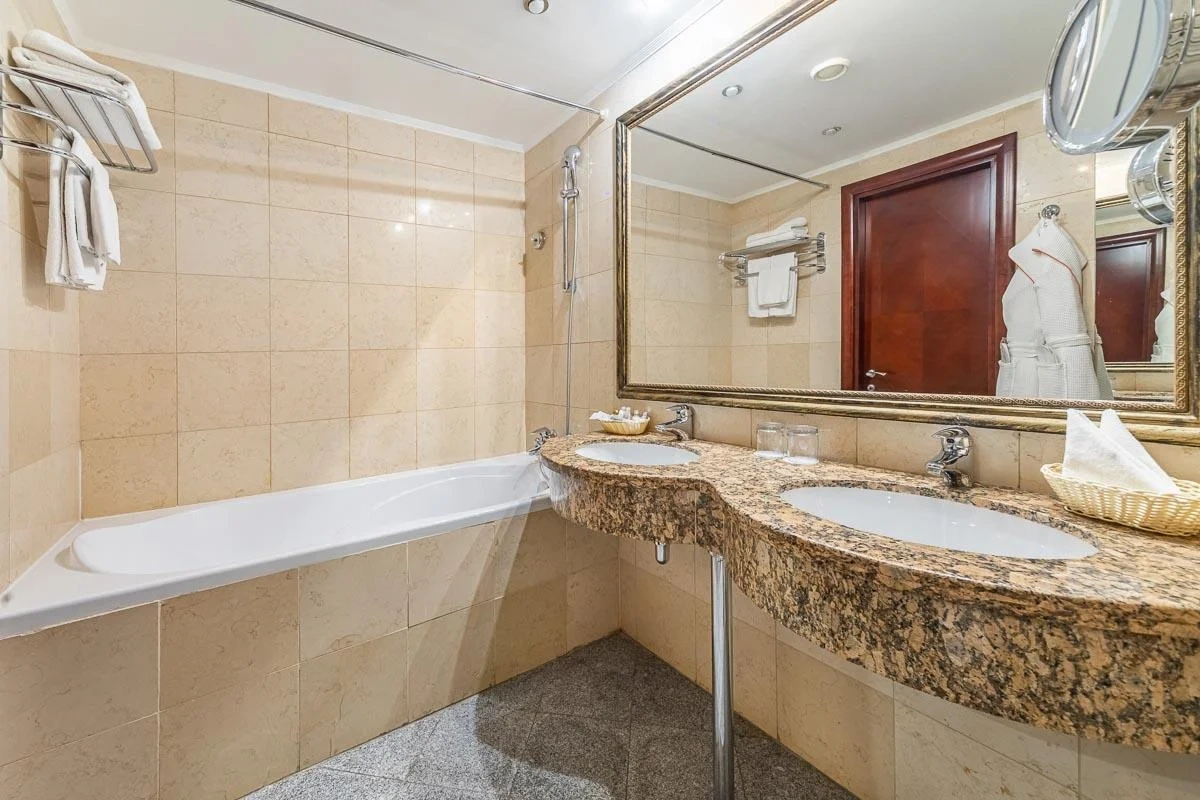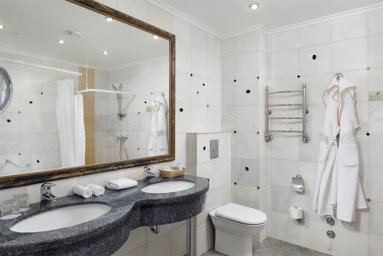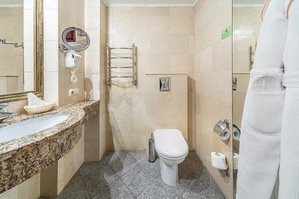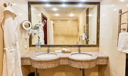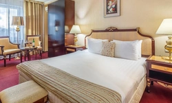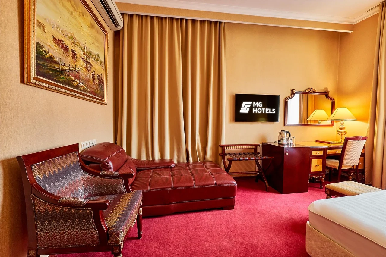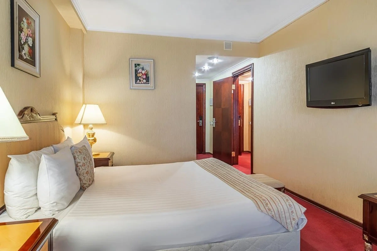 Просторный «семейный» двухкомнатный номер с двумя комфортными кроватями размера «King size» — оптимальный вариант размещения для семьи с детьми или небольшой компании до 6 человек. Интерьер выдержан в элегантных, золотисто-бежевых и винных оттенках, располагает к комфортному отдыху. Удобные кровати оснащены ортопедическими матрасами. Если вам понадобится поработать — можно воспользоваться удобным столом в рабочей зоне. Уходя на прогулку, вы можете оставить документы и ценности в мини-сейфе. В номере есть телевизор с интерактивным спутниковым ТВ, высокоскоростной интернет. Также номер укомплектованы мини-баром, чайной станцией, телефоном, феном, гладильными принадлежностями и халатами. Ежедневно при жилой уборке происходит пополнение гигиенических принадлежностей, питьевой воды, чая и сахара. Мини-бар не входит в стоимость номера и оплачивается отдельно. Под запрос предоставляются косметический и бритвенный наборы. Окна номера выходят во внутренний двор, так что можете быть уверены: вашему отдыху не помешает шум.