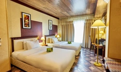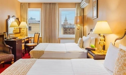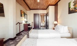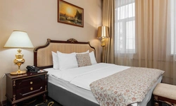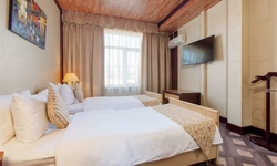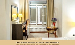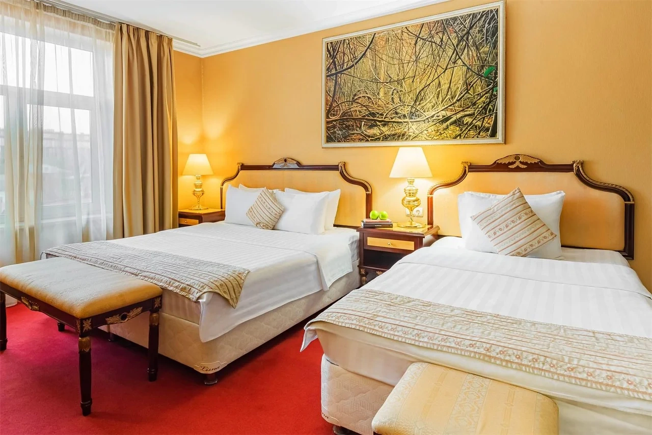 Просторный «семейный» номер с двумя комфортными кроватями — оптимальный вариант размещения для семьи с детьми или компании до 5 человек. Вариации кроватей: - 180х200 см и 140х200см; - 180х200 см и 120х200см; - 180х200 см и 90х200см. В номерах выделена гостиная зона с креслами и кофейным столиком. Если вам понадобится поработать — можно воспользоваться рабочей зоной с удобным письменным столом. Уходя на прогулку, вы можете оставить документы и ценности в мини-сейфе. В номере есть телевизор с интерактивным спутниковым ТВ, высокоскоростной интернет, мини-бар (не входит в стоимость номера и оплачивается отдельно), чайная станция, телефон, фен, гладильные принадлежности, халаты. Ежедневно при жилой уборке происходит пополнение гигиенических принадлежностей, питьевой воды, чая и сахара. Под запрос предоставляются косметический, бритвенный, швейный наборы. Окна номера выходят во внутренний двор, улицу либо атриум отеля. Дополнительные услуги (услуги прачечной, мини бар и т. д.) в стоимость не входят. За дополнительную плату (2000 руб/сутки) в номере возможно установить дополнительную кровать (питание оплачивается отдельно).