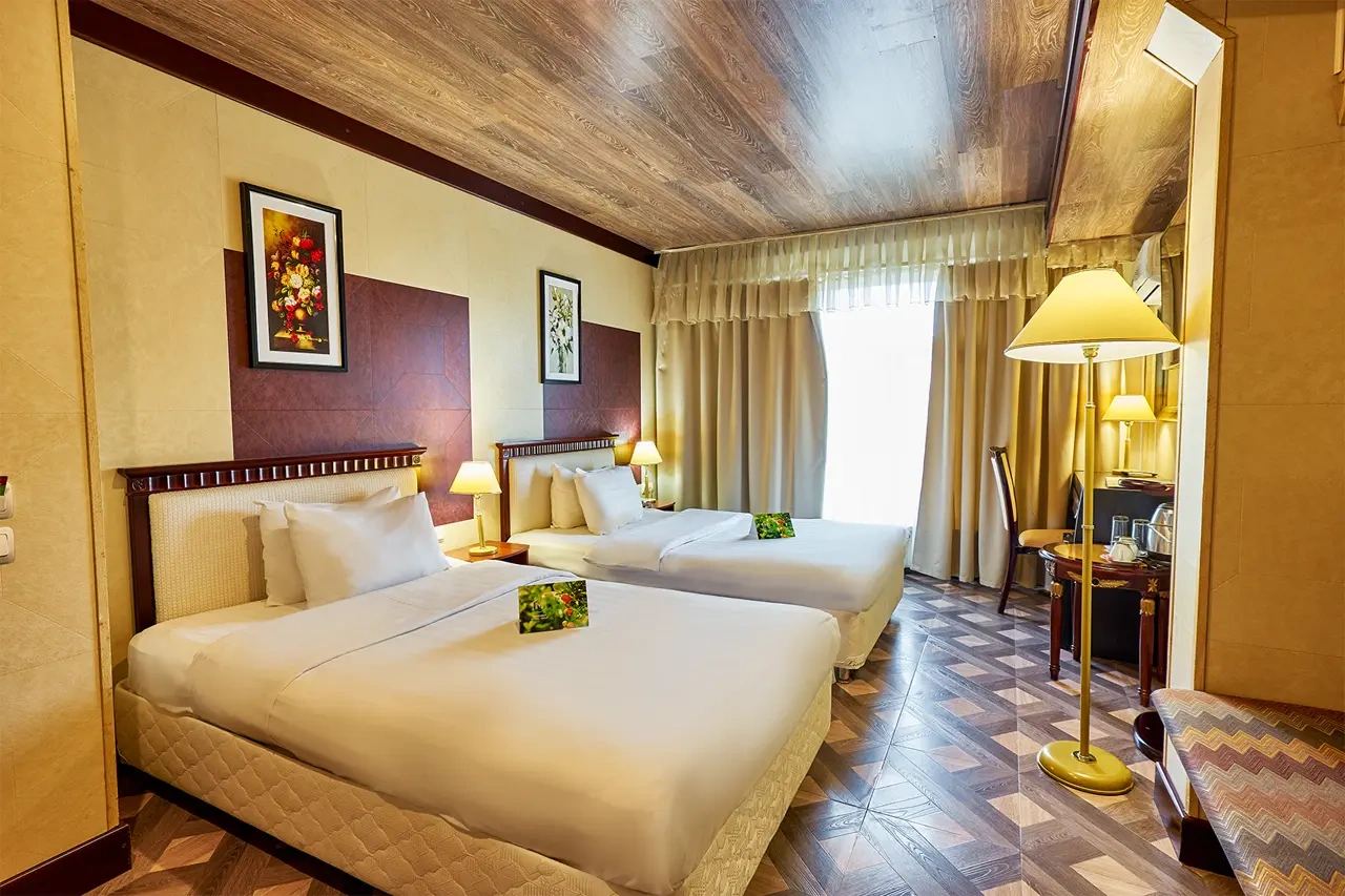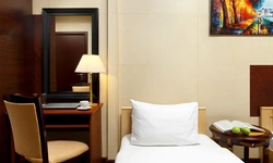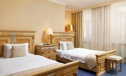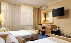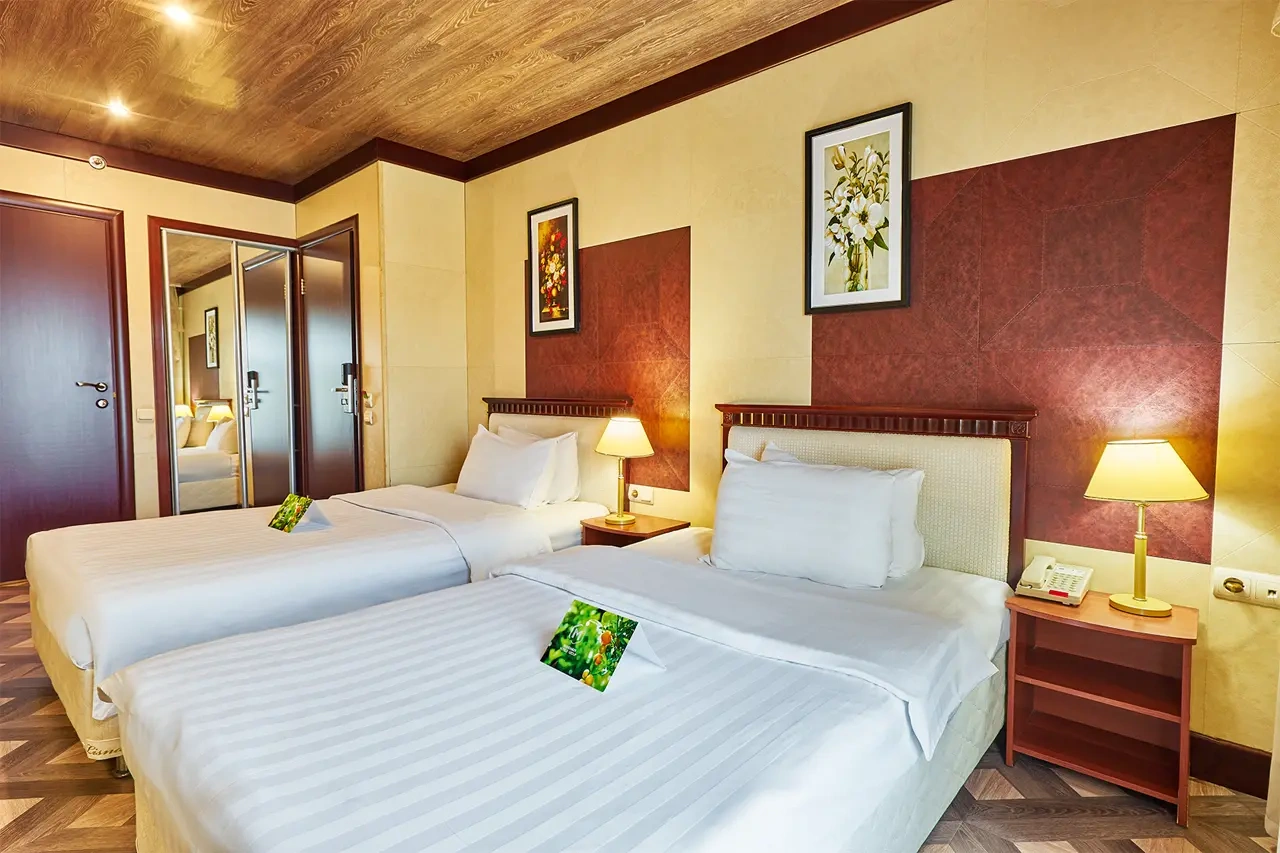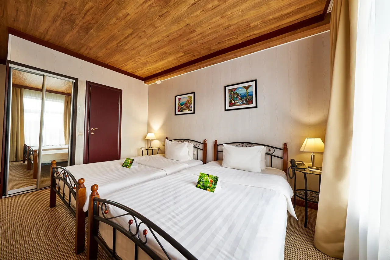Комфортный номер категории «улучшенный» с двумя отдельно стоящими кроватями — отличный вариант для размещения двух человек, прибывших с деловой поездкой или друзей, путешествующих вдвоем. Современный лаконичный дизайн, теплые оттенки, натуральные материалы позволили сделать номер уютным и наполнить его светом. Несмотря на демократичную цену на размещение, номер оснащен по самым высоким стандартам. Ценные вещи и документы можно оставить в сейфе. Номера укомплектованы мини-баром, чайной станцией, телефоном, феном, гладильными принадлежностями и халатами. Ежедневно при жилой уборке происходит пополнение гигиенических принадлежностей, питьевой воды, чая и сахара. Мини-бар не входит в стоимость номера и оплачивается отдельно. Под запрос предоставляются косметический и бритвенный наборы. Окна номера выходят на тихую улицу, внутренний двор и на город, так что можете быть уверены: вашему отдыху не помешает шум.
