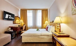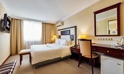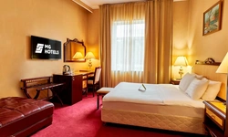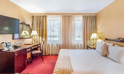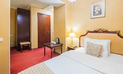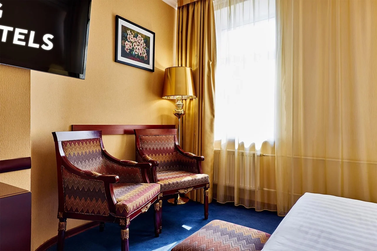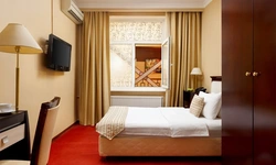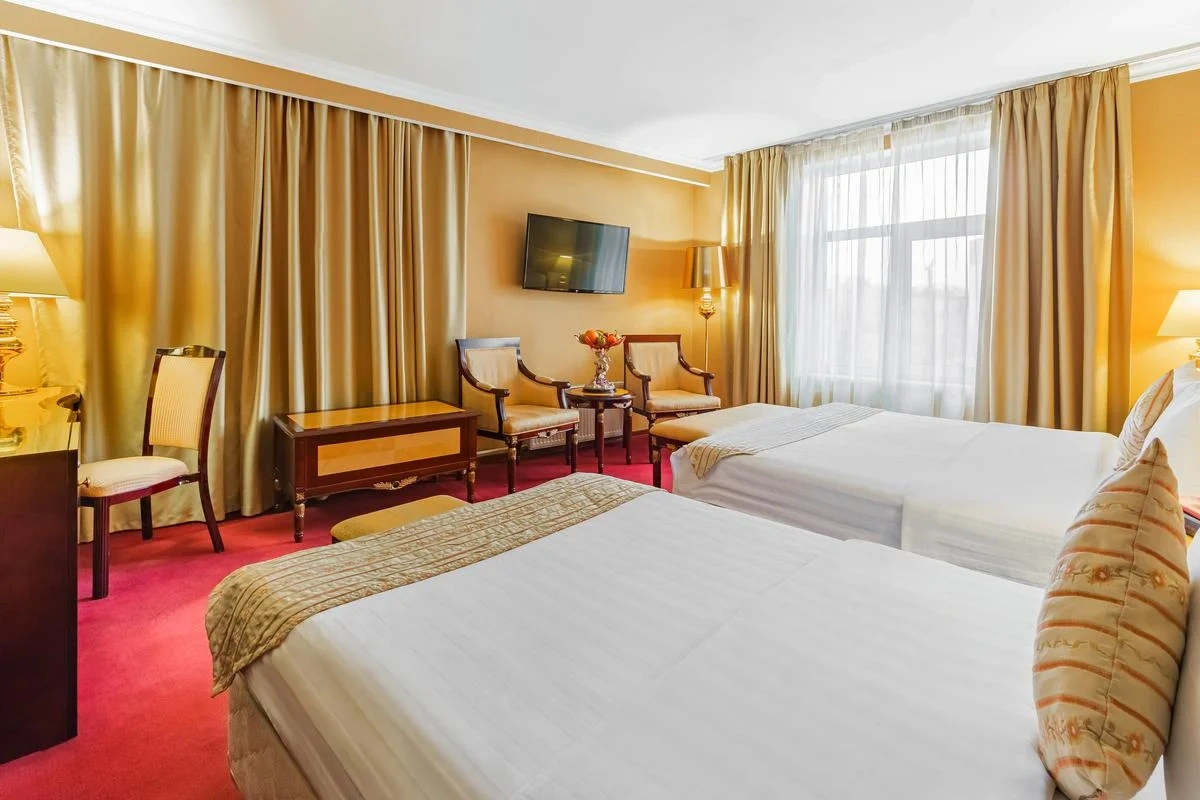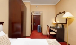 Двухместный номер категории «Стандарт» – прекрасный вариант для деловой поездки или отдыха пары. Небольшой, но очень комфортный номер отличается стильным интерьером в теплых тонах, которые лишь добавляют уюта, расслабляют и настраивают на отдых. Плазменная панель и доступ к интерактивному спутниковому телевидению разнообразят досуг. Если в поездке вам нужно поработать — в вашем распоряжении удобный рабочий стол и высокоскоростной беспроводной интернет. Ценные вещи и документы можно оставить в сейфе. Также номера укомплектованы мини-баром, чайной станцией, телефоном, феном, гладильными принадлежностями. Ежедневно при жилой уборке происходит пополнение гигиенических принадлежностей, питьевой воды, чая и сахара. Мини-бар не входит в стоимость номера и оплачивается отдельно. Под запрос предоставляются халаты, косметический и бритвенный наборы. Окна номера выходят на тихую улицу, внутренний двор и на город, так что можете быть уверены: вашему отдыху не помешает шум.