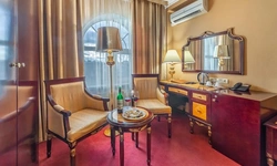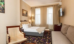 Просторный номер категории «Студио» – оптимальный вариант для романтического отдыха вдвоем или деловой поездки и встреч с партнерами. Интерьер номера тщательно продуман — теплые оттенки, в которых он выдержан, расслабляют, а изысканная мебель из ценных пород дерева и натуральной кожи придает номеру солидность. Широкая двухместная кровать размера «King size» с ортопедическим матрацем гарантирует сладкий сон. Ценные вещи и документы можно оставить в сейфе. Номера укомплектованы мини-баром, чайной станцией, телефоном, феном, гладильными принадлежностями и халатами. Ежедневно при жилой уборке происходит пополнение гигиенических принадлежностей, питьевой воды, чая и сахара. Мини-бар не входит в стоимость номера и оплачивается отдельно. Под запрос предоставляются косметический и бритвенный наборы. Окна номера выходят на тихую улицу, внутренний двор и на город, так что можете быть уверены: вашему отдыху не помешает шум.