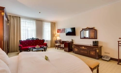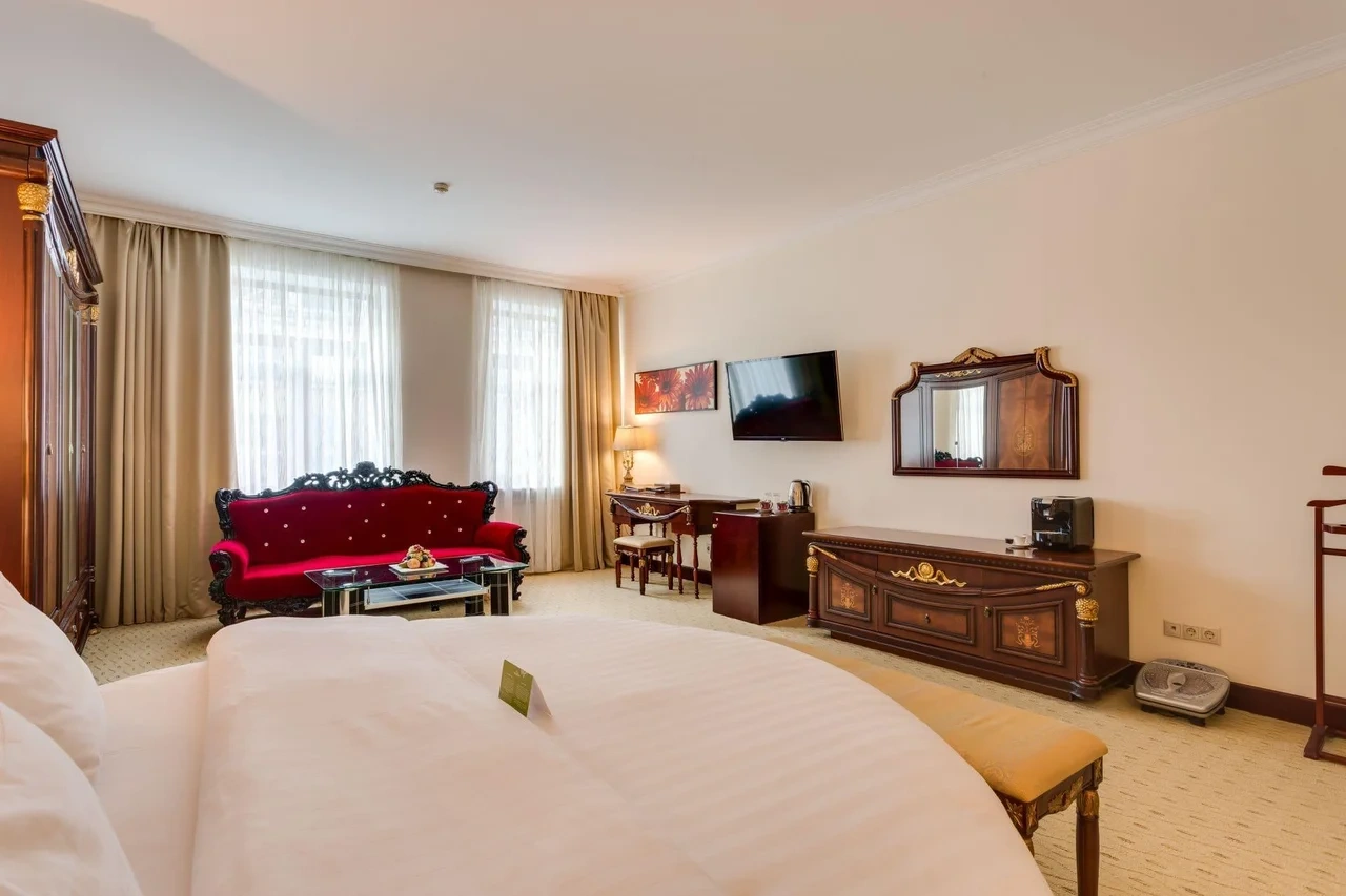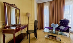 Превосходные Люксы с высокими потолками и великолепными видами. Мебель, текстиль, техника и атрибуты декора, кроме создания комфорта, служат представительским целям. Каждая деталь номера заявляет о высоком статусе гостя, который здесь остановился. Тип кровати: King Size