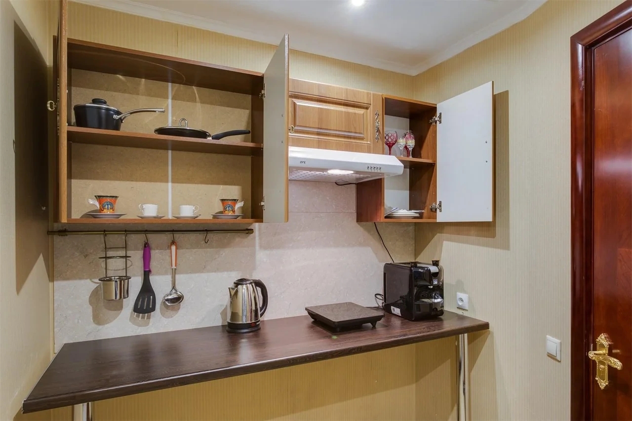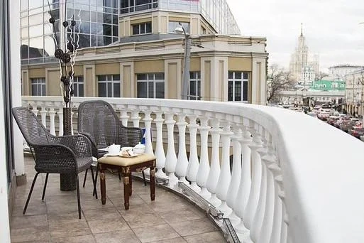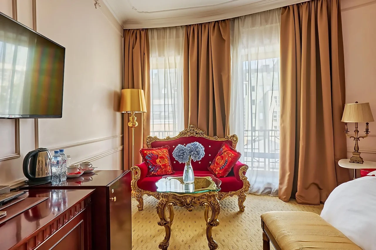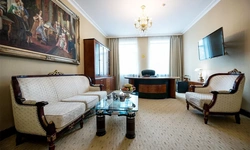 Один из лучших апартаментов Москвы. Номер с видом на Николоямскую улицу украшен хрустальными люстрами, резными орнаментами, антикварной мебелью. В апартаментах имеются 2 спальни, гостиная-кабинет, мини-кухня, ванная комната с гидромассажной ванной-джакузи, 2 раковины, дополнительный гостевой туалет. Идеальный вариант для длительного семейного проживания. Типы кроватей: King Size + 2 Queen Size. Возможна установка дополнительных спальных мест.