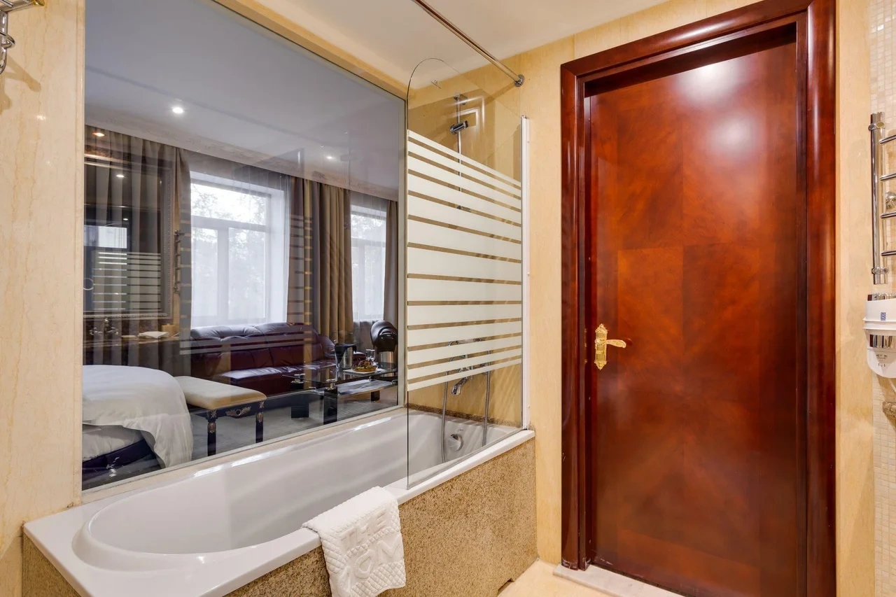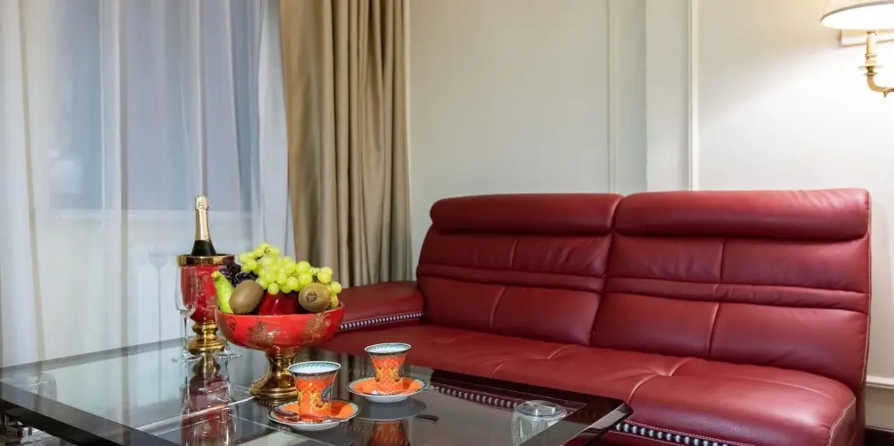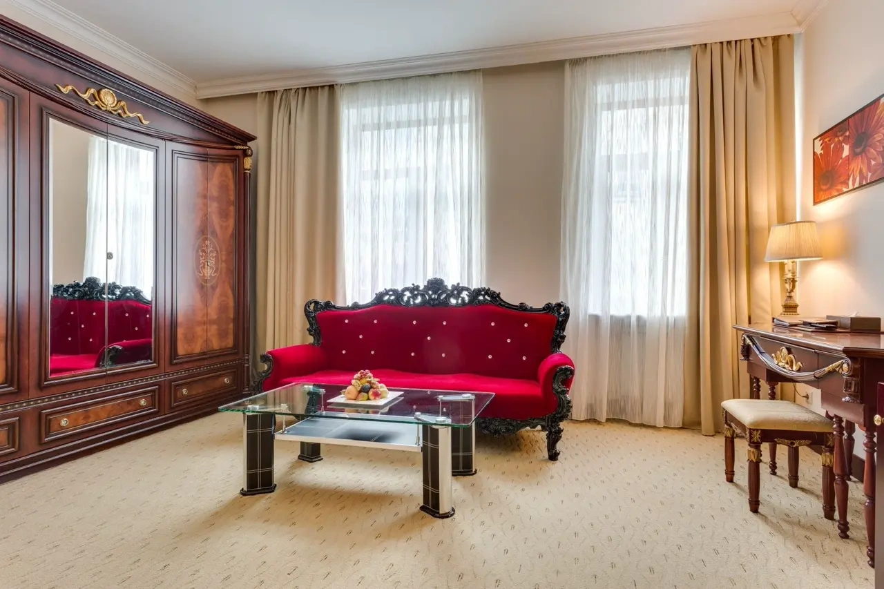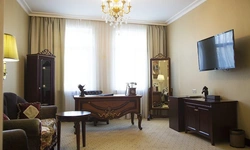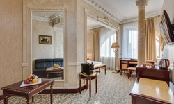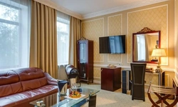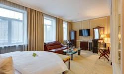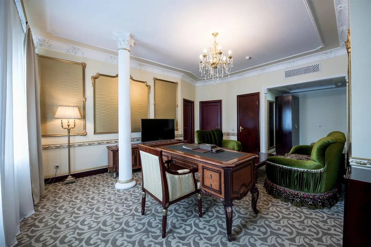 Великолепные апартаменты общей площадью до 60 квадратных метров представлены в классическом дизайне. Пространство гостиной удачно разделено на комфортную зону отдыха и рабочий кабинет. Для Вашего безупречного отдыха номер располагает спальней с двумя двуспальными кроватями, просторной гостиной, удобной рабочей зоной, ванной комнатой с ванной, биде и двумя раковинами, и видом на Николоямскую улицу. Идеальный вариант для длительного семейного проживания. Типы кроватей: две кровати King Size. Возможно установка дополнительных спальных мест