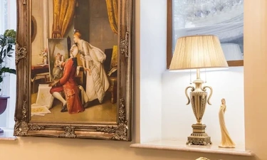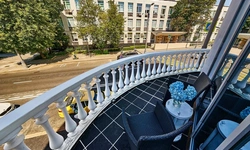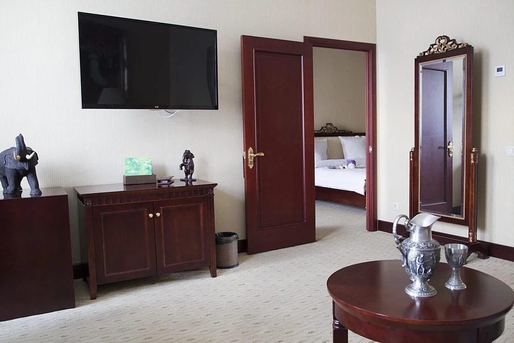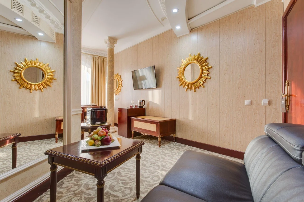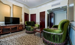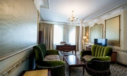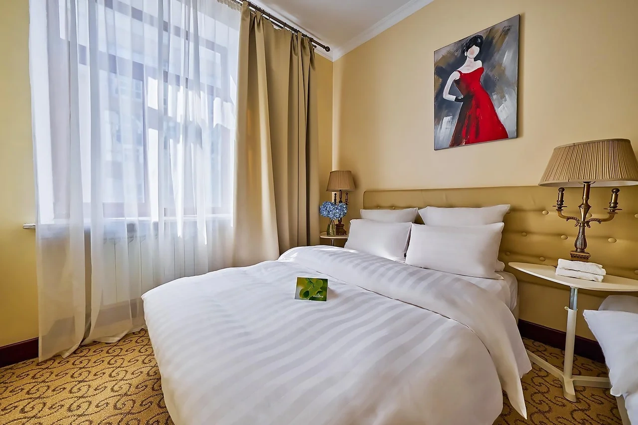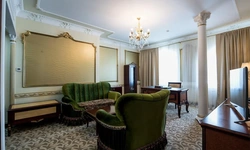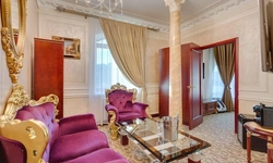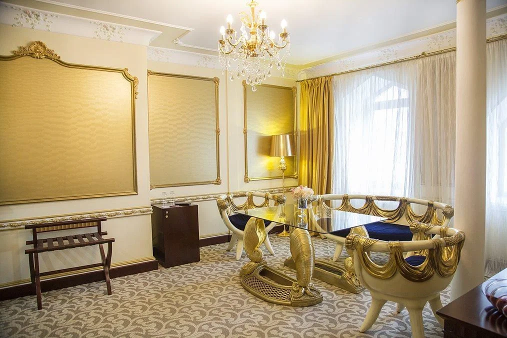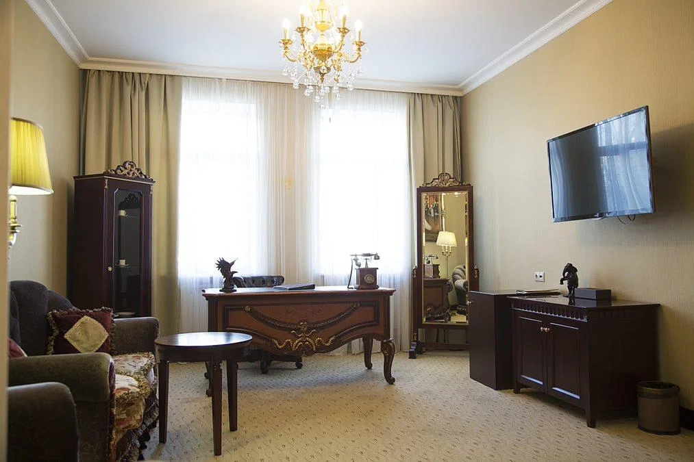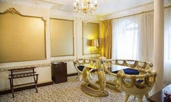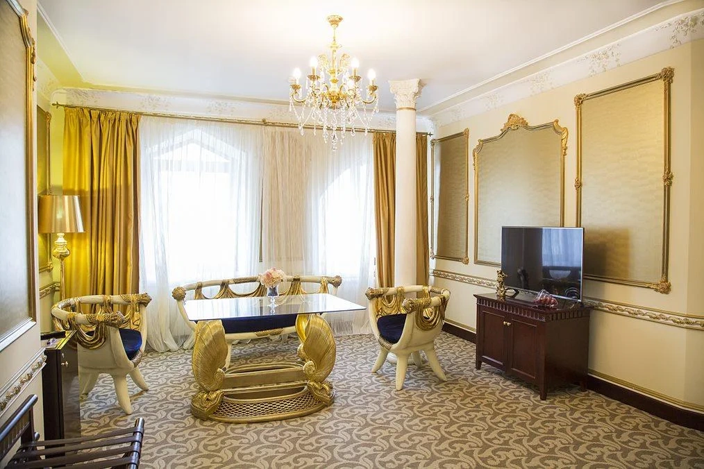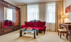 Один из лучших апартаментов Москвы. Номер с видом на Николоямскую улицу украшен хрустальными люстрами, резными орнаментами, антикварной мебелью. В апартаментах имеются 2 спальни, гостиная-кабинет, мини-кухня, ванная комната с гидромассажной ванной-джакузи, 2 раковины, дополнительный гостевой туалет. Идеальный вариант для длительного семейного проживания. Типы кроватей: King Size + 2 Queen Size. Возможна установка дополнительных спальных мест.