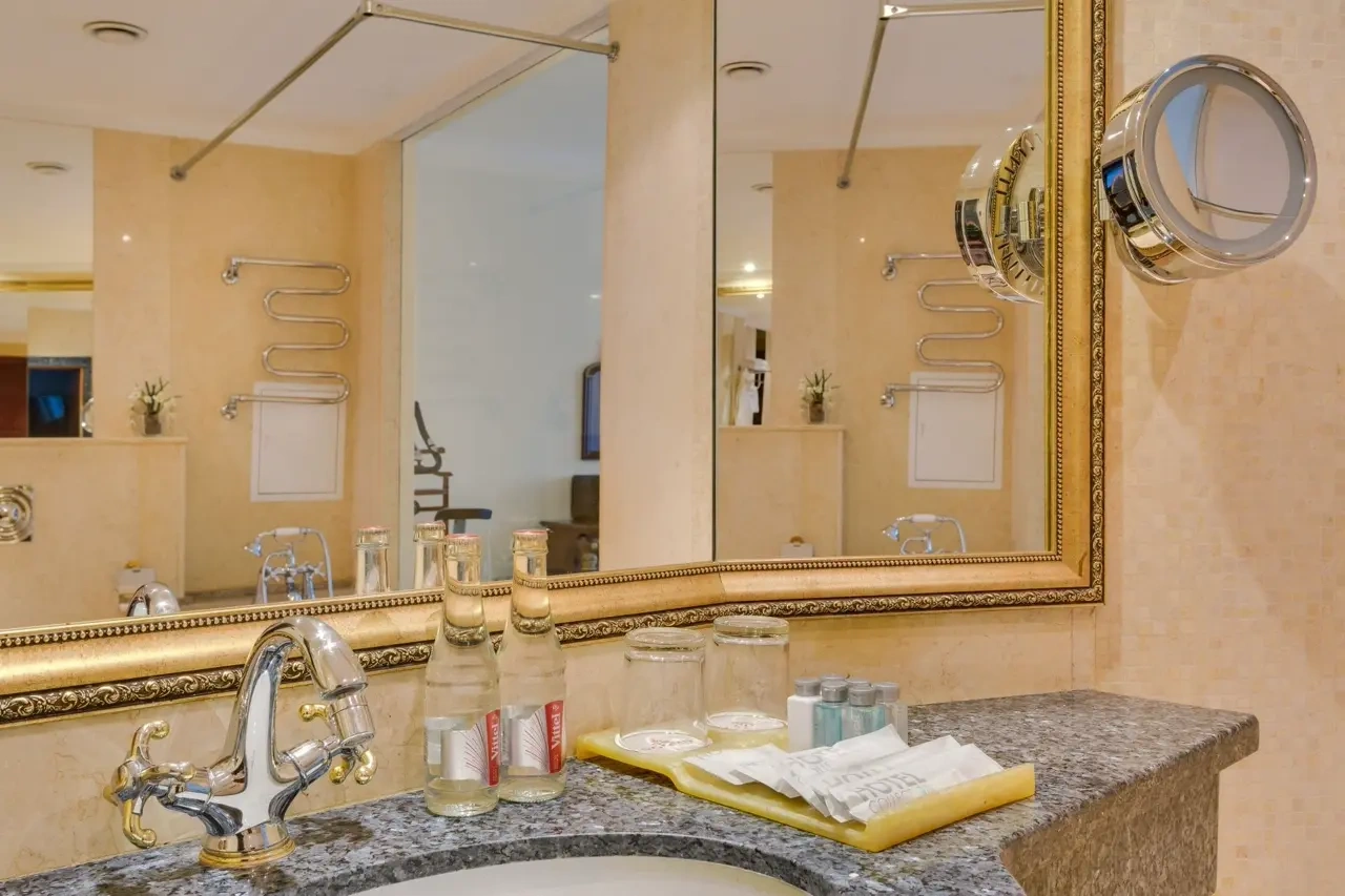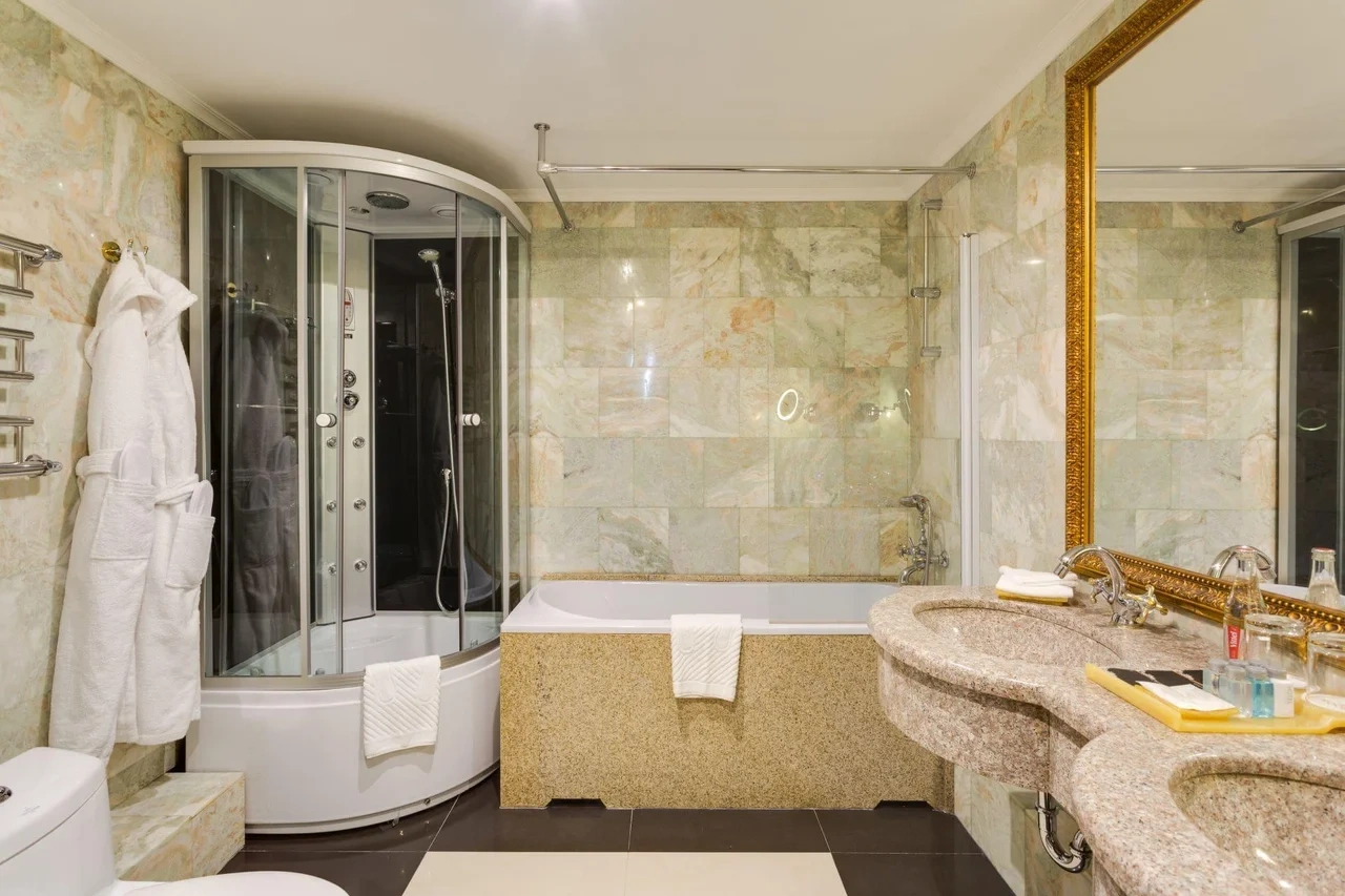 Насладитесь панорамным видом из великолепных номеров «Делюкс с балконом». В номере имеется спальня, гостиная зона, просторный рабочий стол, ванная комната с отделкой из итальянского мрамора с душевой кабиной либо ванной. Тип кровати: круглая.