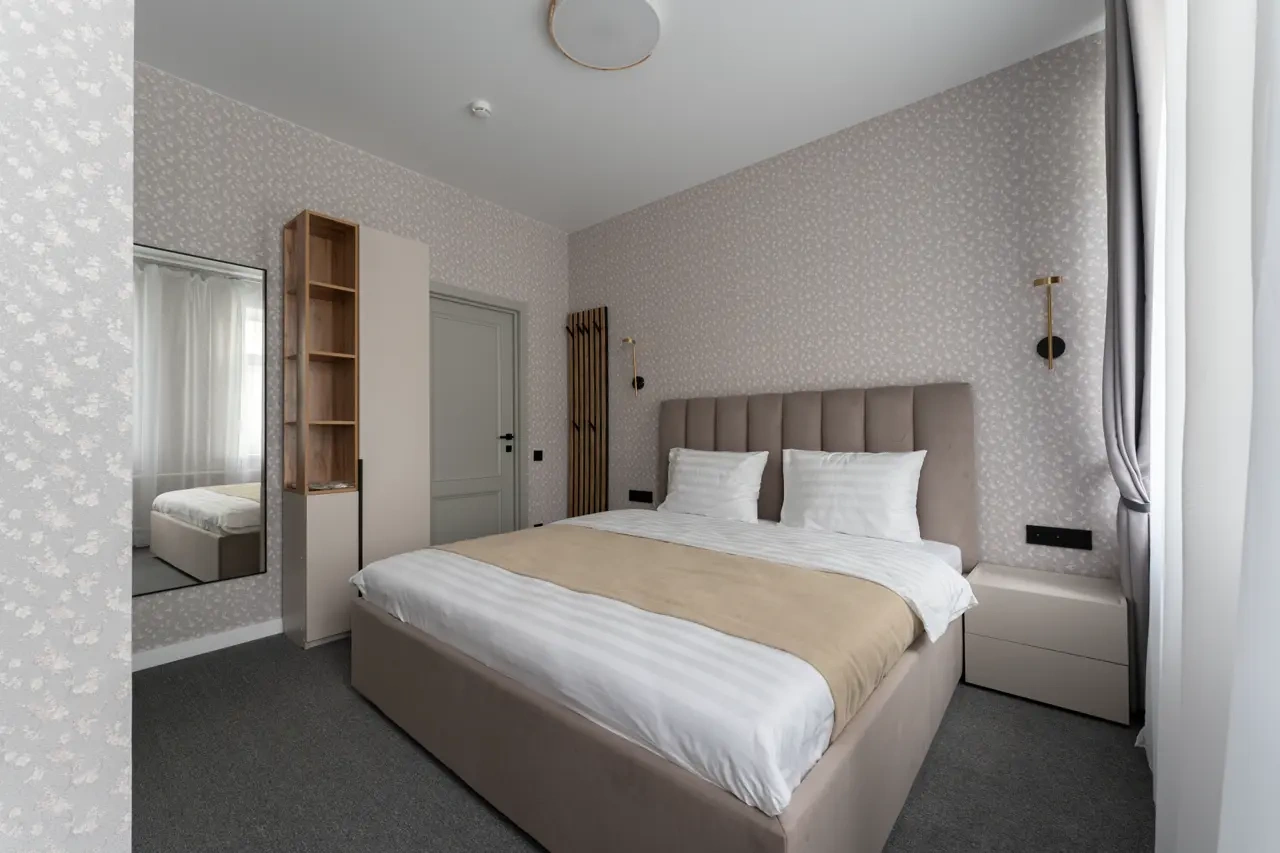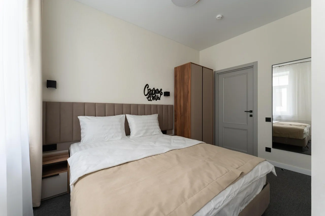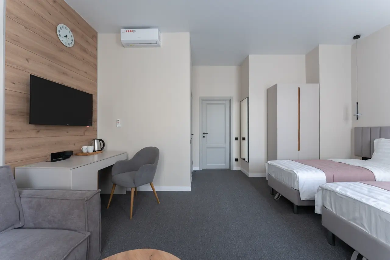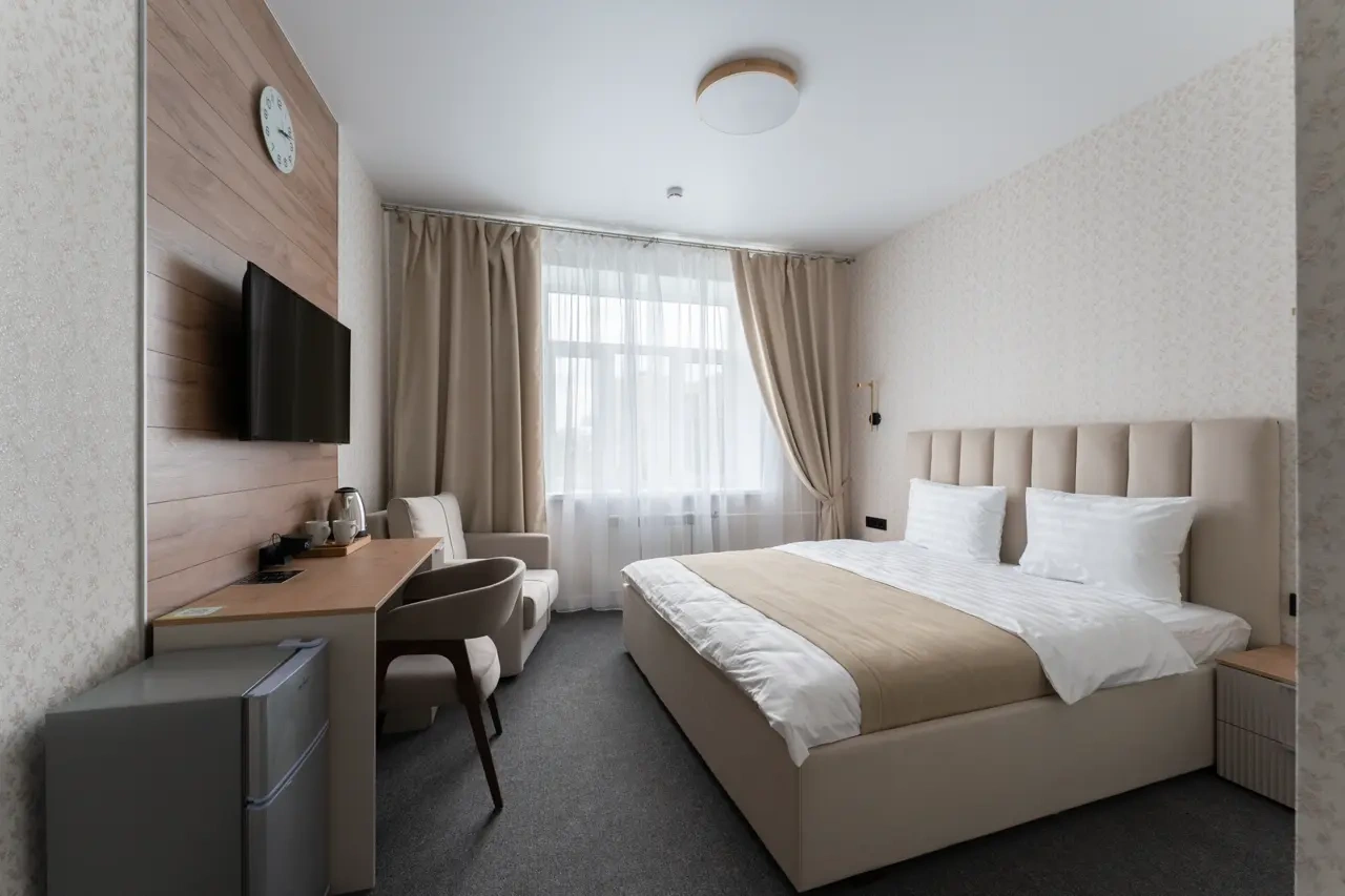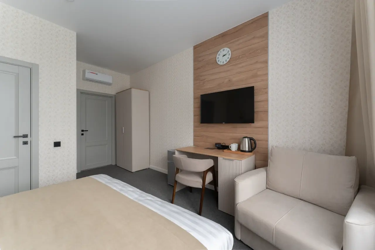 Номер с одной большой или двумя раздельными кроватями на выбор гостя. Оснащен Яндекс станцией Алиса, TV управляемое Алисой, wi-fi, сплит система, холодильник, гардеробный шкаф, письменный стол, душевая комната, приборы гигиенической косметики. Белье премиального качества