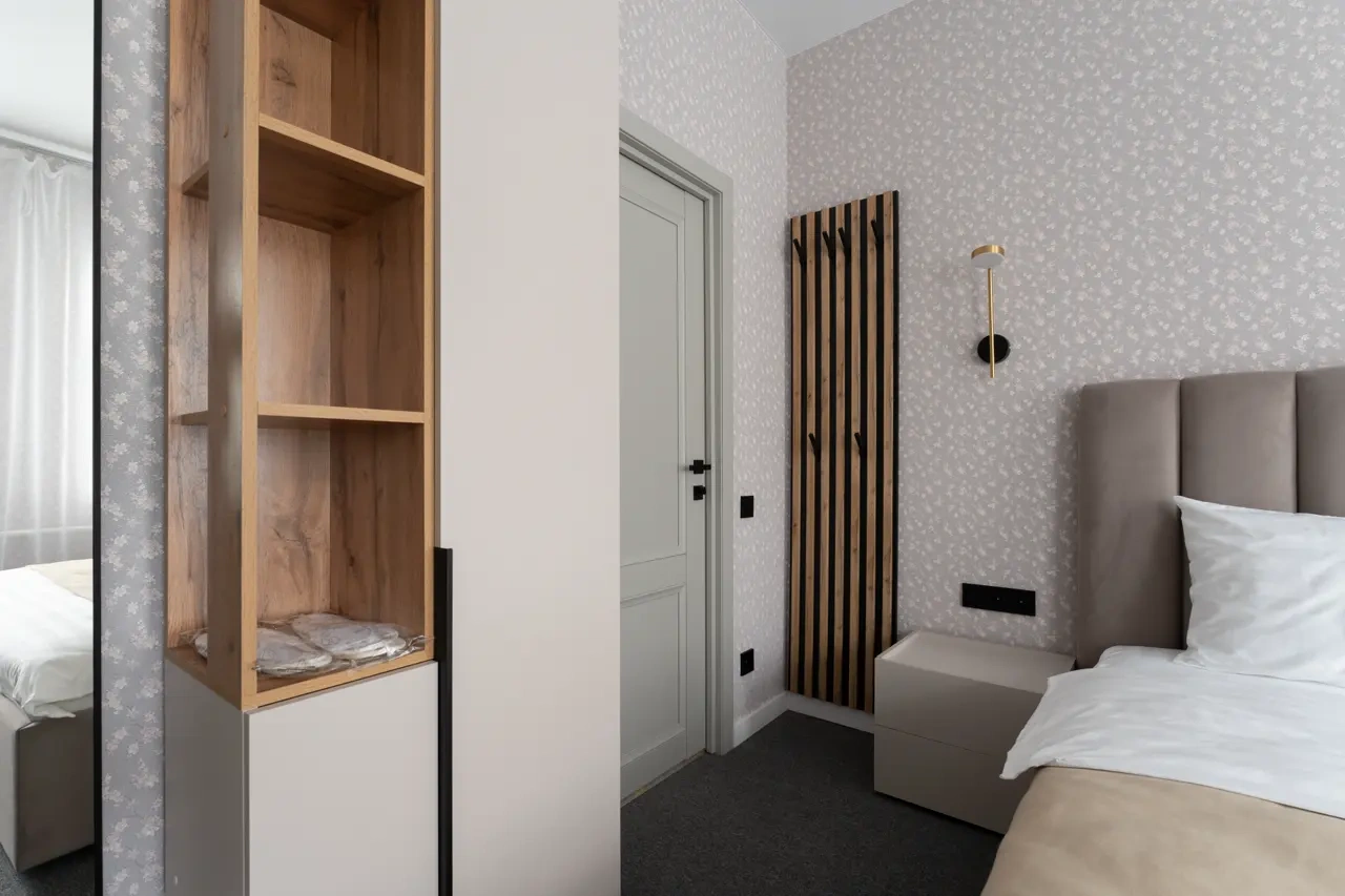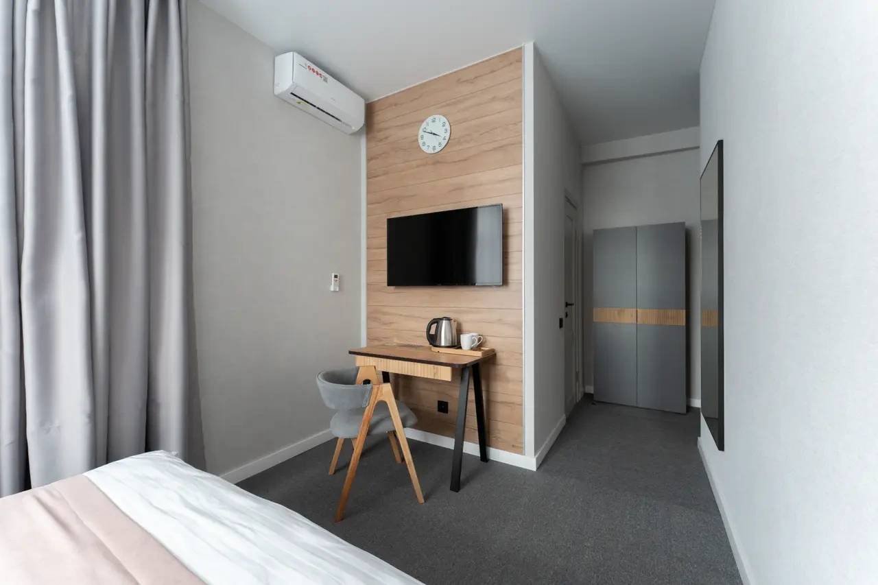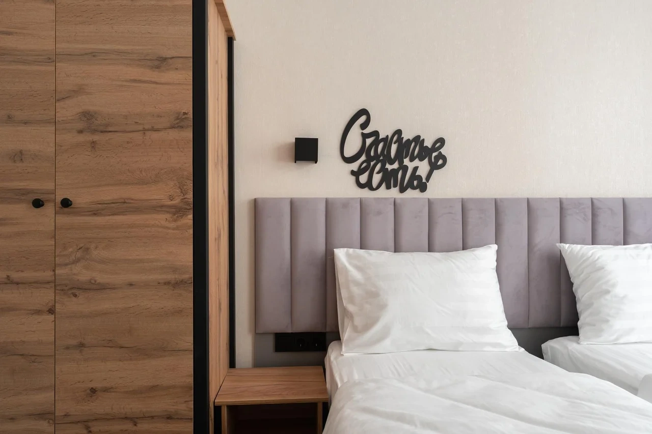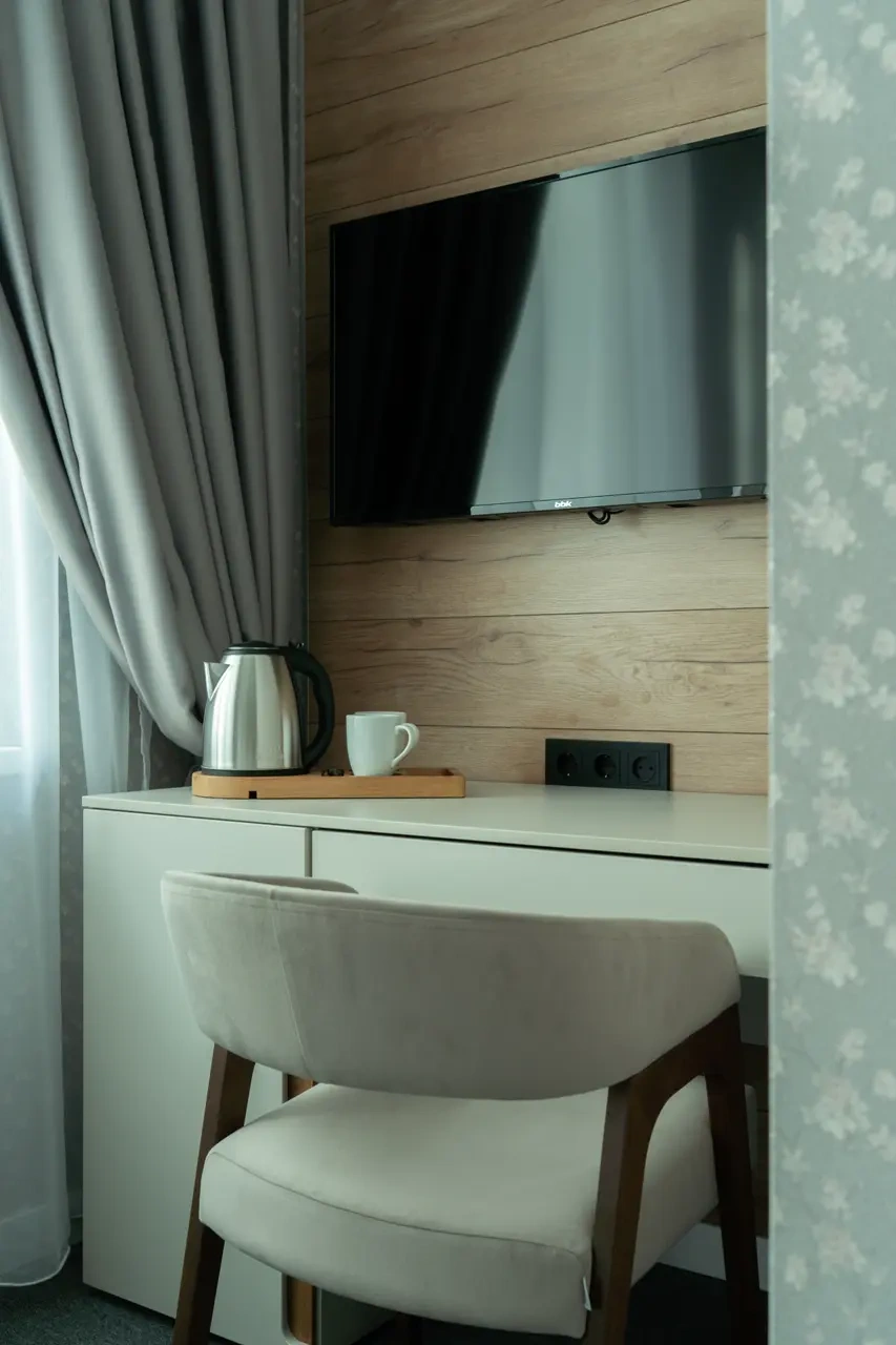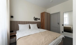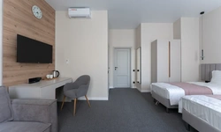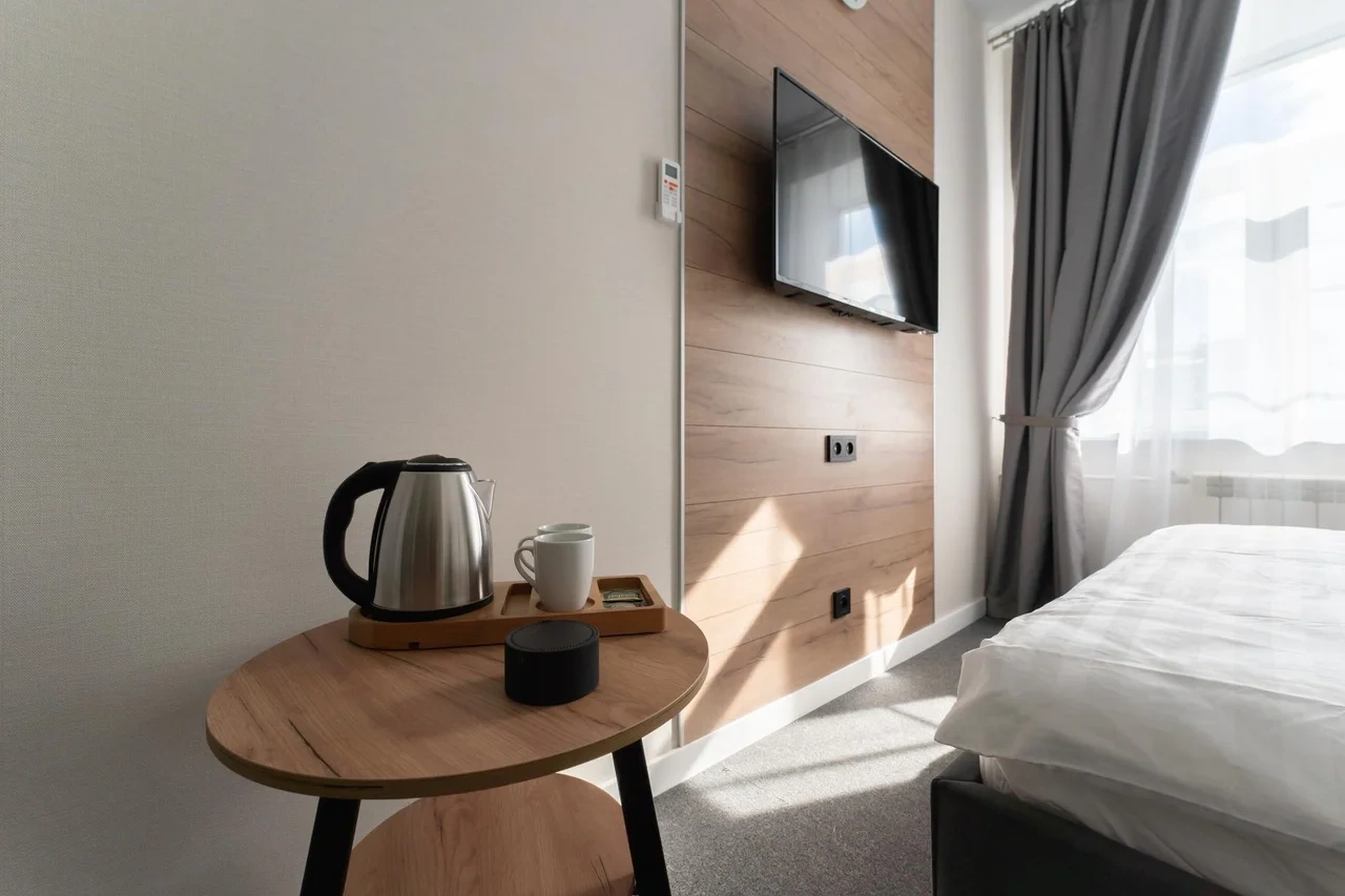 Номер с одной большой или двумя раздельными кроватями на выбор гостя. Оснащен Яндекс станцией Алиса, TV управляемое Алисой, wi-fi, сплит система, холодильник, гардеробный шкаф, письменный стол, душевая комната, приборы гигиенической косметики. Белье премиального качества